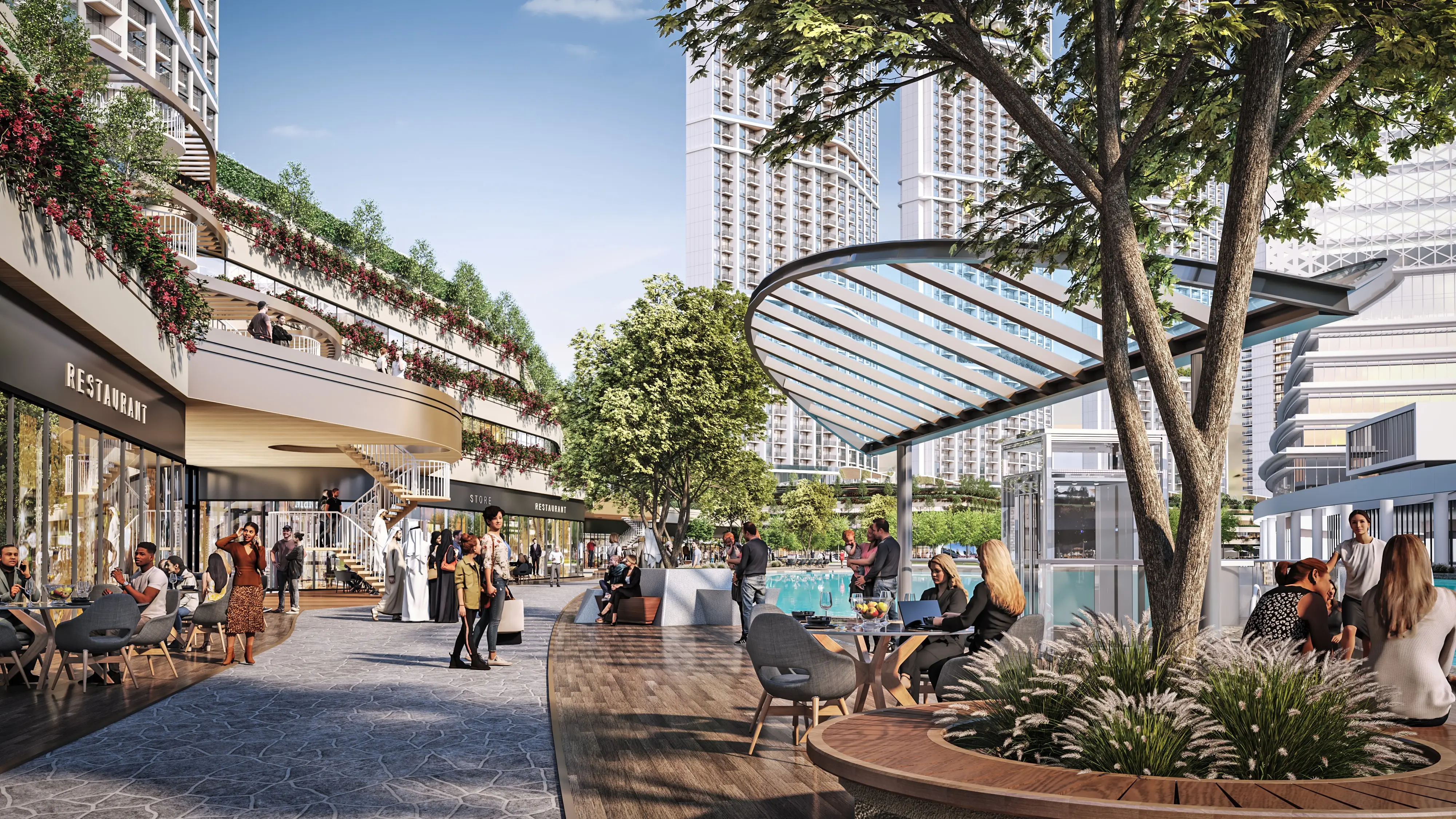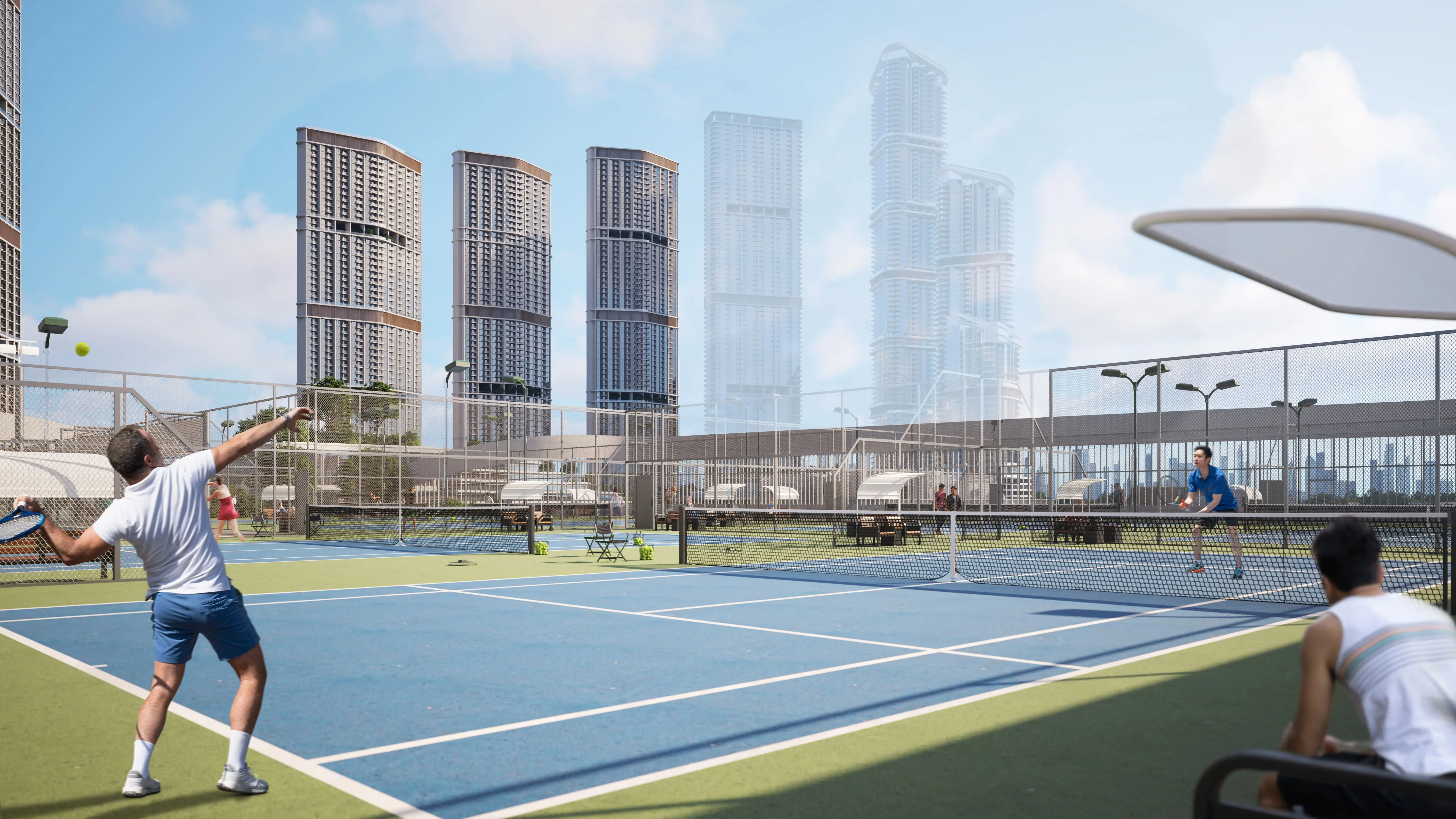 Tennis court 310 Riverside Crescent is an ultra-modern residential tower by Sobha Realty, located in Sobha Hartland 2. The building consists of two basement levels, a ground floor, five podiums, sixty-six residential levels, and a roof. The complex ensures comfort and a high standard of living. The exterior and interior are meticulously designed, with landscaped gardens and green spaces creating a tranquil ambiance.