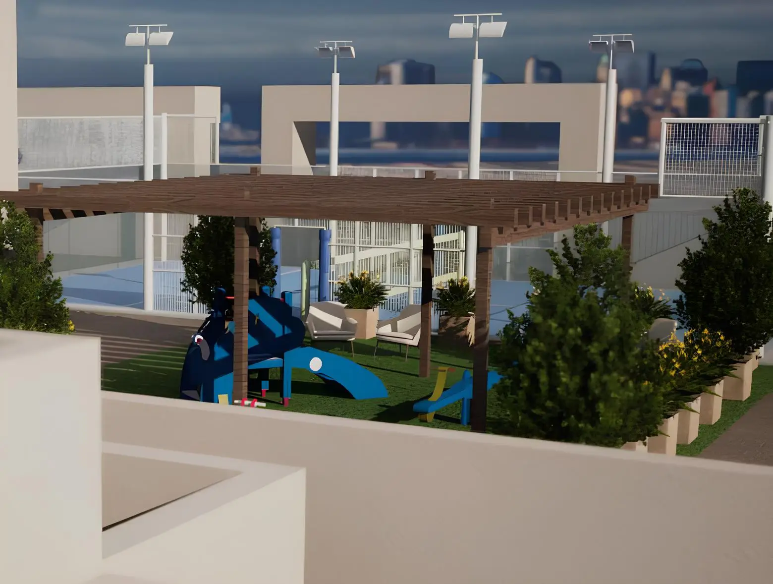 The roof garden is a feature of the internal infrastructure of the complex.