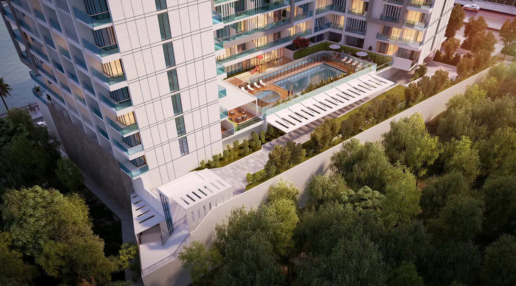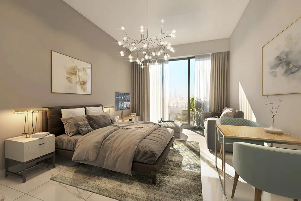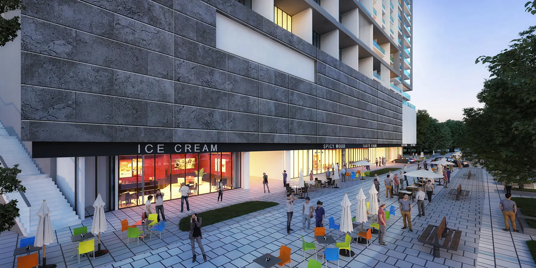 The complex offers studios, 1-3 bedroom apartments and penthouses. The interiors are made in a modern style, using quality materials. The apartments have balconies, built-in kitchen appliances, central air conditioning, satellite TV and high-speed internet.