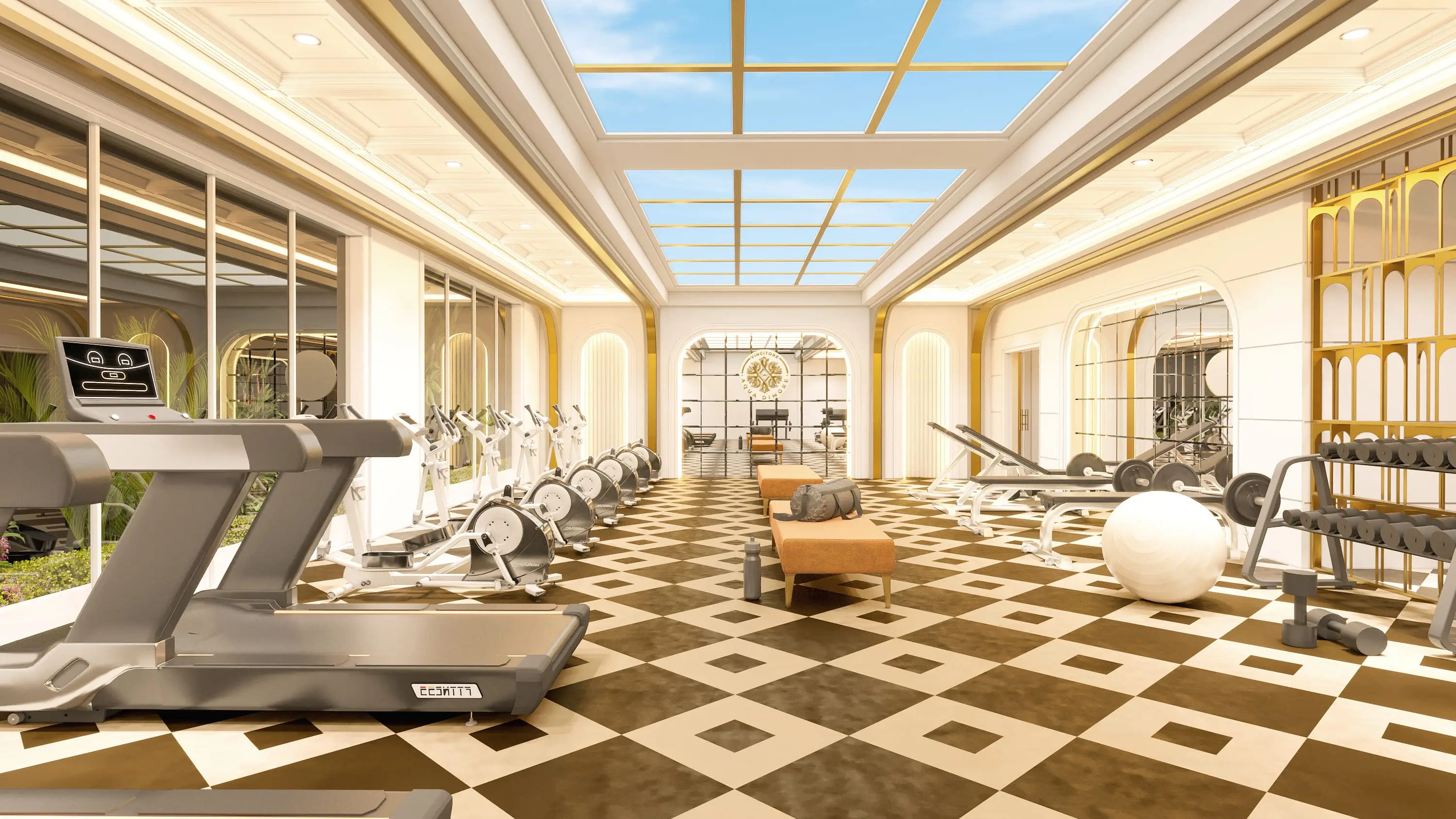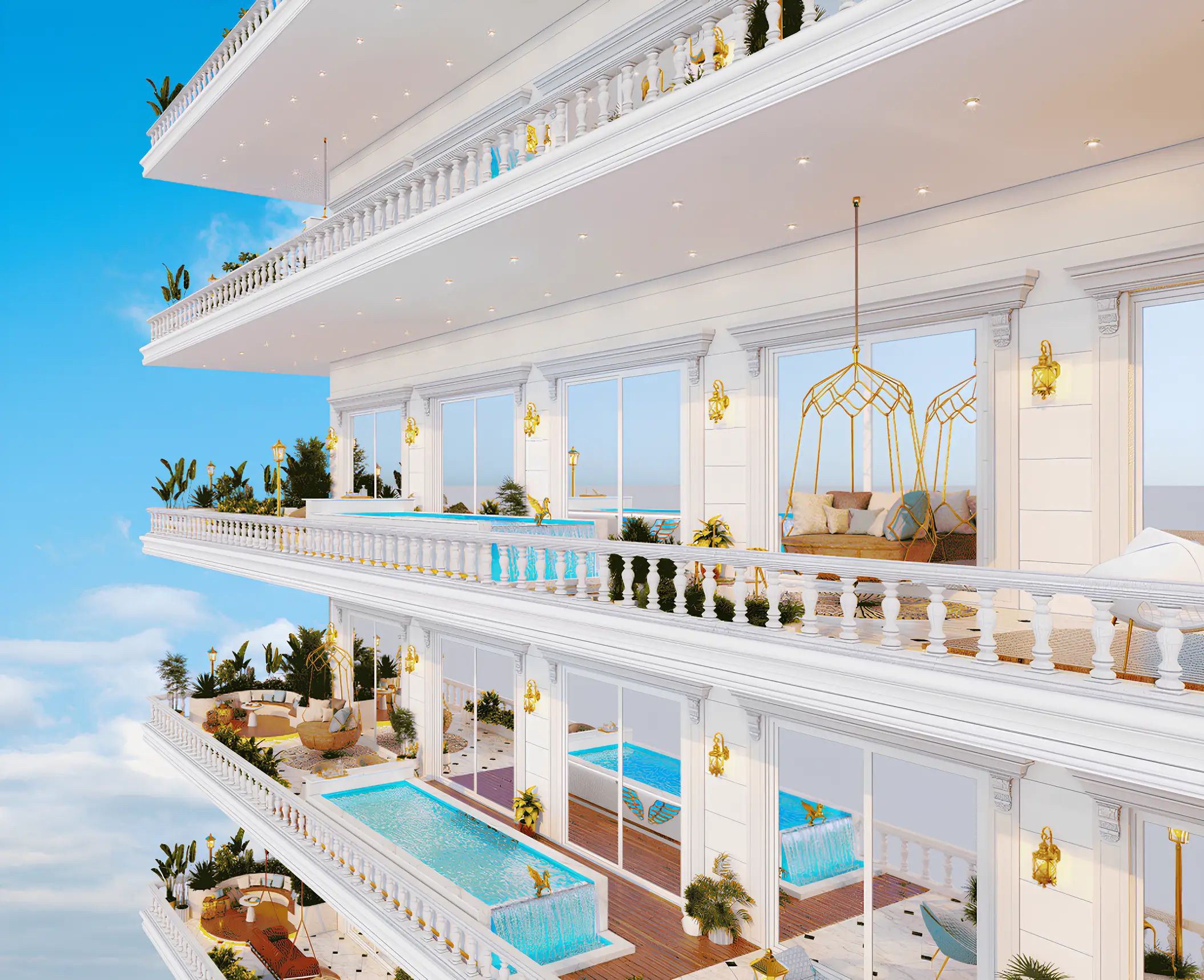 Yoga studio Aqua Dimore - a luxury 20-storey project by Vincitore, located at Dubai Science Park in Al Barsha. The facade and interior design is inspired by the Victorian era, creating an elegant yet cozy atmosphere for living. For sale are premium apartments with 1-3 bedrooms and private pools on the balcony/terrace.