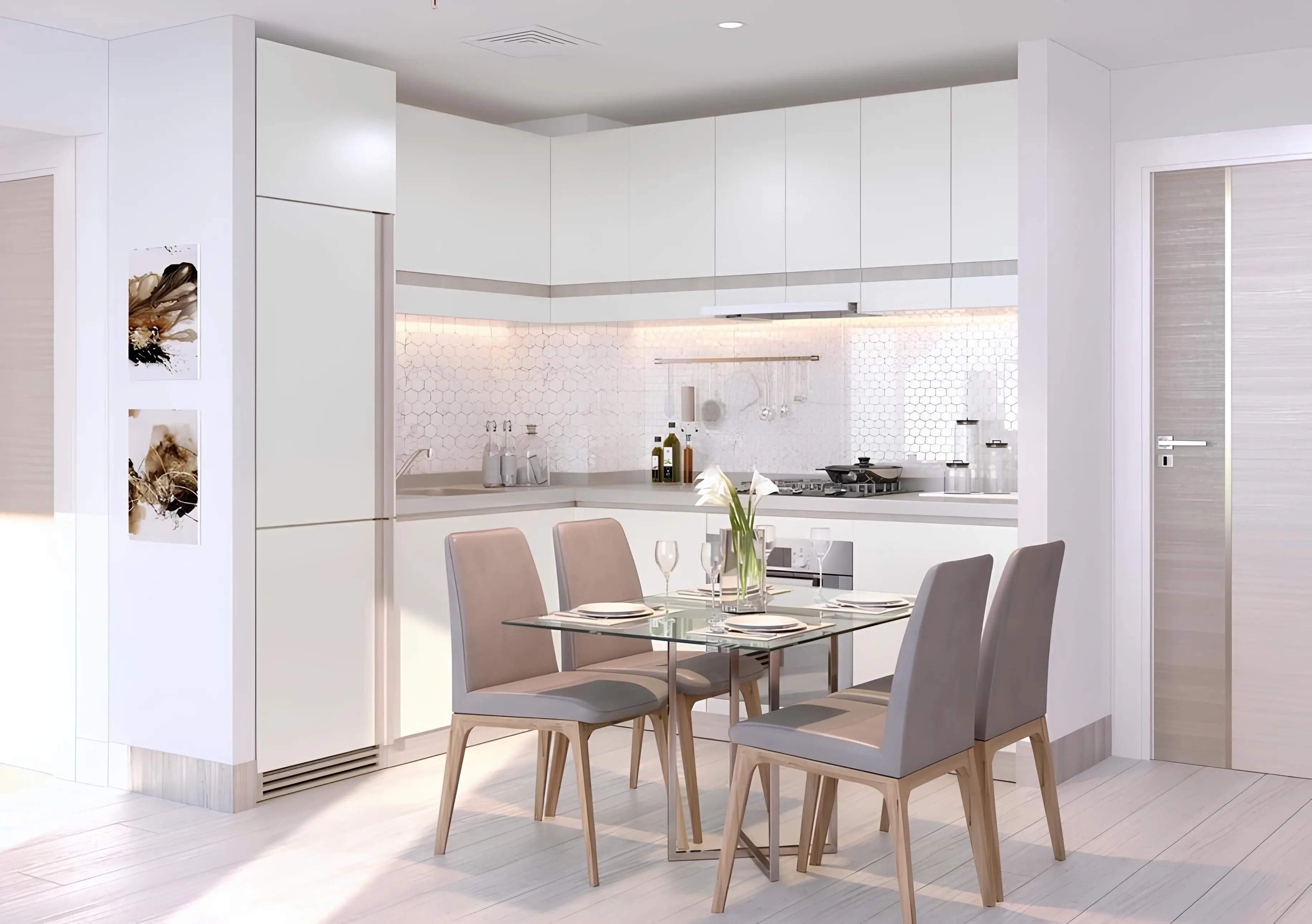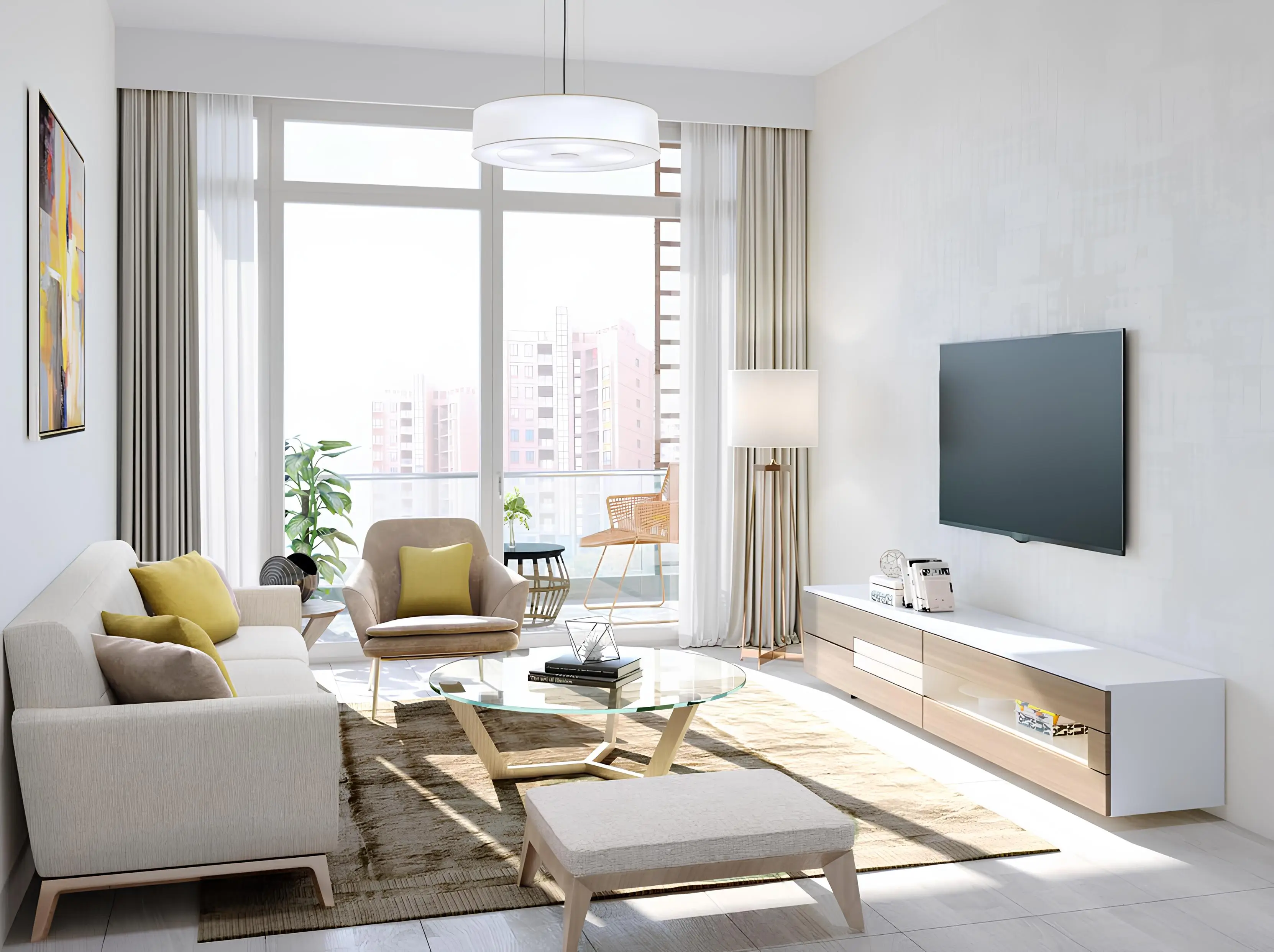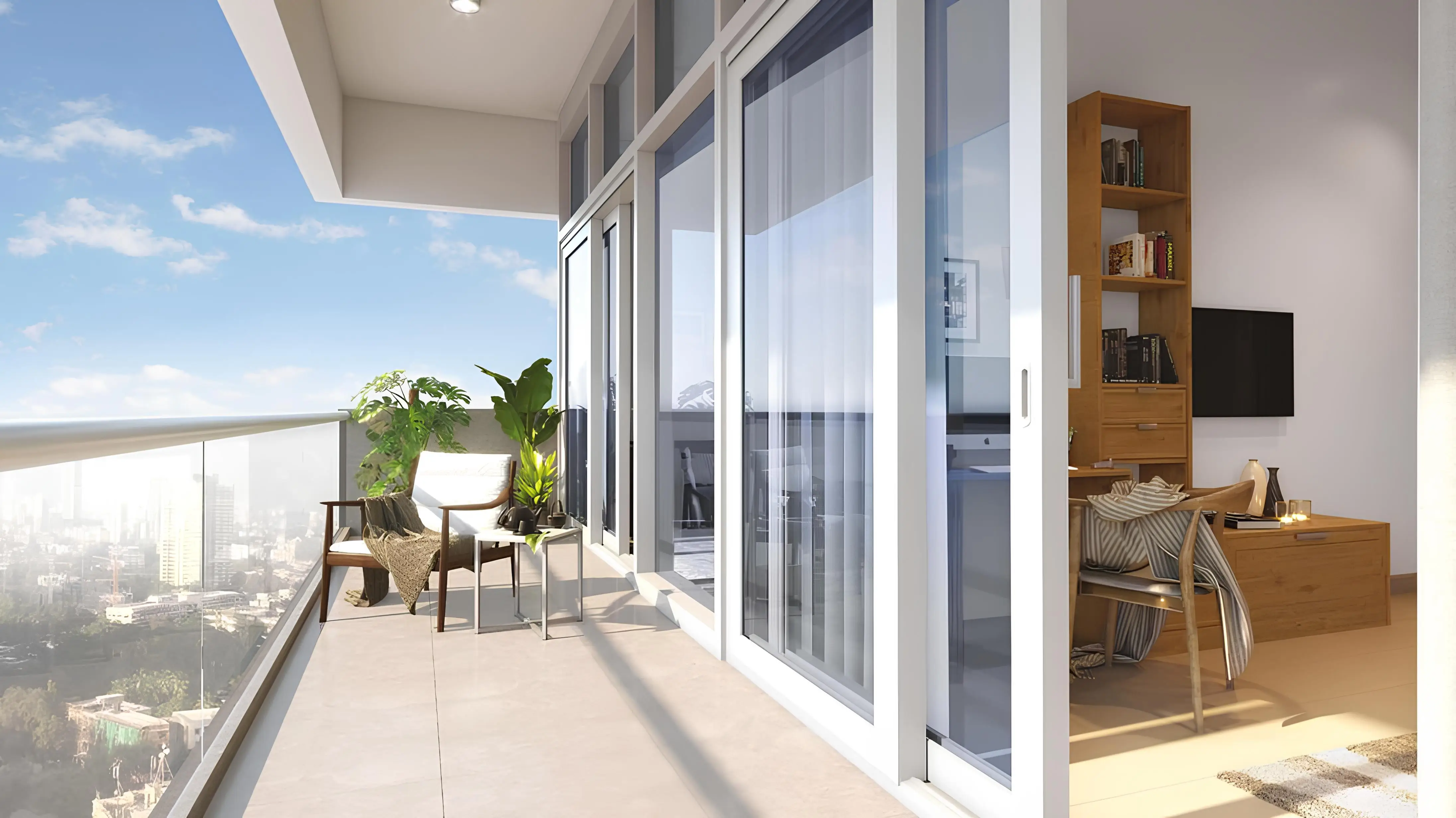 The building consists of a basement level, a ground floor, three podium levels, and fourteen residential floors. The project offers studios and one- and two-bedroom apartments. All residences feature ergonomic layouts, open-plan kitchens, and full-length balconies. Interiors are finished in a light neutral palette with high-quality materials, while floor-to-ceiling windows fill the spaces with natural light and offer views of the city and surrounding greenery.