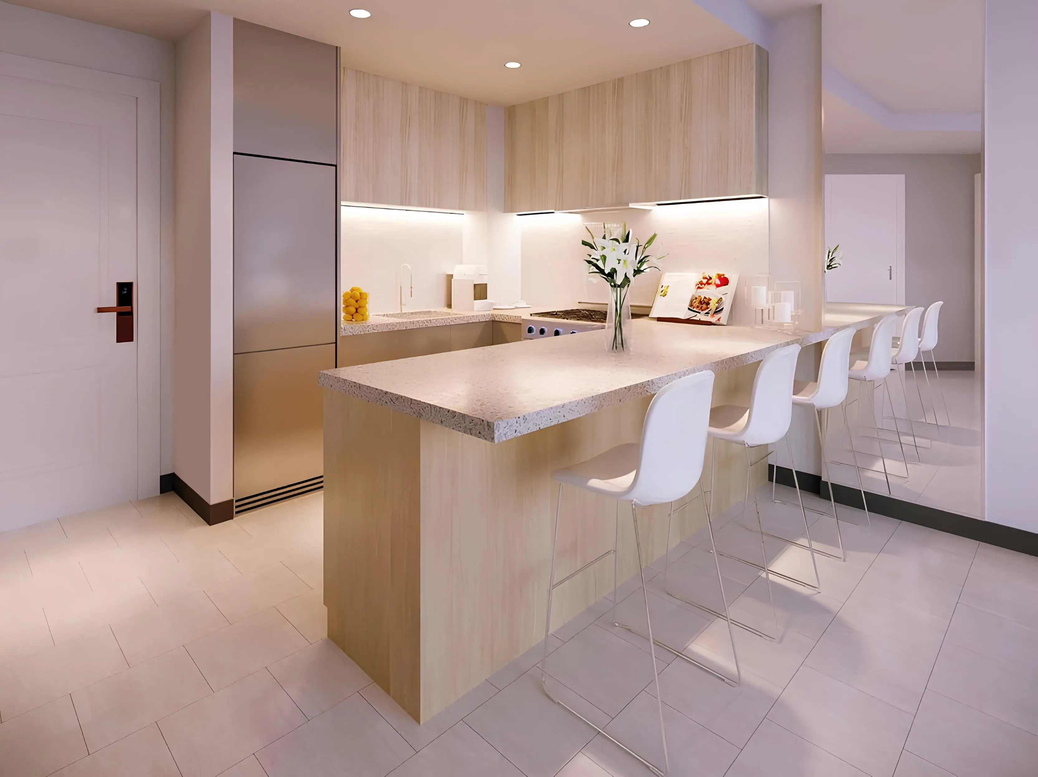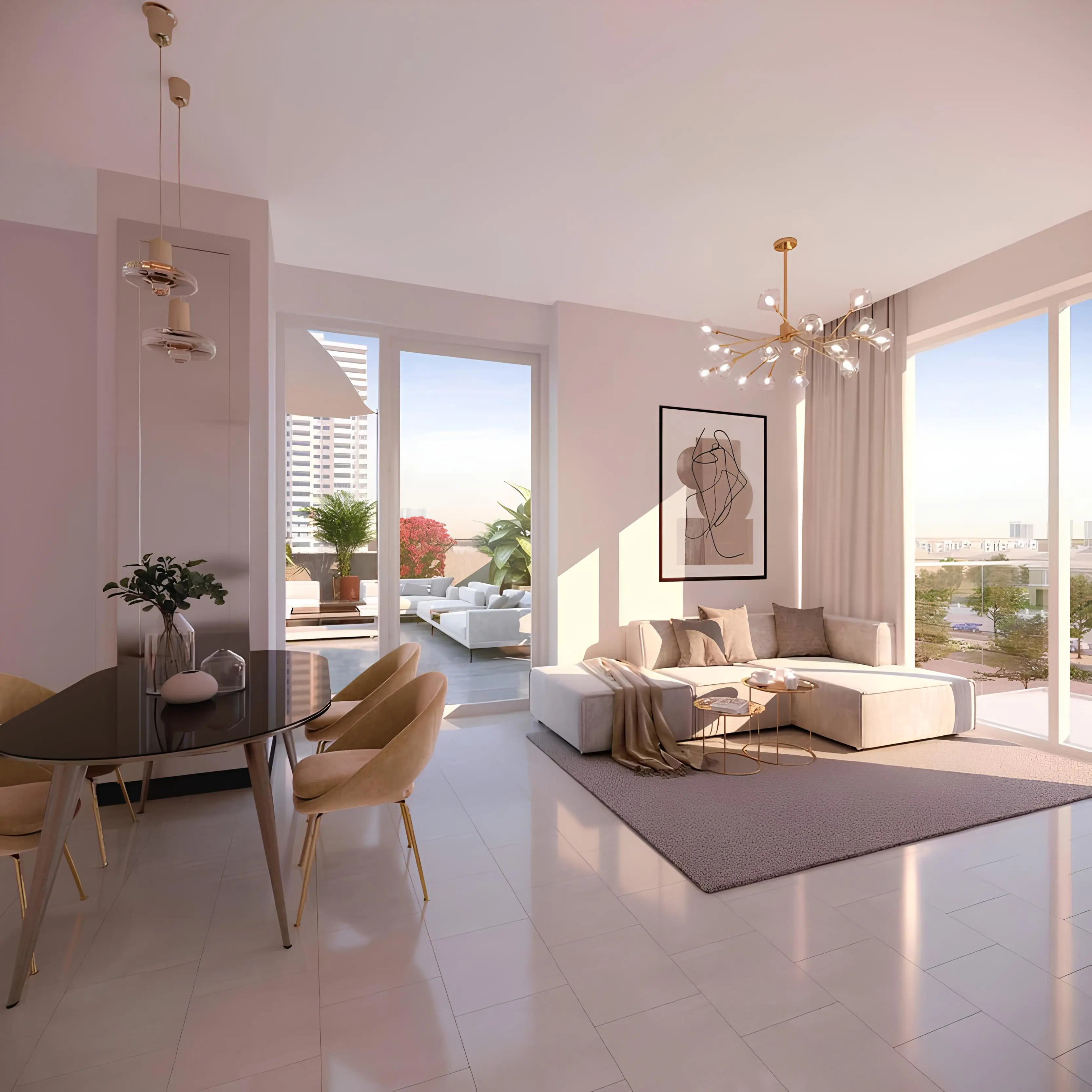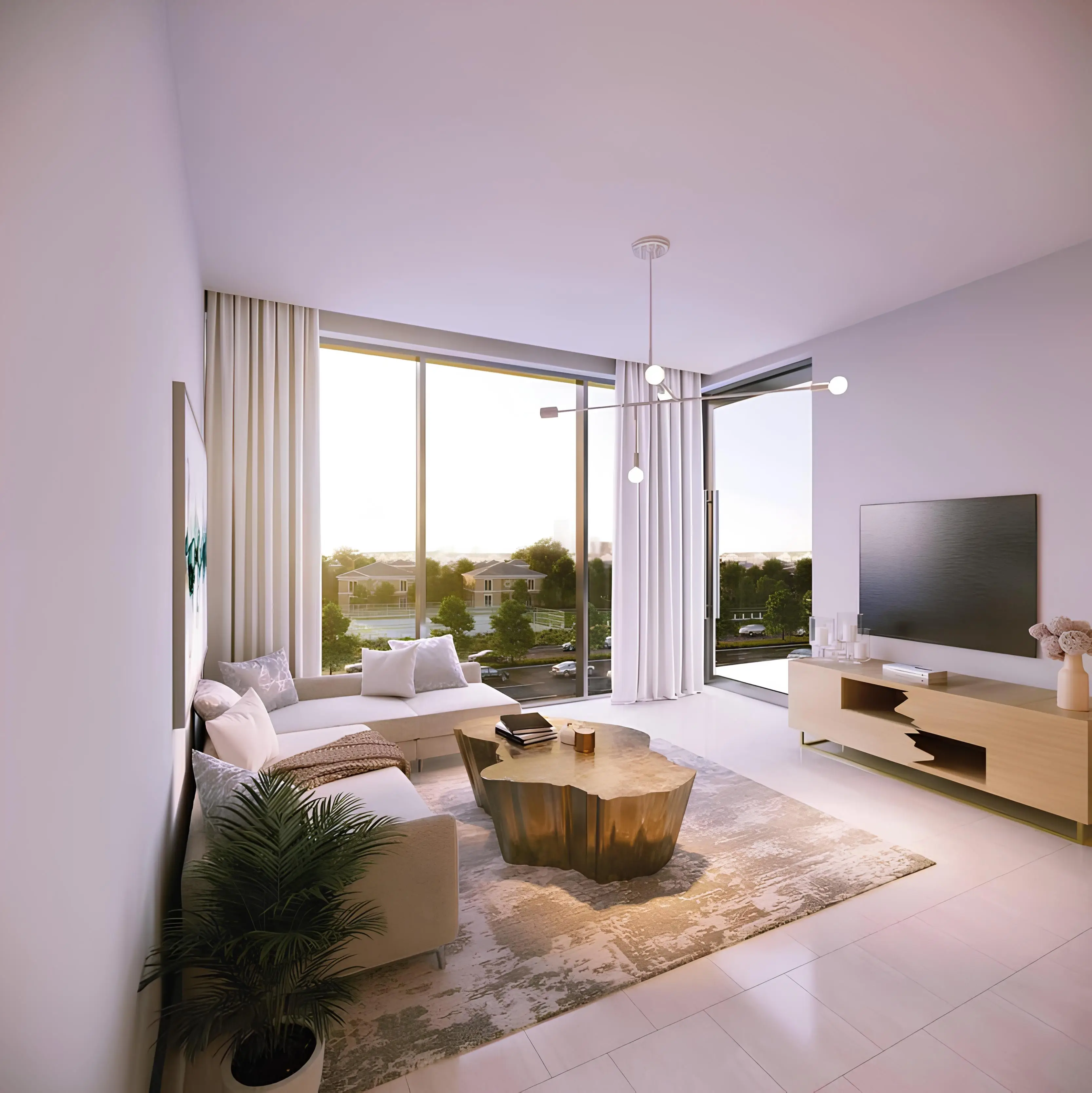 Tower 1 features a ground floor and nine residential floors, while Tower 2 is comprised of a ground floor and eight residential floors. The development offers a selection of studios and one- and two-bedroom apartments, all thoughtfully designed with soft natural tones, high-quality materials, and floor-to-ceiling windows that fill the interiors with light and create an open, airy atmosphere.