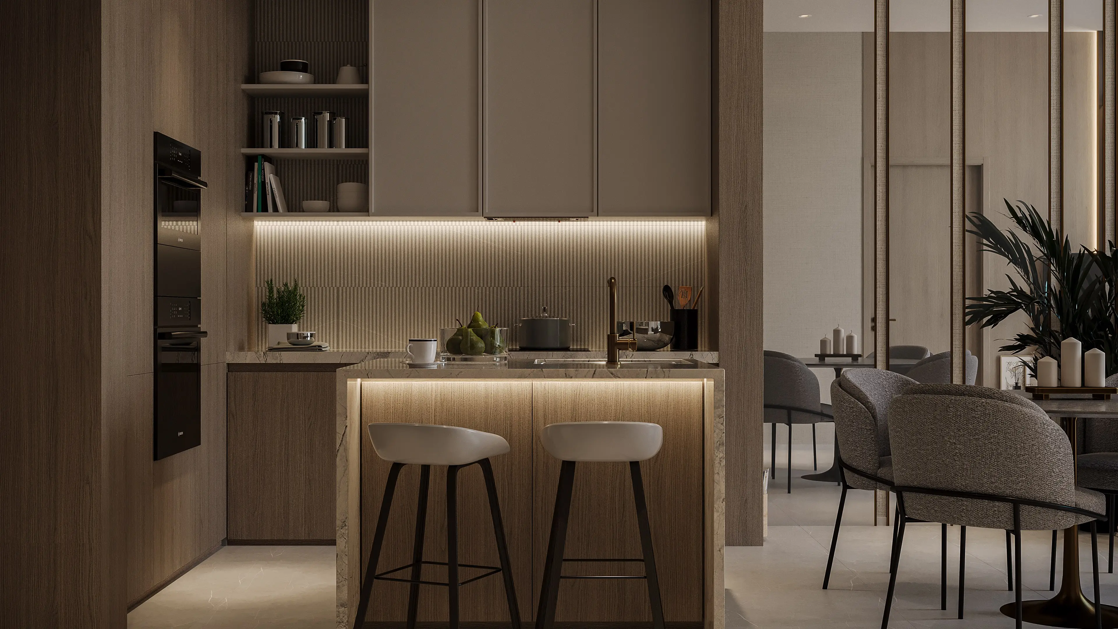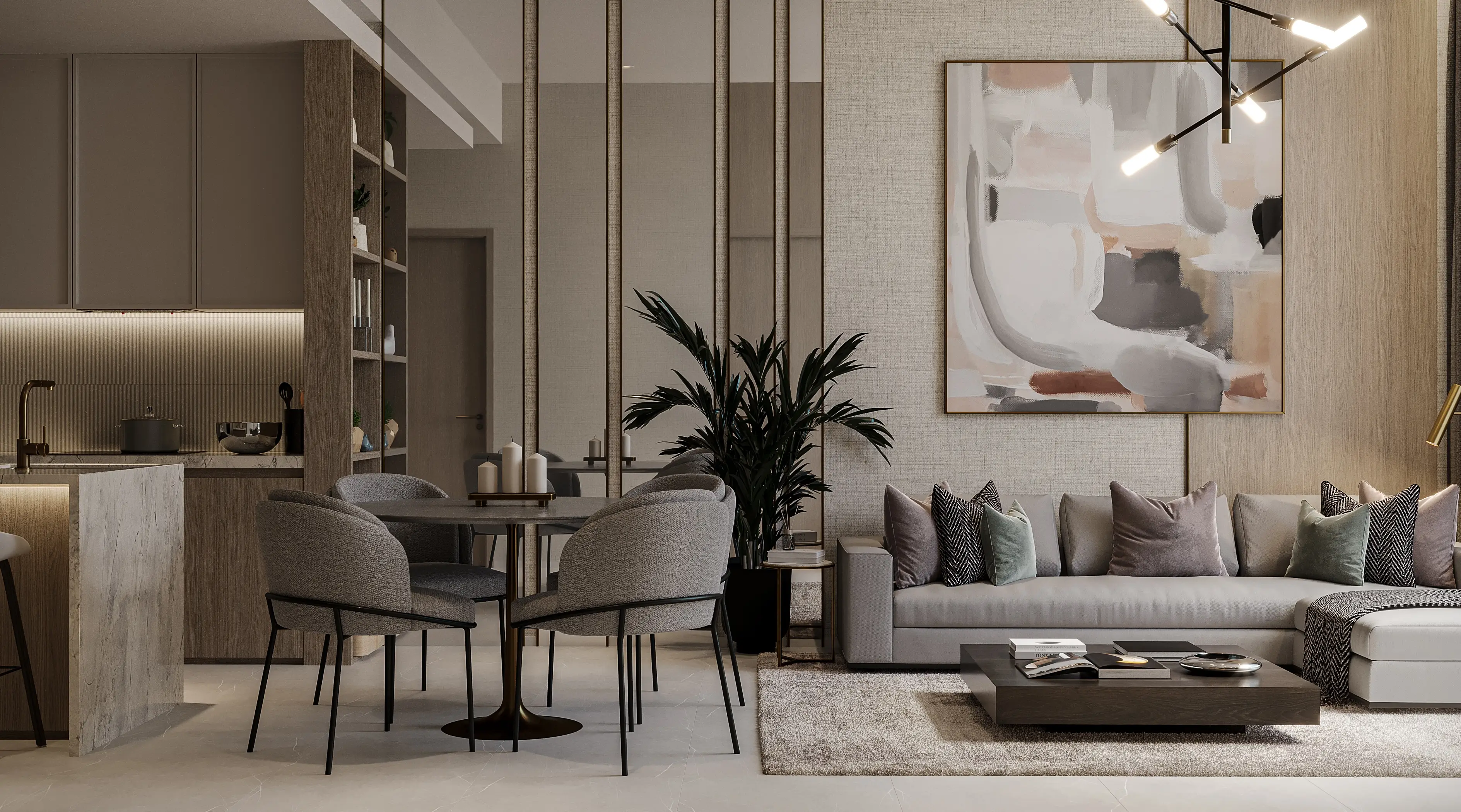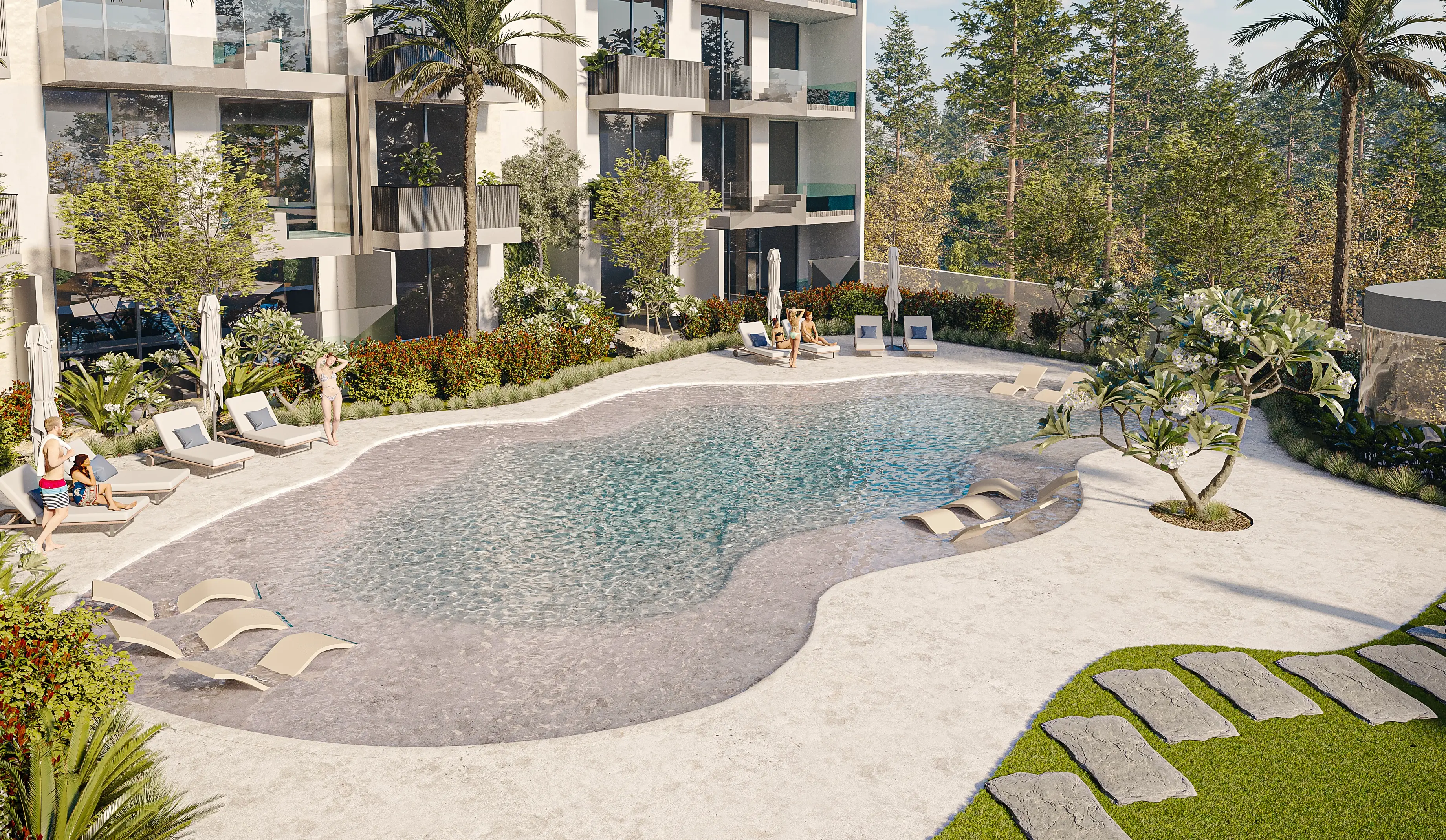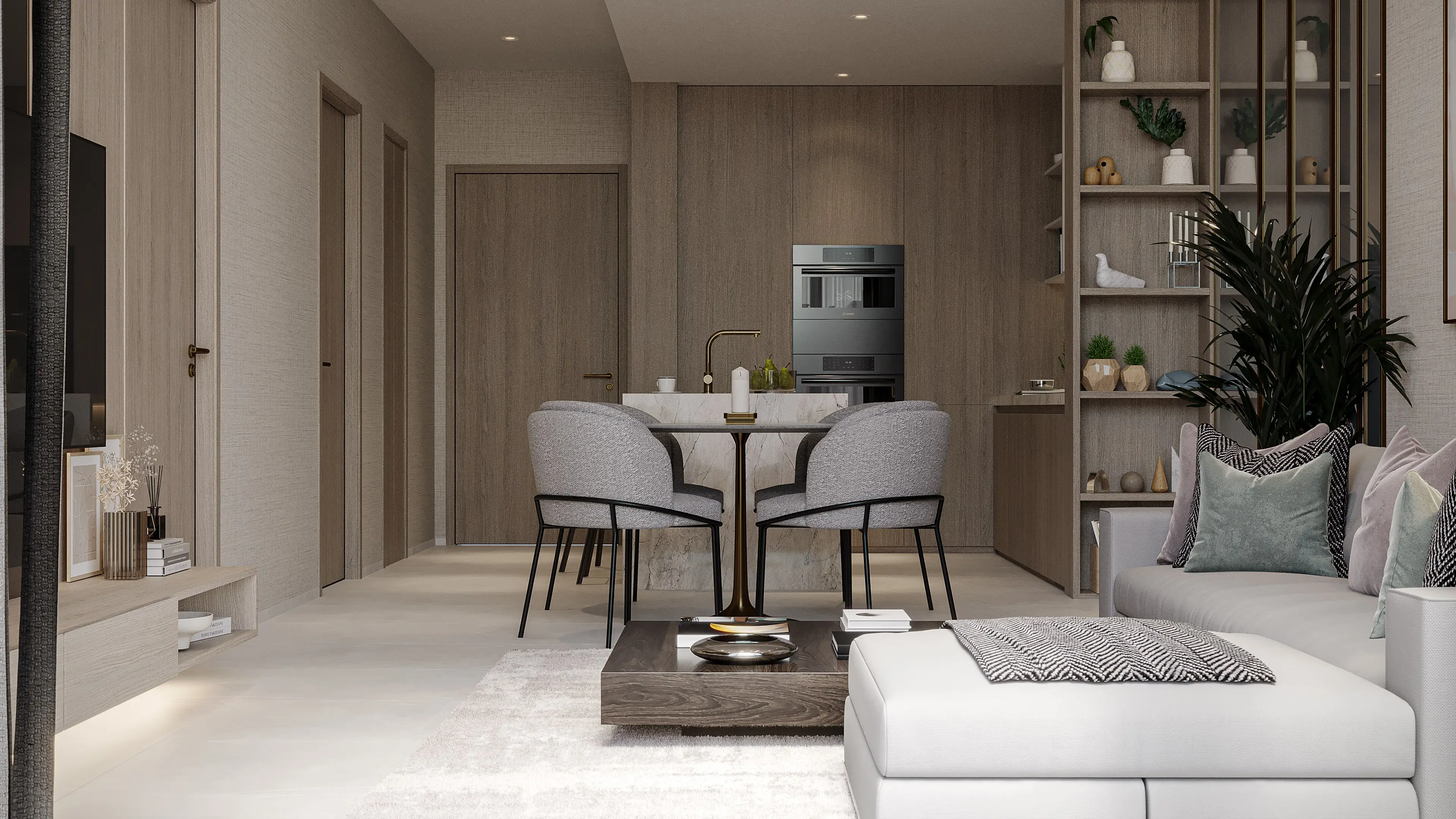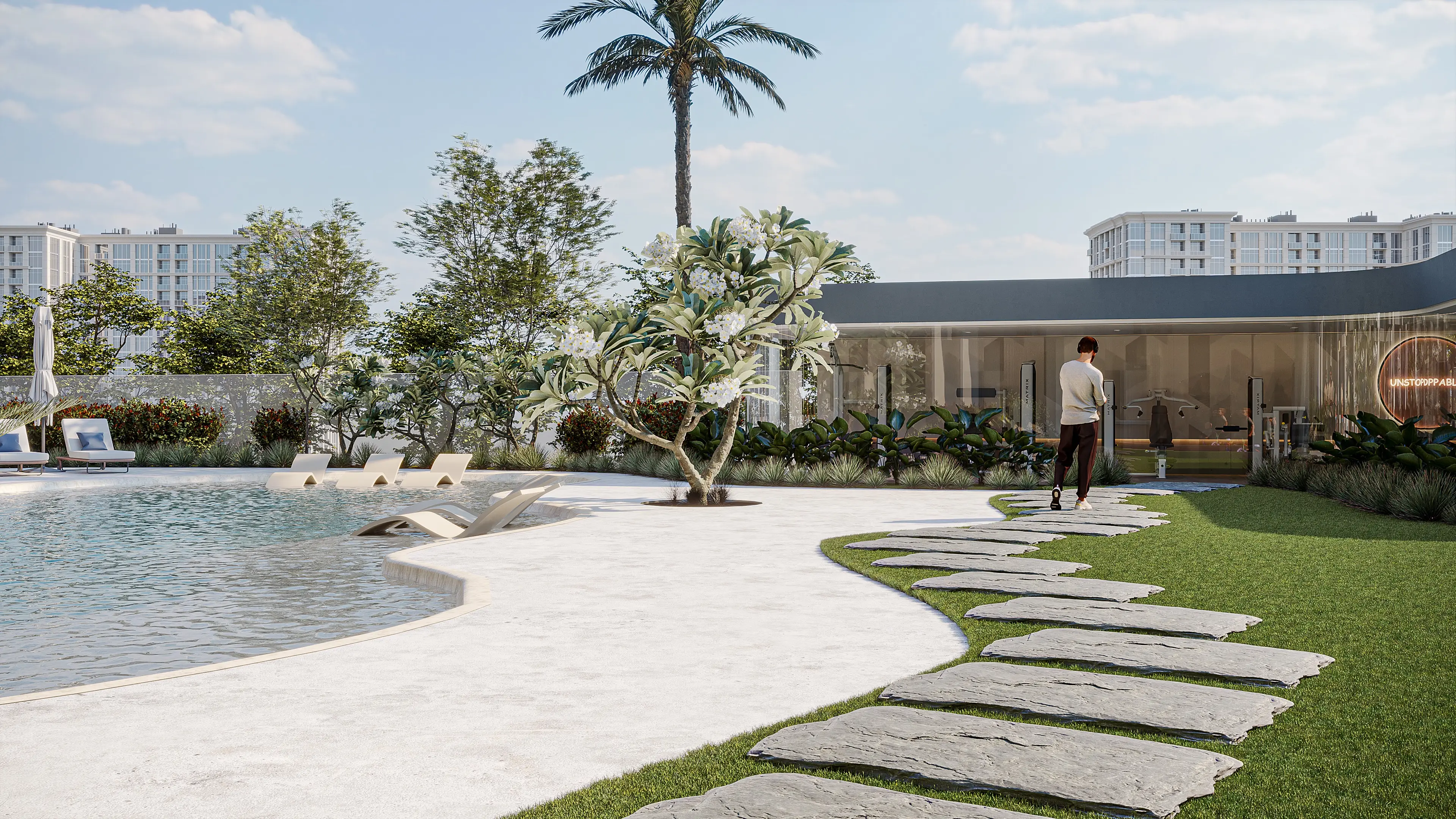 Available units include studios and one- and two-bedroom apartments, featuring panoramic views of the lush greenery surrounding the community. Every interior element is thoughtfully crafted to ensure an atmosphere of modern elegance and relaxation.