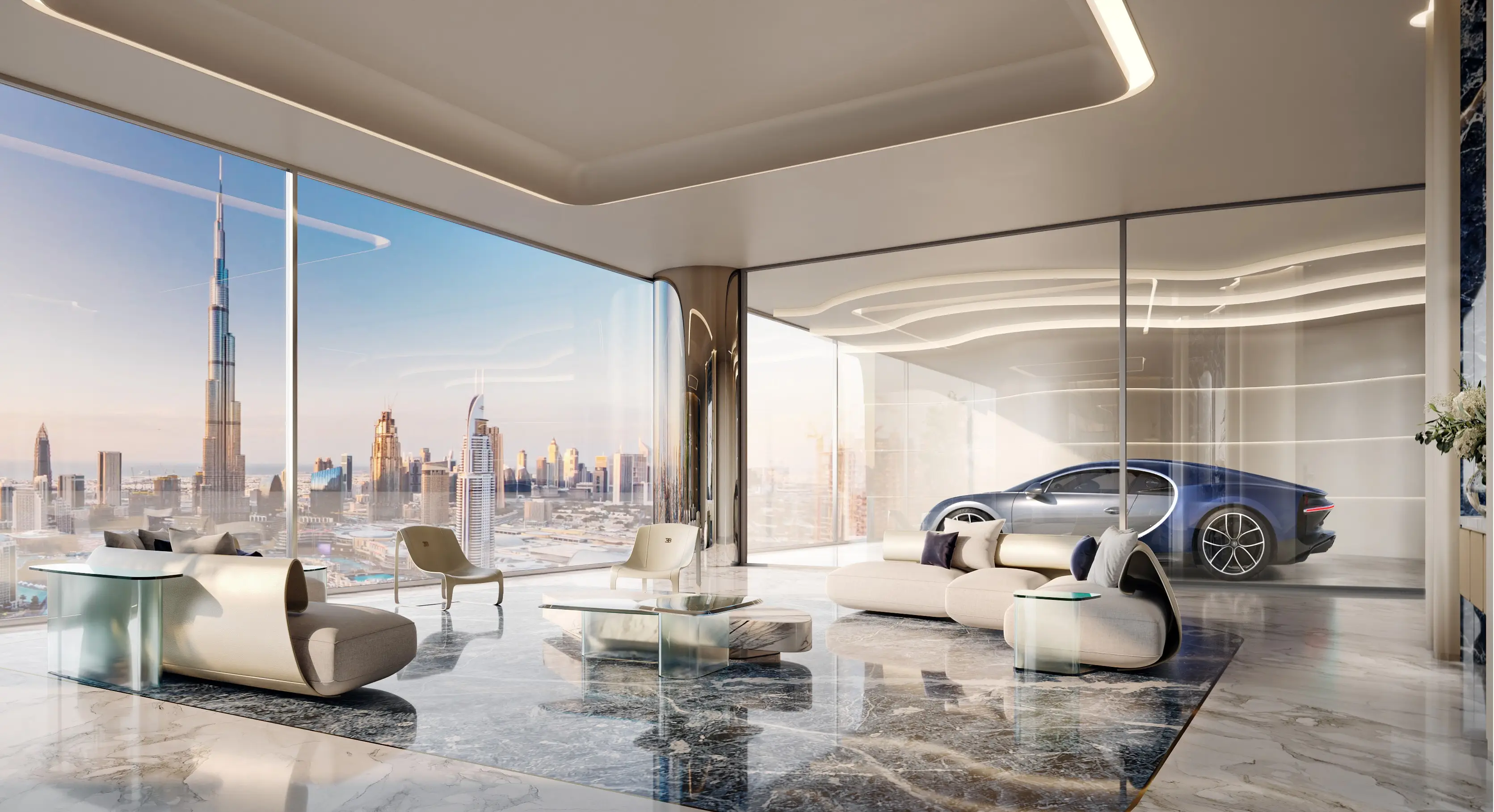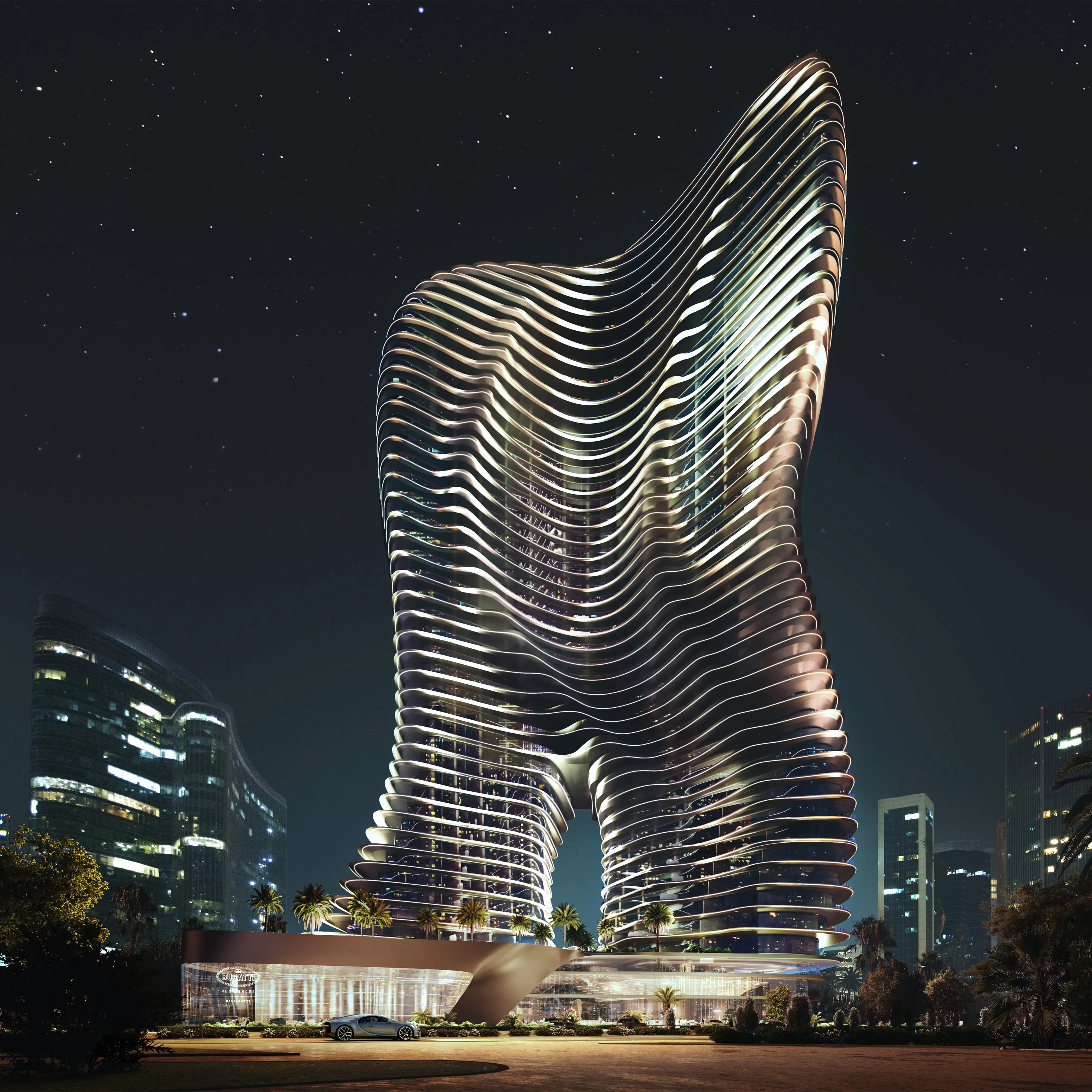 Smart home Bugatti Residences By Binghatti is an ultra-luxury residential complex in Business Bay and the world’s first Bugatti-branded project. The tower comprises four basement levels, a ground floor, the podium floor with amenities, forty-five residential floors, and a rooftop. The building features a wave-like façade inspired by the elegance of the French Riviera and signature Bugatti elements.