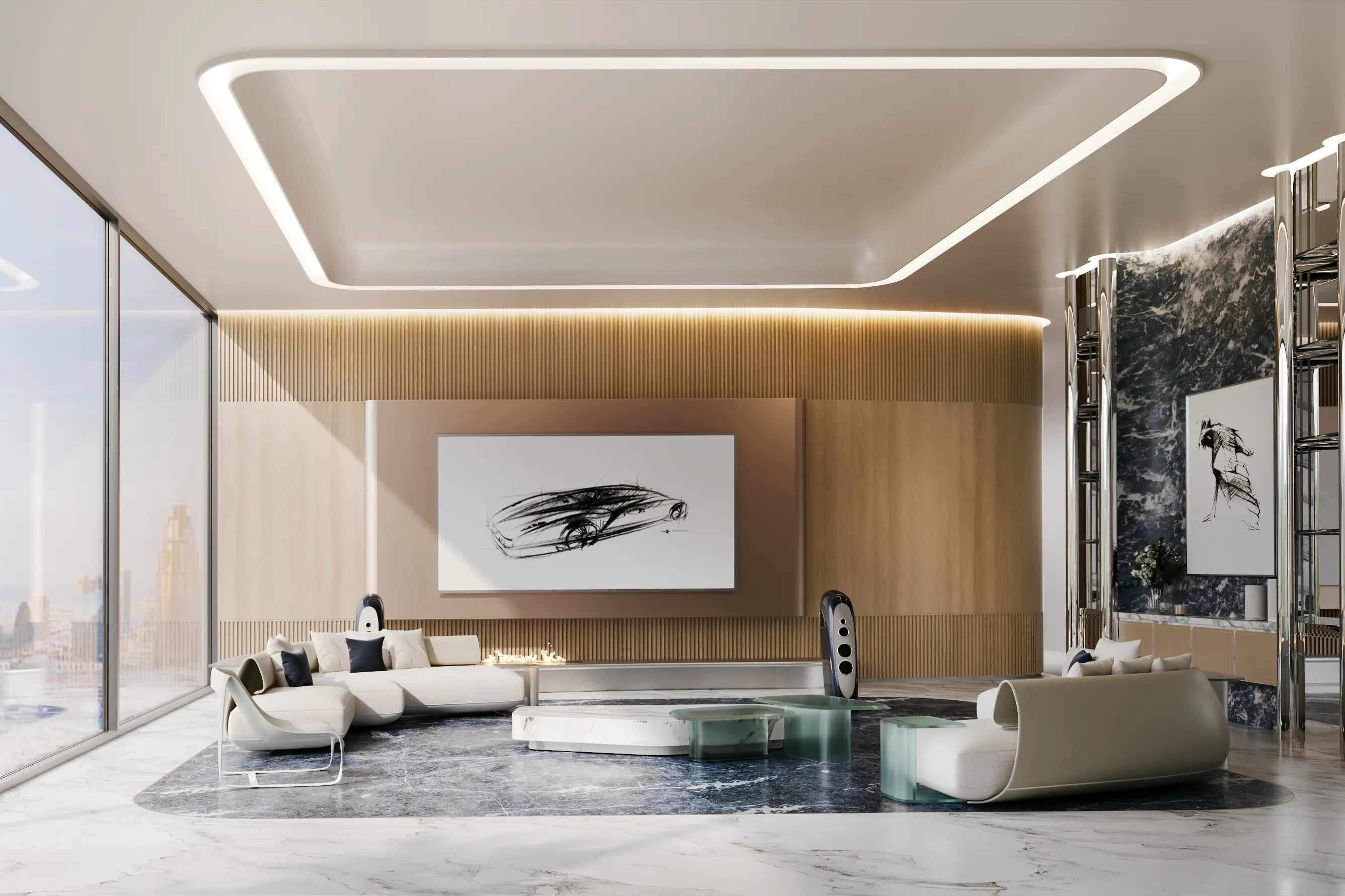The complex offers two-, three-, and four-bedroom apartments, along with the exclusive Sky Mansion penthouse collection. Each residence includes a private pool, jacuzzi, and a maid’s room. Penthouse owners benefit from a private car lift and ten parking spaces. The interiors are designed with refined aesthetics, premium materials, and meticulous attention to detail.
