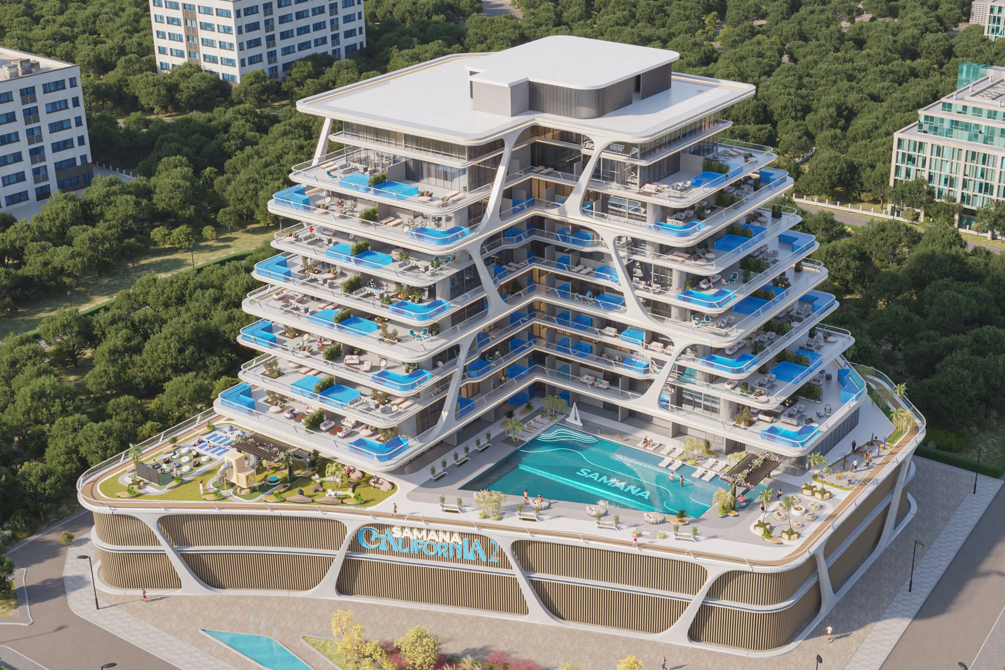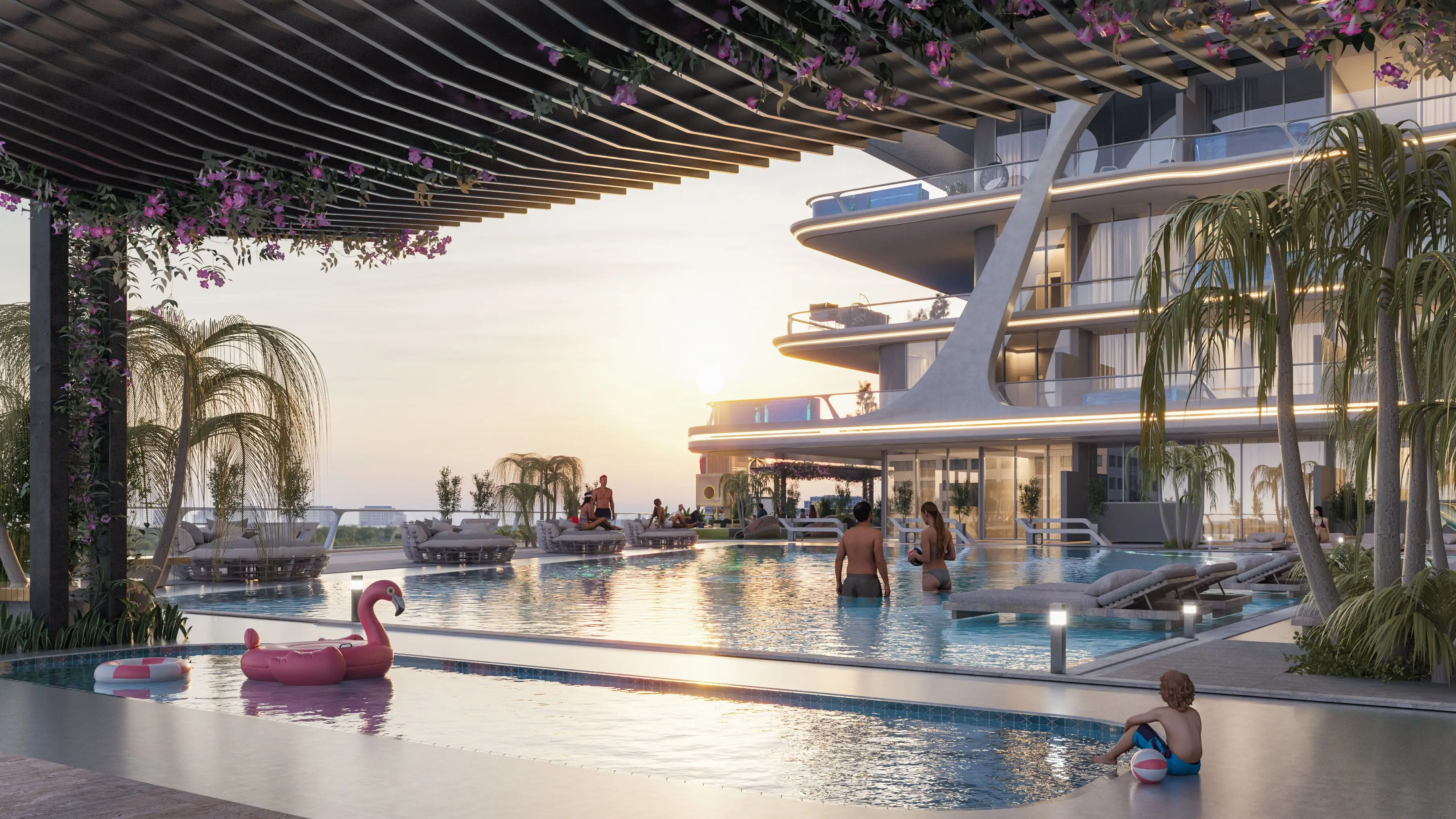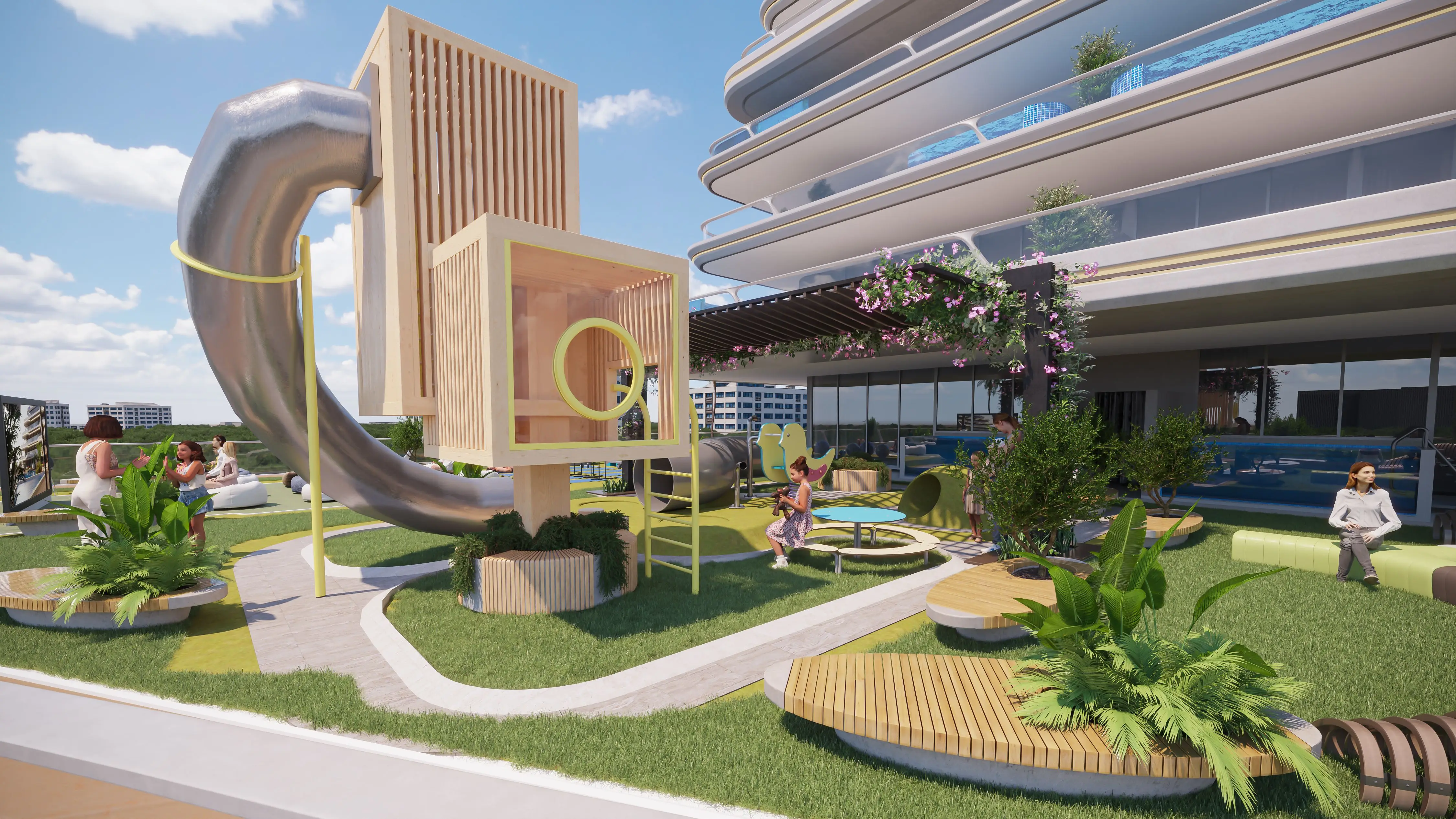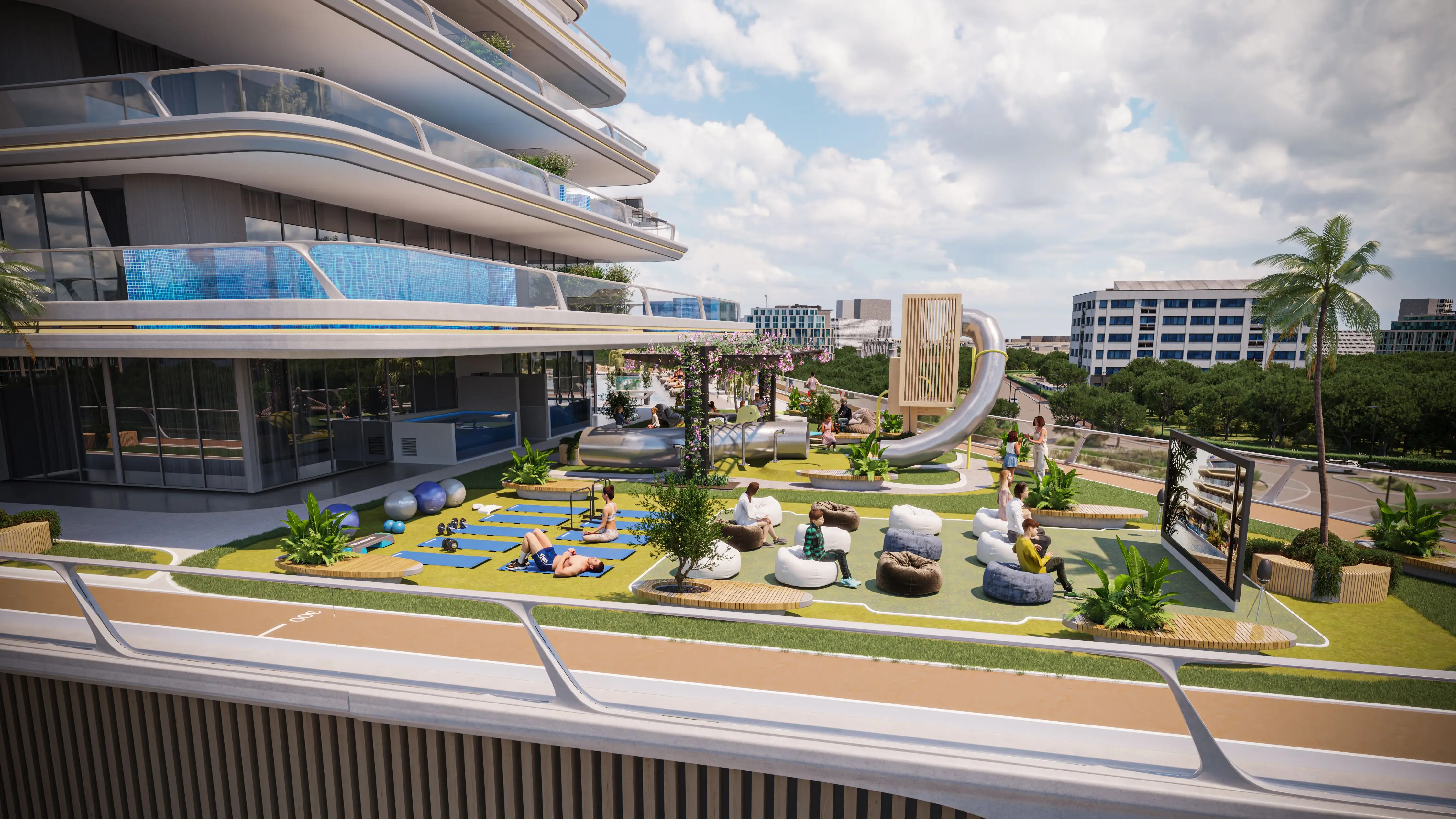 Residents are provided with a variety of world-class amenities. In addition to the private pools in the apartments, there is a communal adult pool with sun loungers and a small children's pool. Residents can take advantage of special film viewing areas, a gym and rooftop tennis court, sauna, Jacuzzi, and yoga classes. There is a playground for children.