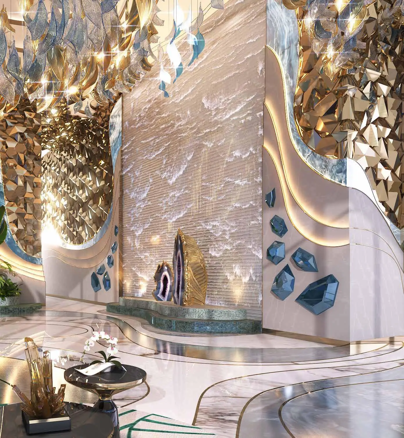 Shared gym & fitness Chic Tower is a modern development on the Dubai Canal in Business Bay. The façade and interiors are designed in collaboration with de Grisogono, giving the tower elegance and style. It features a ground floor, 5 podium levels, 36 residential floors, and a roof level.