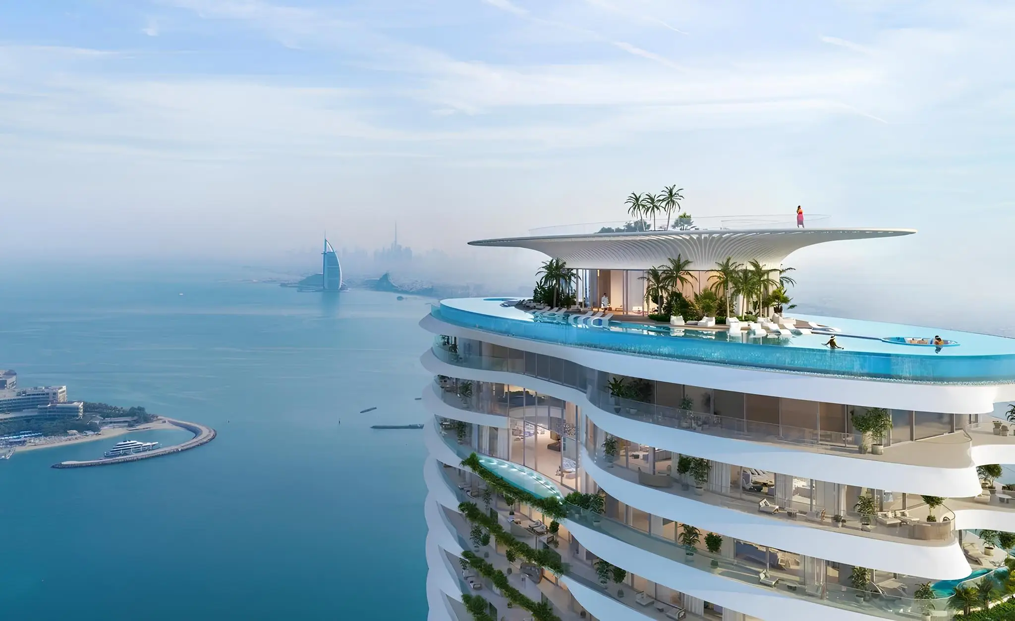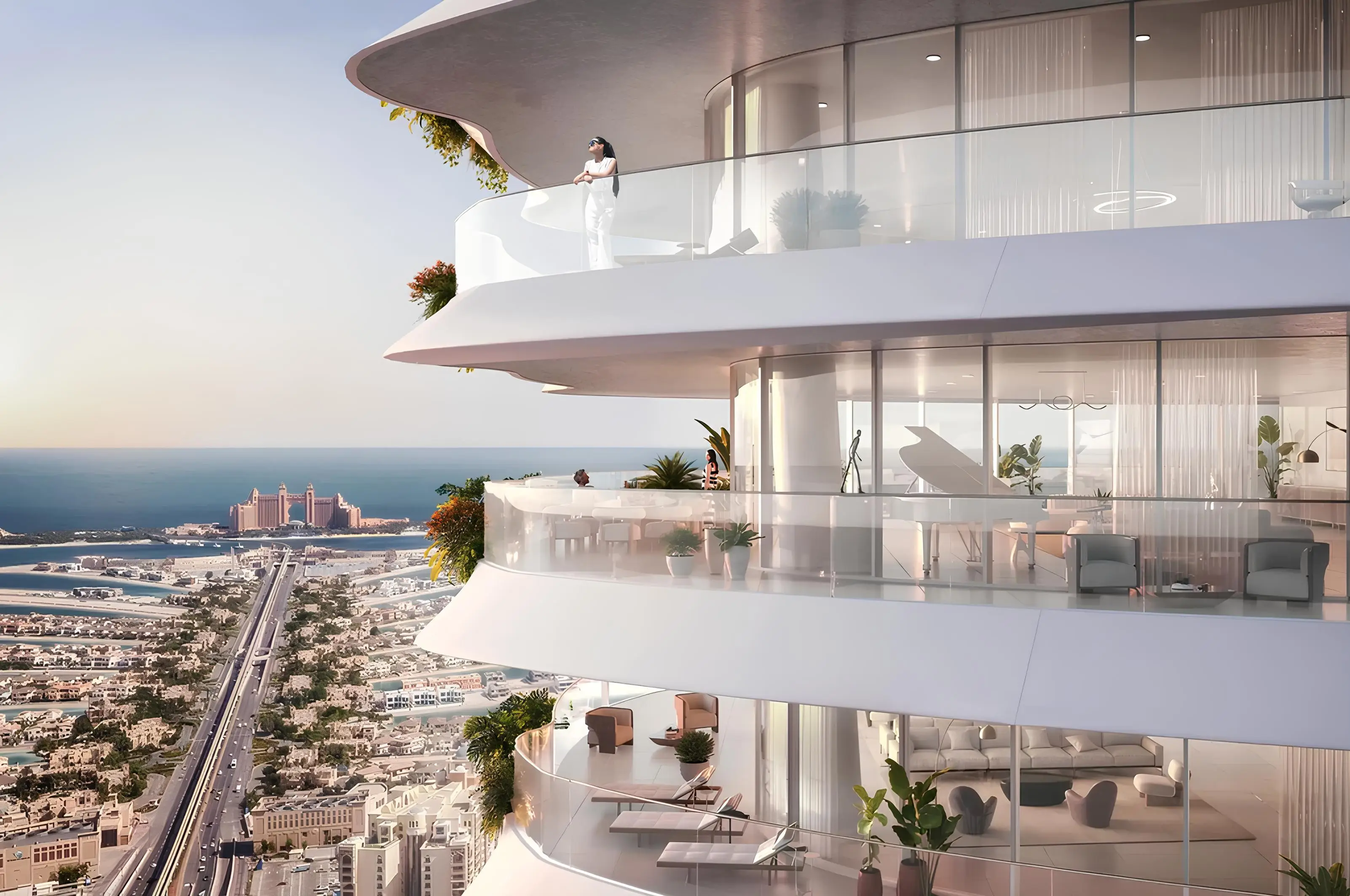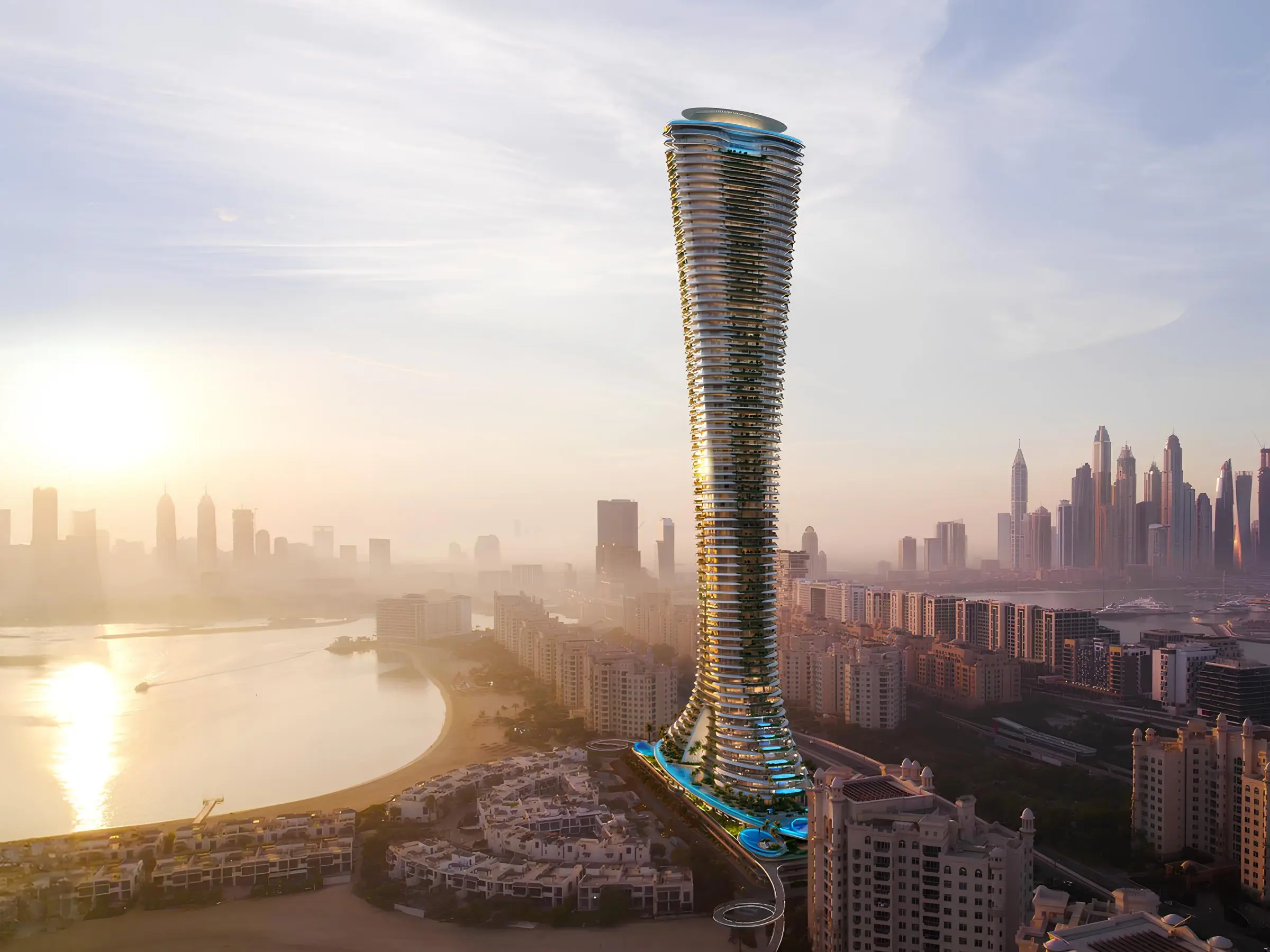 The stunning tower, exuding unparalleled elegance and grandeur, includes a ground floor, a three-level podium, 69 residential floors, and two roof levels. The lower level features a luxurious infinity pool, while the upper level boasts a 360-degree observation deck, making it the highest viewing point on Palm Jumeirah. The highlights of the complex include a series of vertical lakes. The project offers a limited collection of only 76 residences, namely: apartments with 2–6 bedrooms, duplexes with 7 bedrooms, and an impressive two-level penthouse with 5 bedrooms.