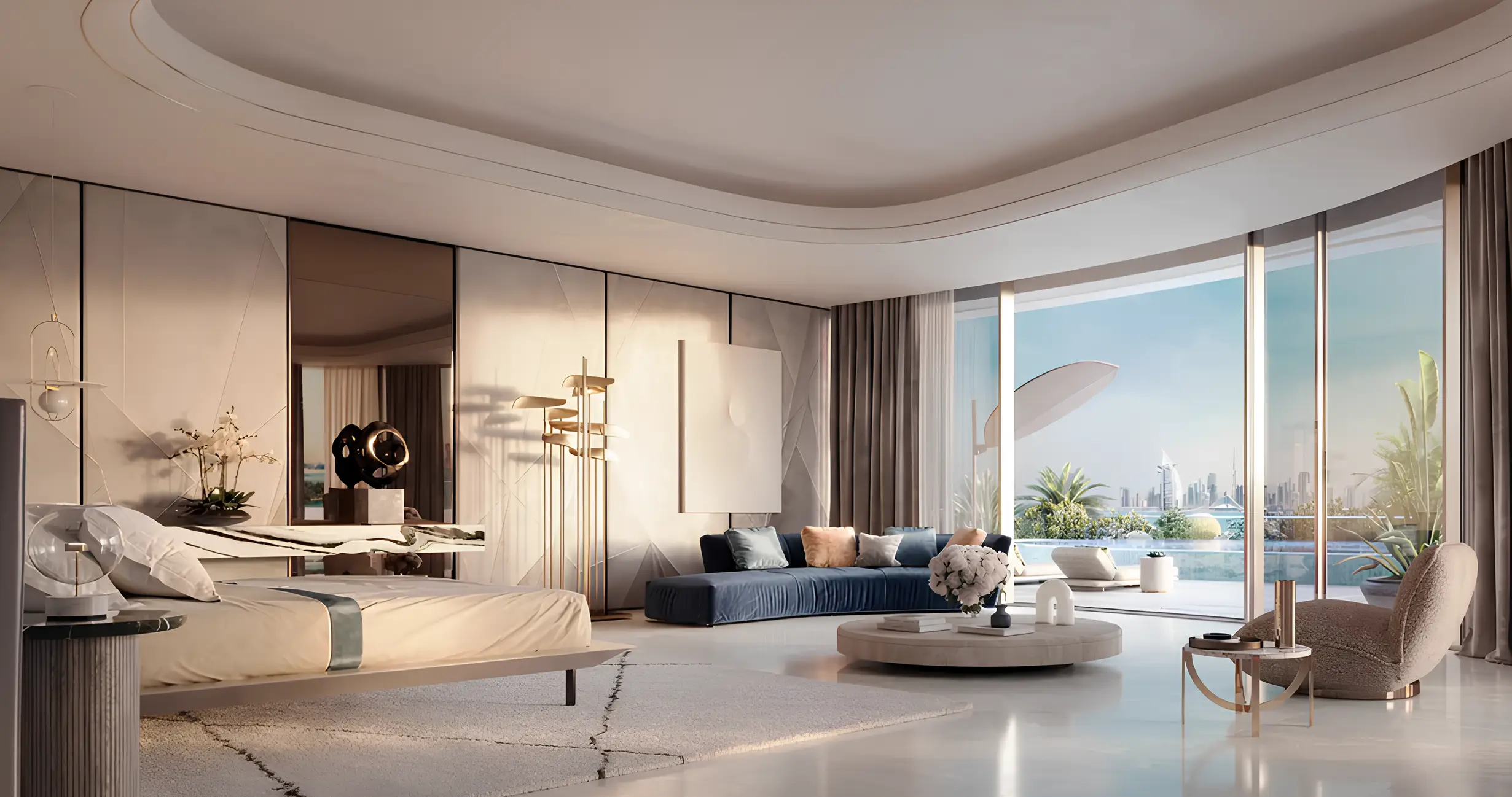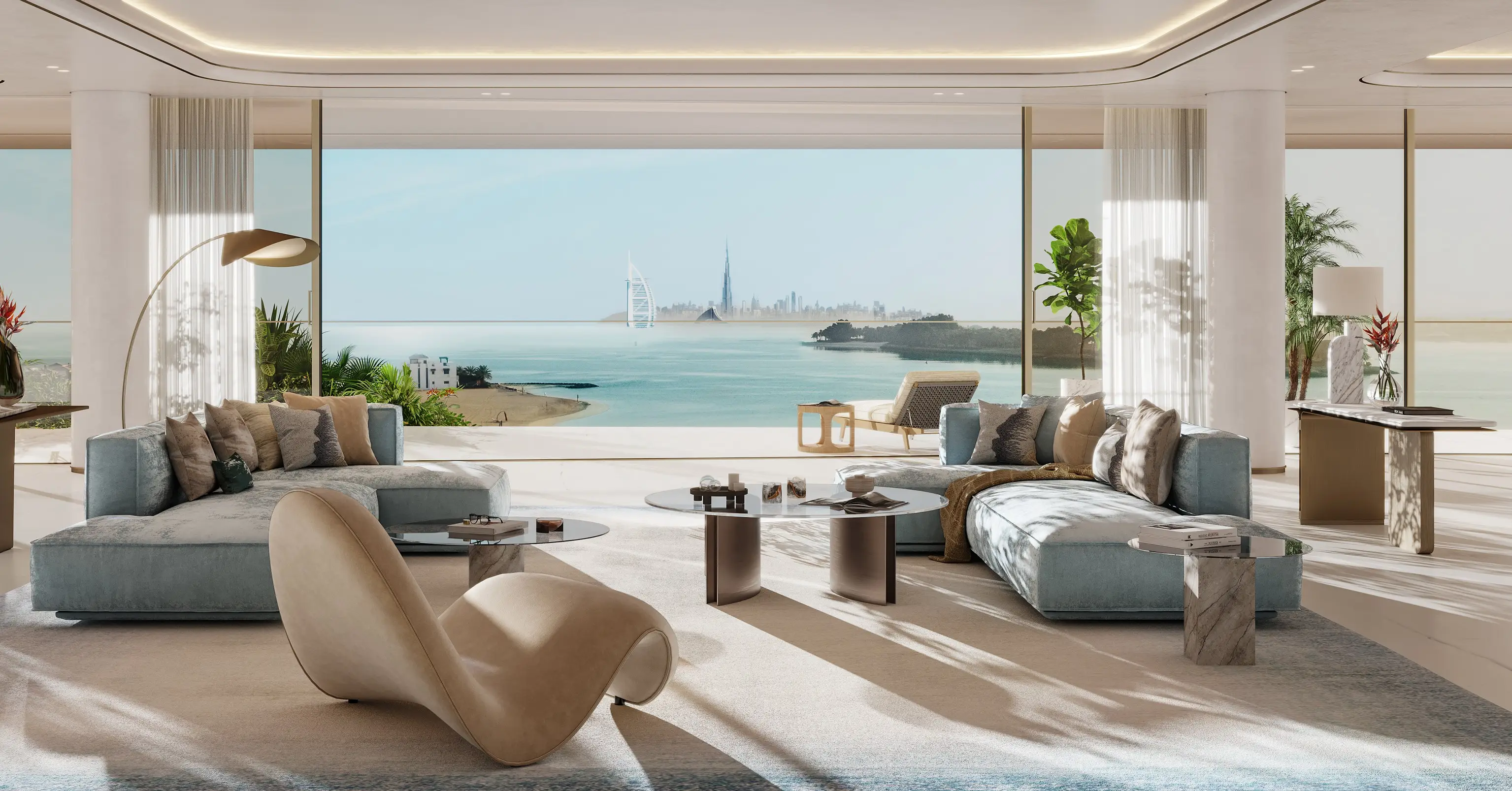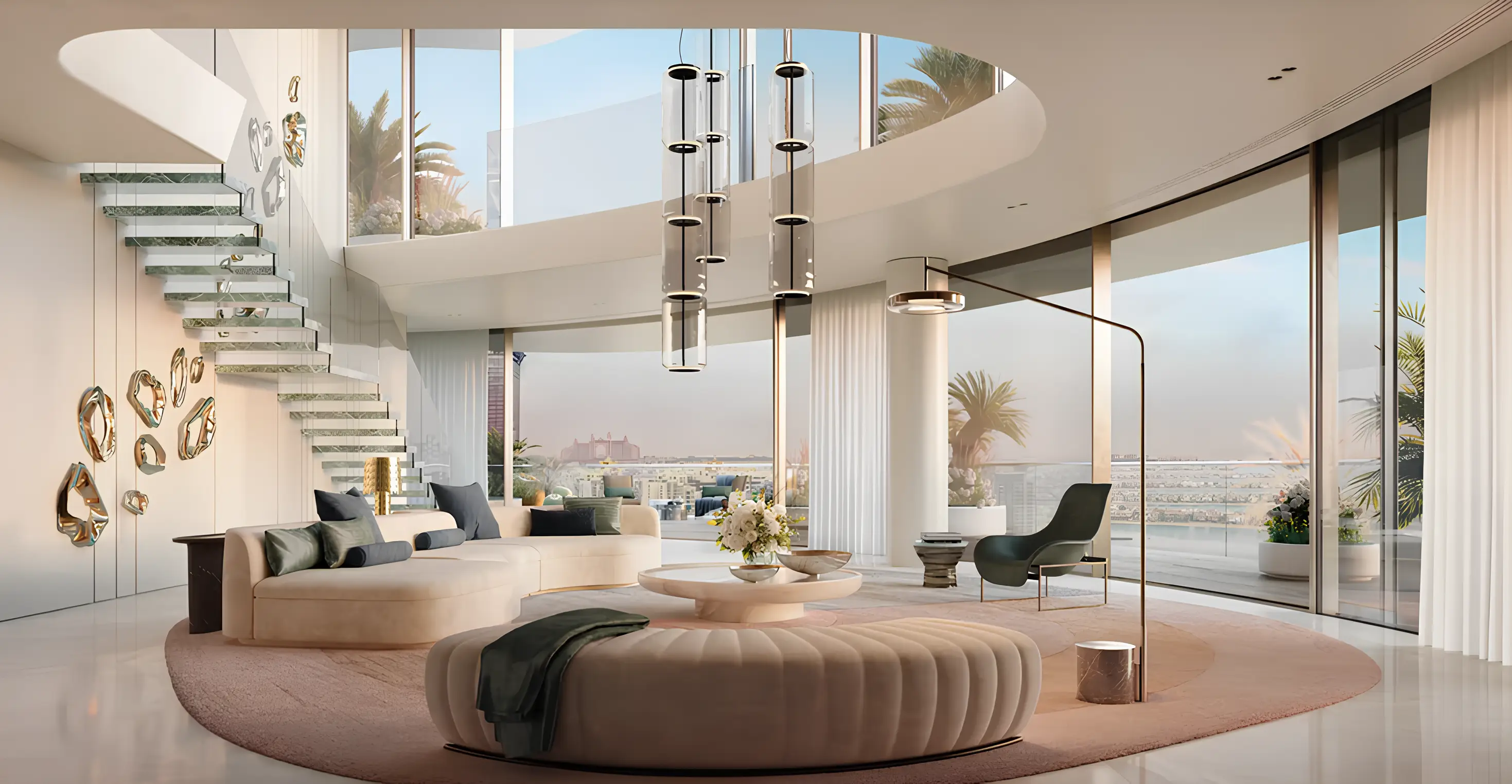 The stunning tower, exuding unparalleled elegance and grandeur, includes a ground floor, a three-level podium, 69 residential floors, and two roof levels. The lower level features a luxurious infinity pool, while the upper level boasts a 360-degree observation deck, making it the highest viewing point on Palm Jumeirah. The highlights of the complex include a series of vertical lakes. The project offers a limited collection of only 76 residences, namely: apartments with 2–6 bedrooms, duplexes with 7 bedrooms, and an impressive two-level penthouse with 5 bedrooms.