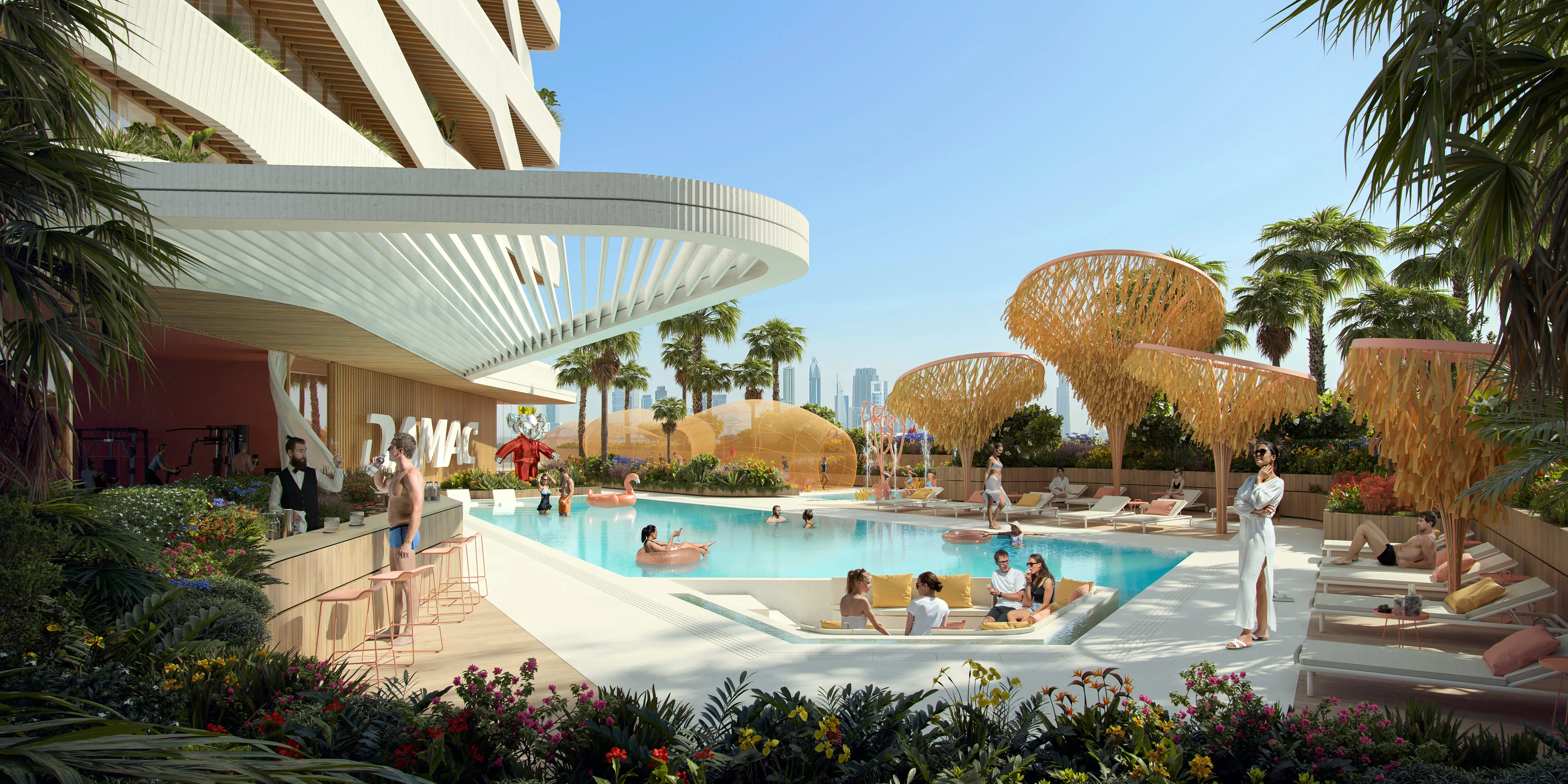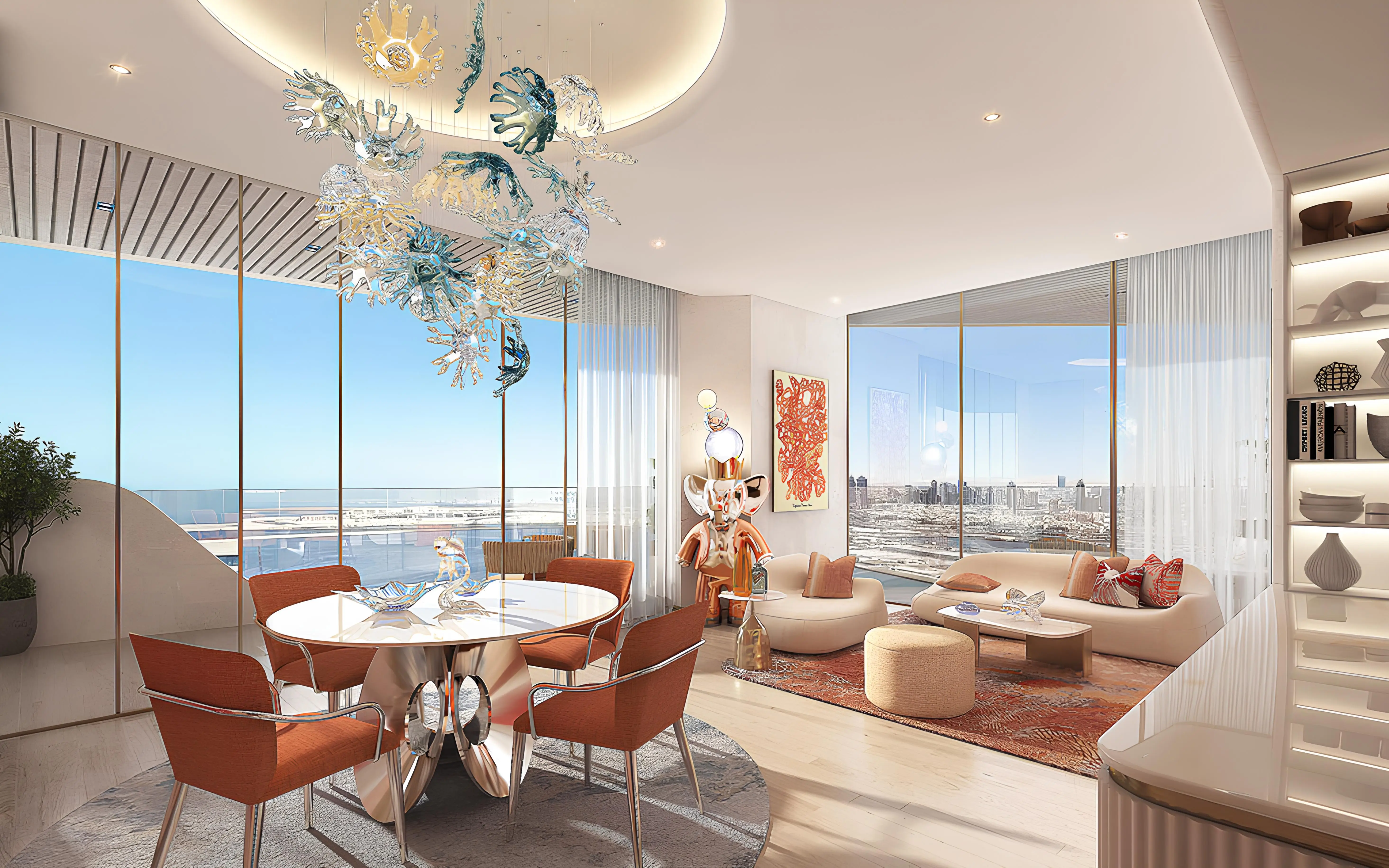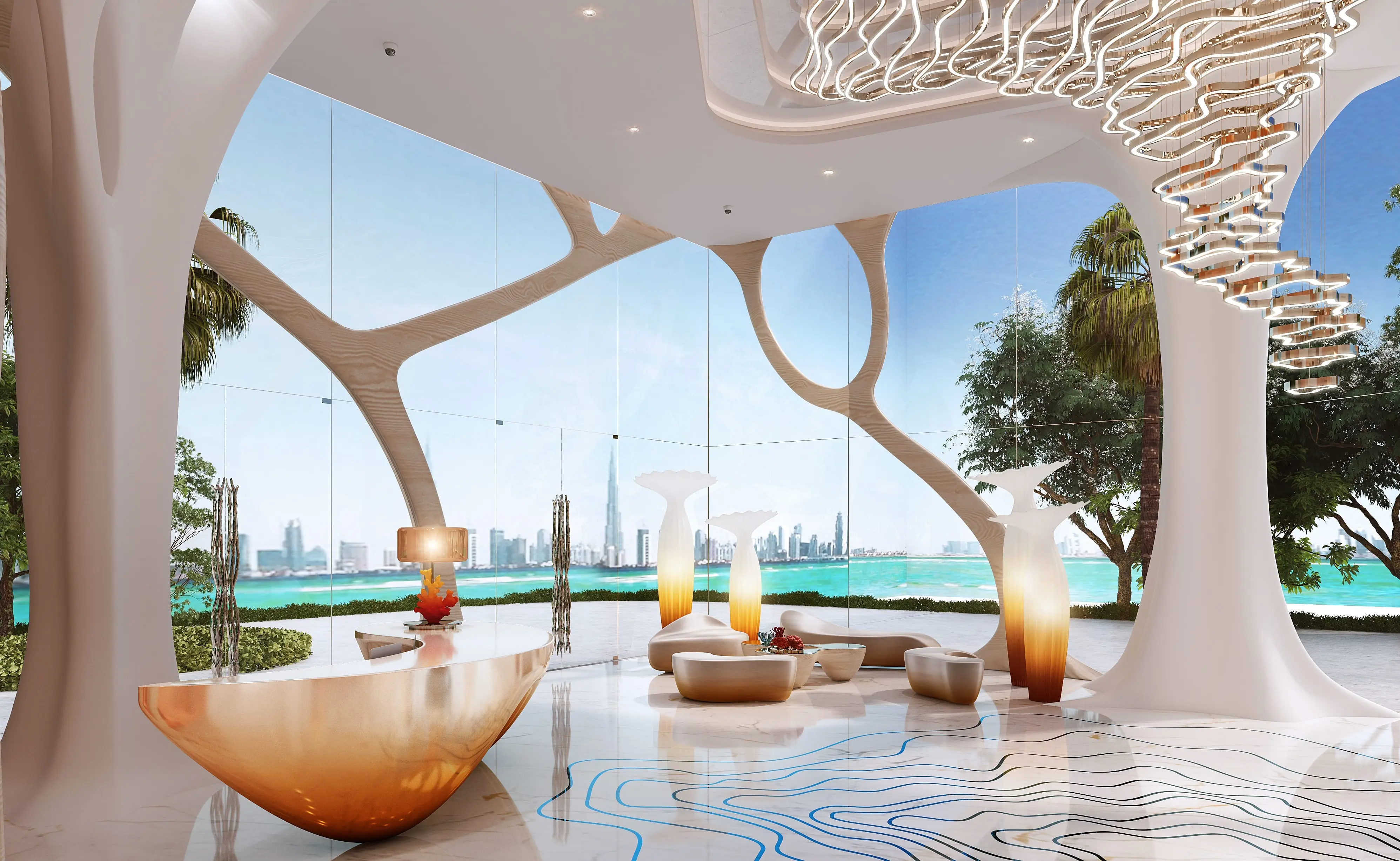 Shared gym & fitness Coral Reef is a luxurious project by Damac, located in the unique Maritime City area. The building has a configuration with a ground level, 6 podium levels, 48 residential floors, and a roof. The architecture, inspired by the shapes of coral reefs, blends perfectly with the surrounding nature. The exterior is made with high-quality materials, ensuring durability and aesthetic appeal.