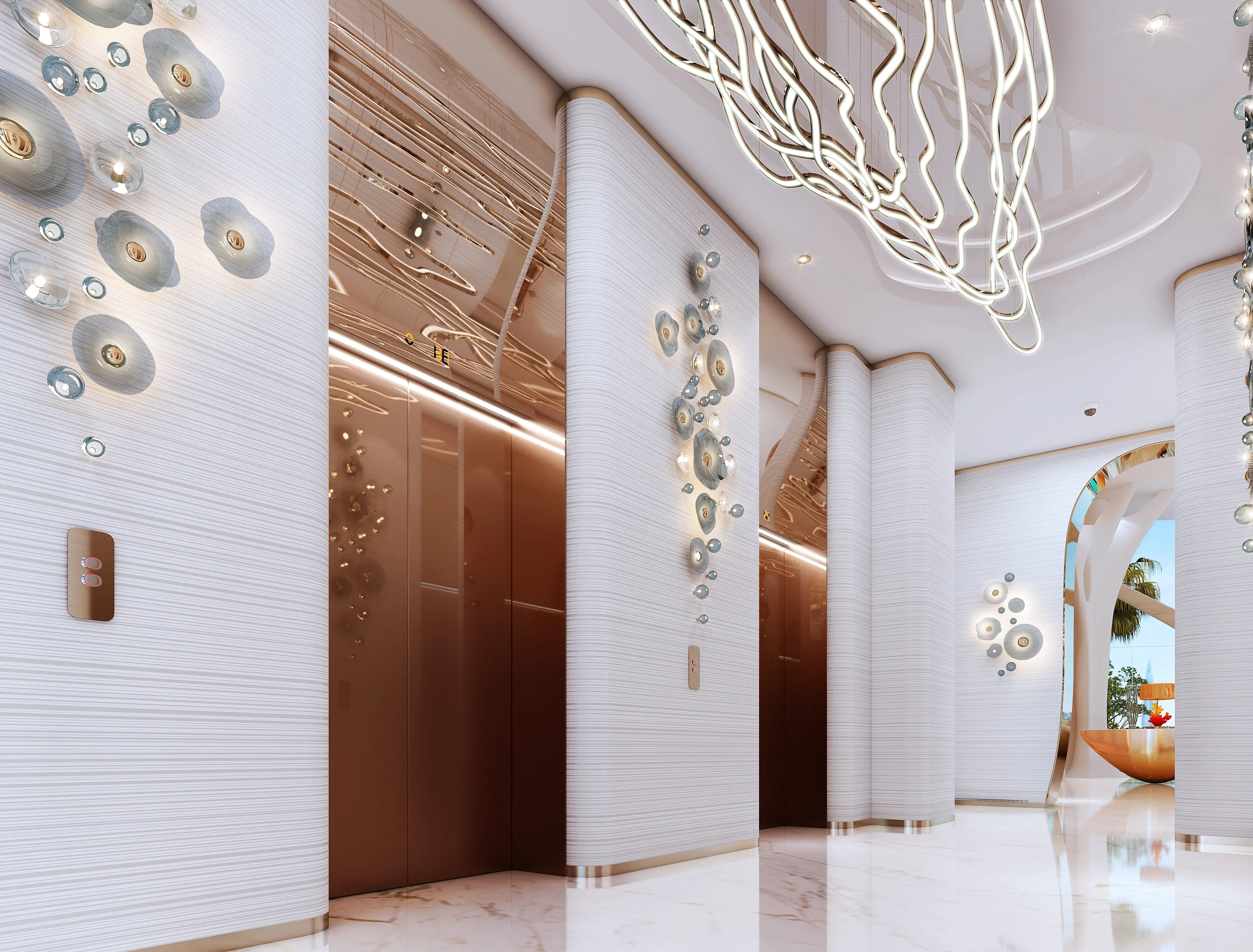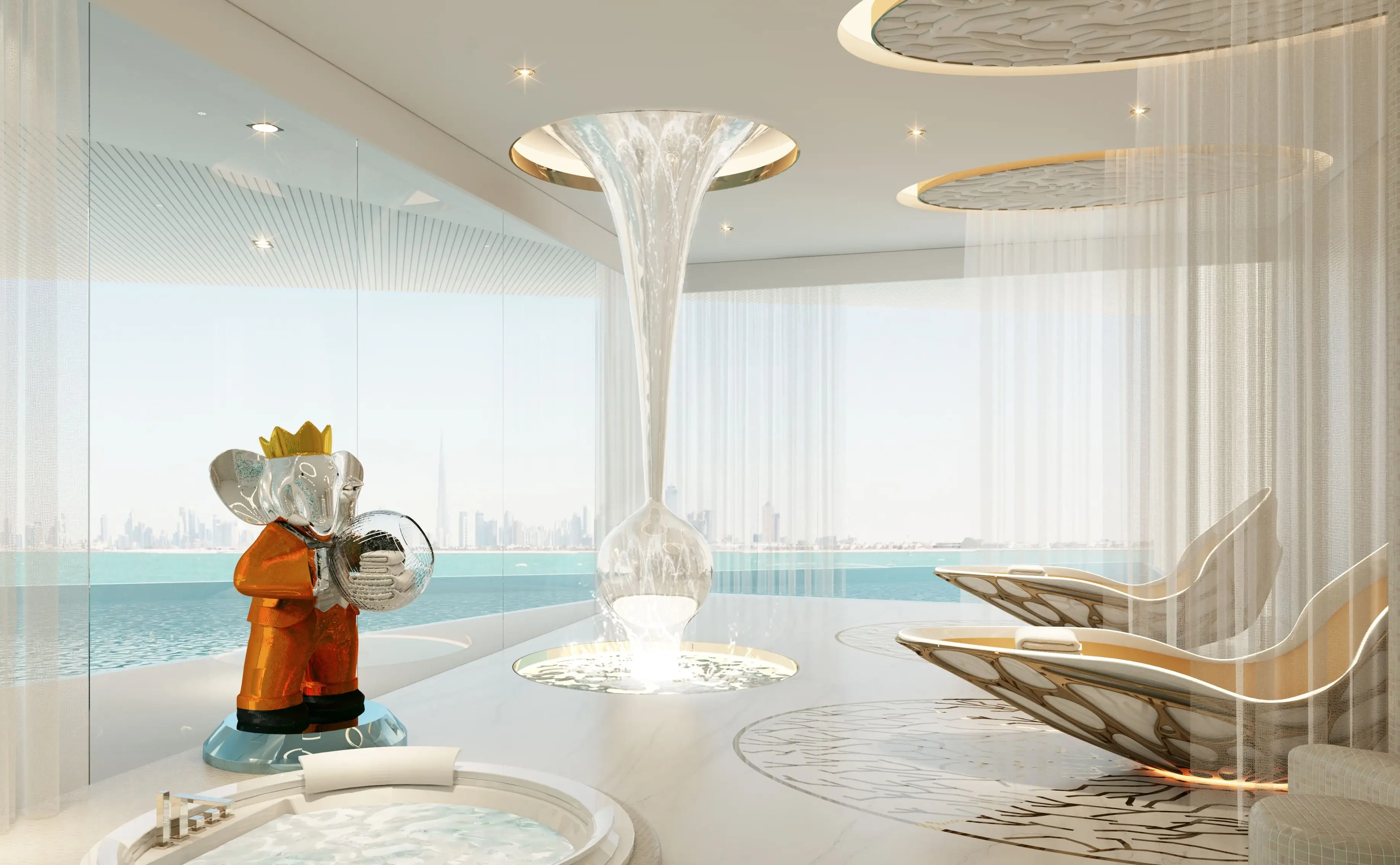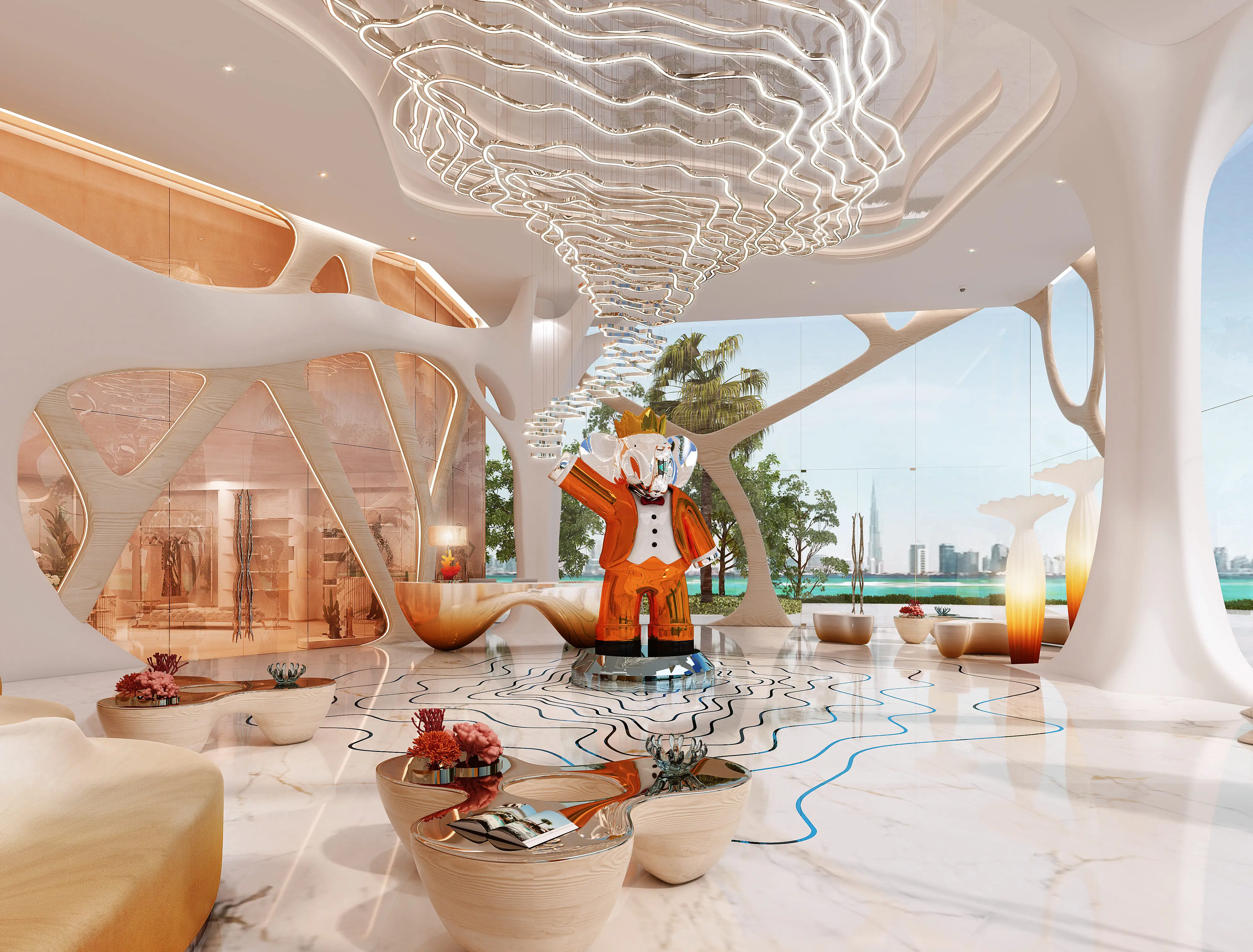 Shared gym & fitness Coral Reef is a luxurious project by Damac, located in the unique Maritime City area. The building has a configuration with a ground level, 6 podium levels, 48 residential floors, and a roof. The architecture, inspired by the shapes of coral reefs, blends perfectly with the surrounding nature. The exterior is made with high-quality materials, ensuring durability and aesthetic appeal.
