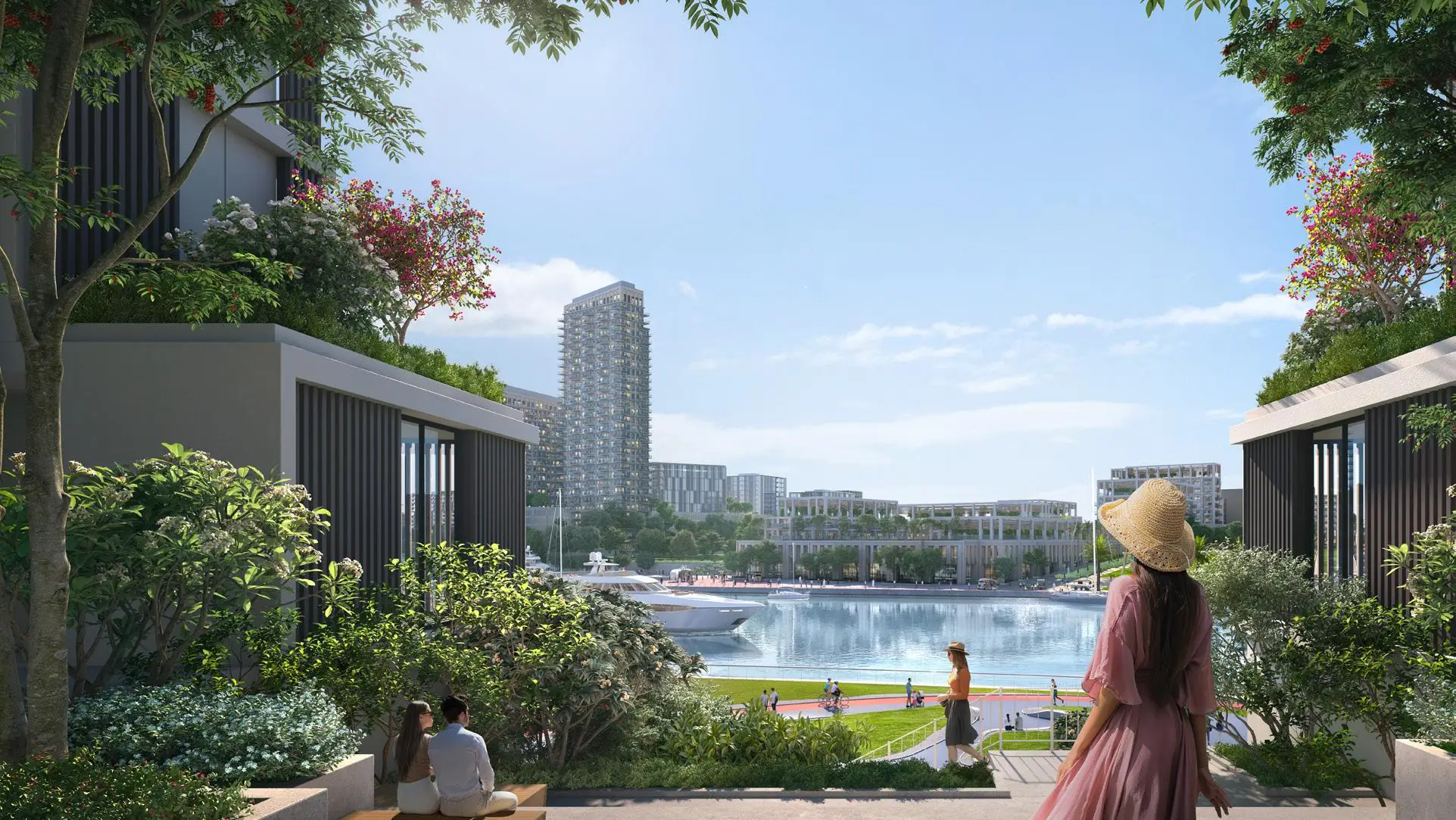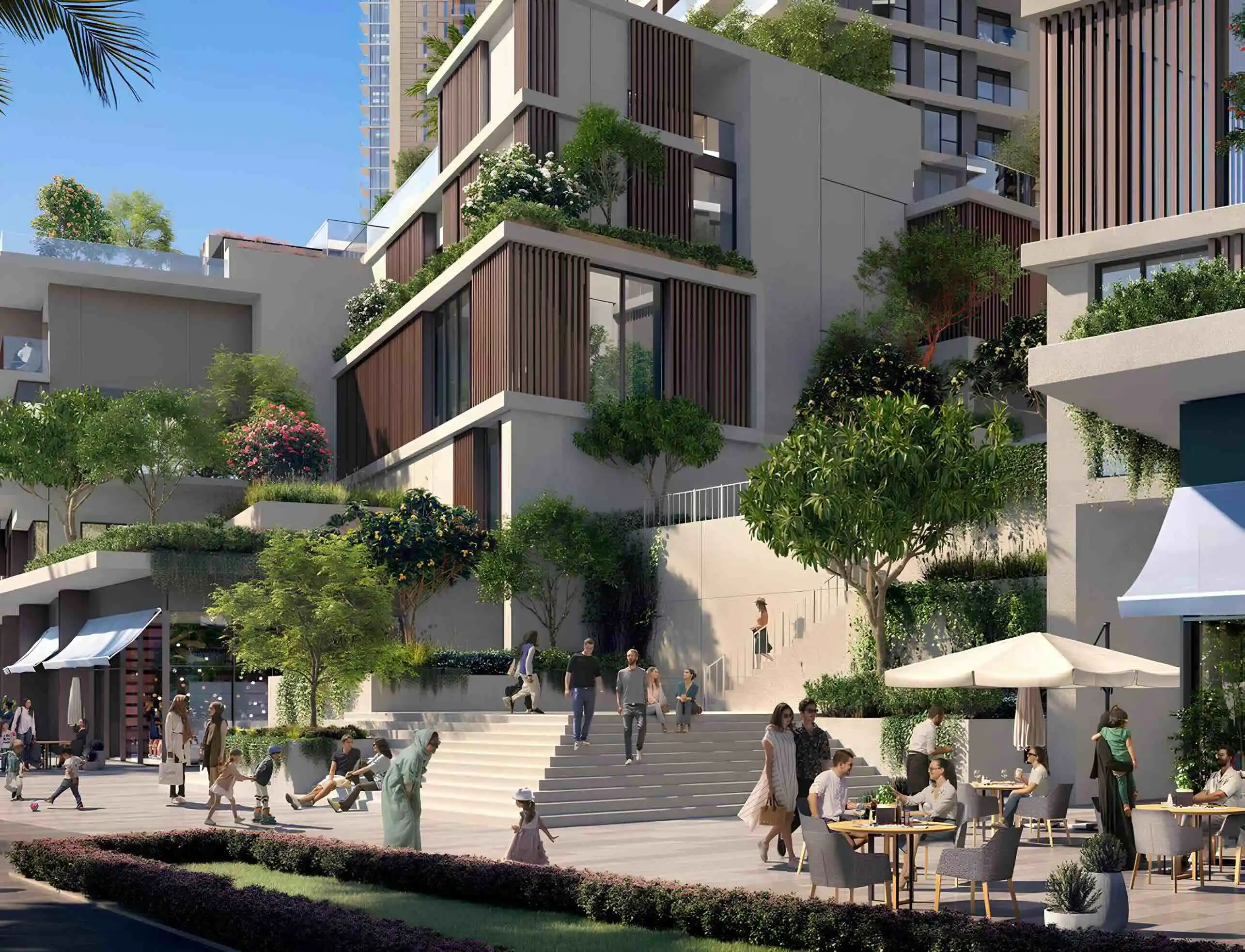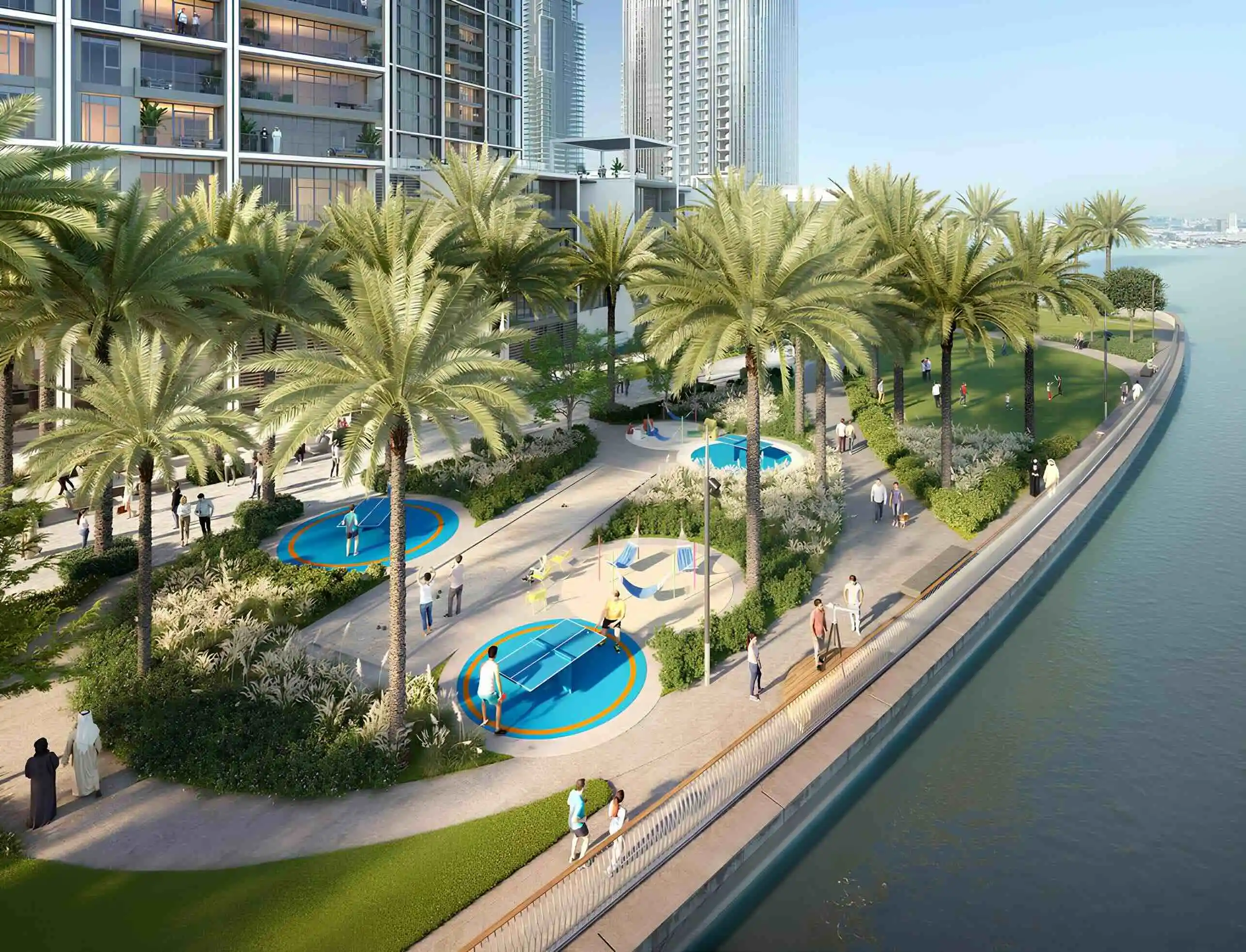 Residents can enjoy a resort-style podium with an infinity pool and sun deck, a children’s pool and play area, relaxation zones with views over the creek, a fully equipped gym overlooking the pool, a barbecue area, and direct access to restaurants and shops along the promenade.