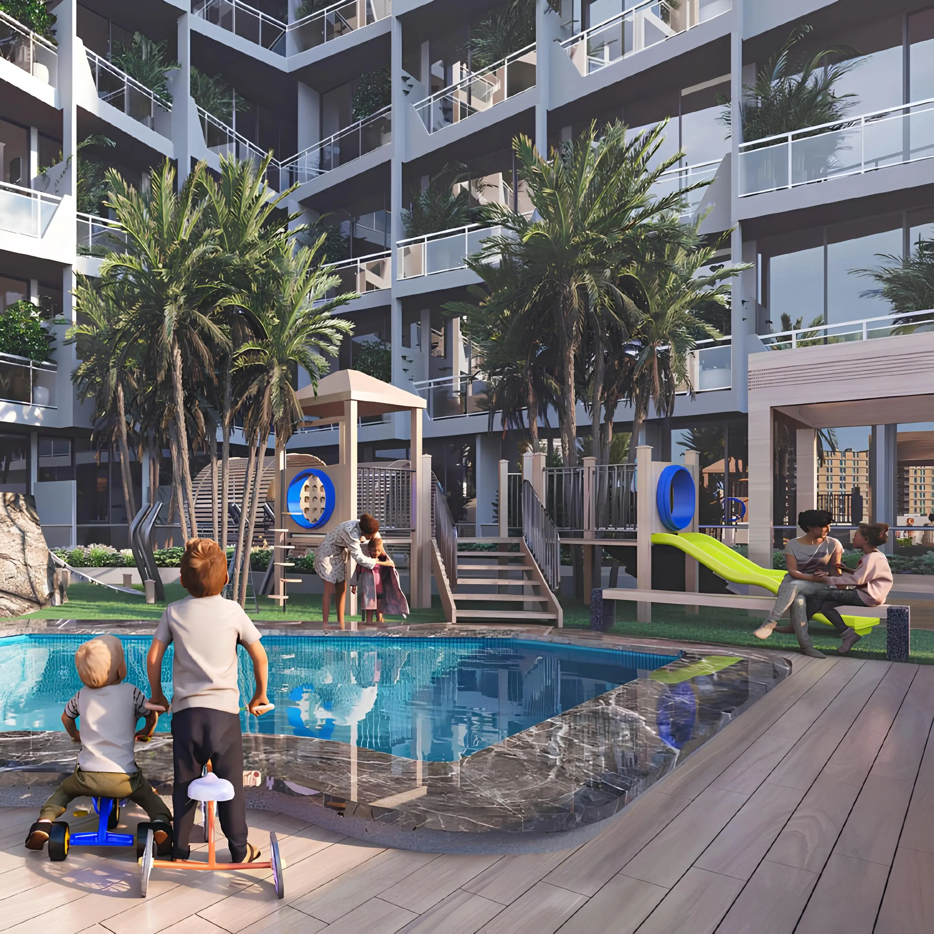 The JVC neighborhood is well positioned to provide Gateway residents with quick access to key points in Dubai. About 7-10 minutes away is Dubai Hills Mall, Mall of the Emirates, Dubai Marina. Burj Al Arab, Burj Khalif, The Palm Jumeirah, Jumeirah Beach, Museum of the Future are just 15-20 minutes away by car. Dubai International Airport is a 30-minute drive away.