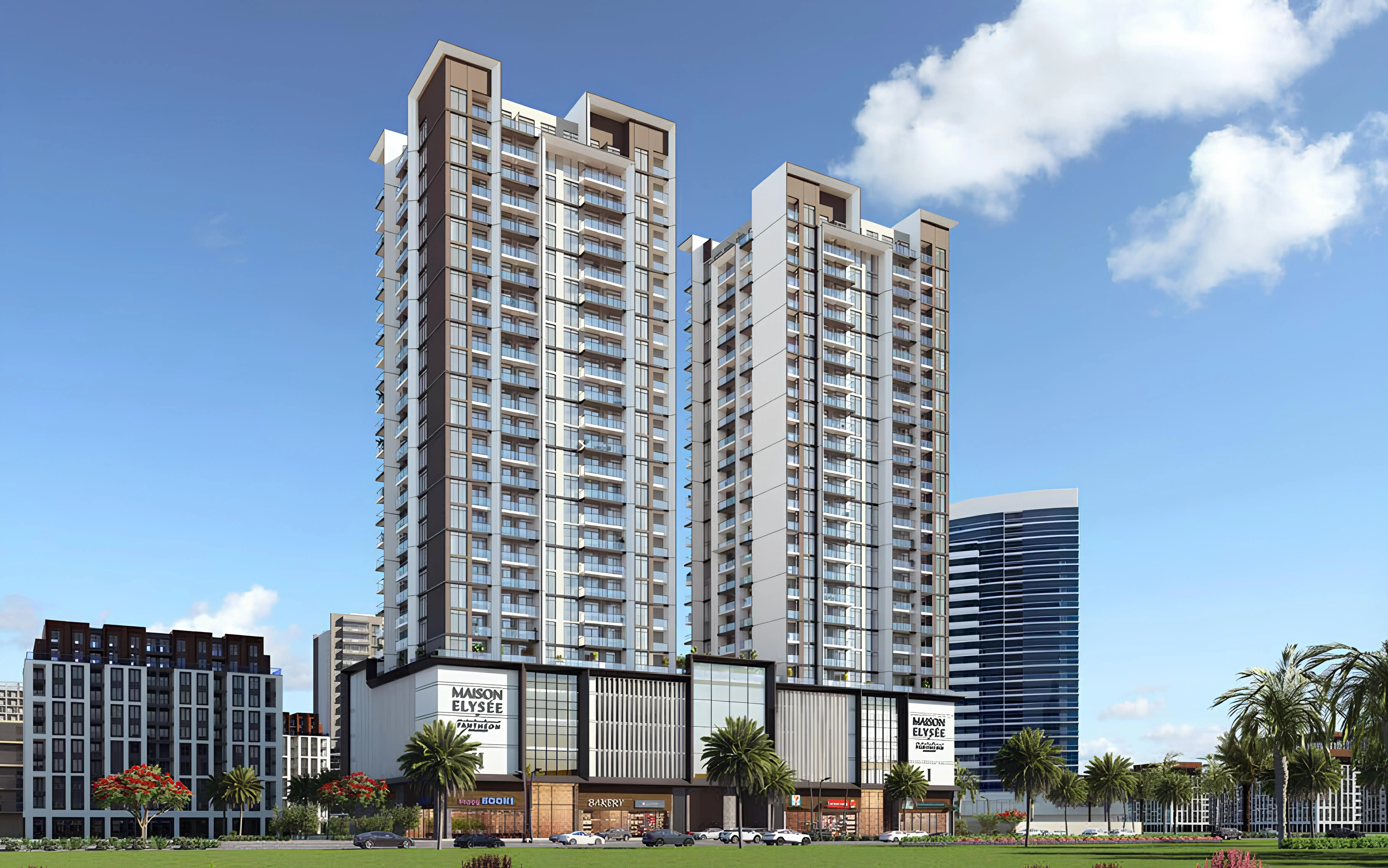 Walking paths Maison Elysee 1 is the first tower of the Maison Elysee luxury project by Pantheon, located in Jumeirah Village Circle, Dubai. Maison Elysee 1 rises twenty-two residential stories from a ground floor and a four-level podium. Its contemporary exterior is defined by clean lines and refined geometric forms.