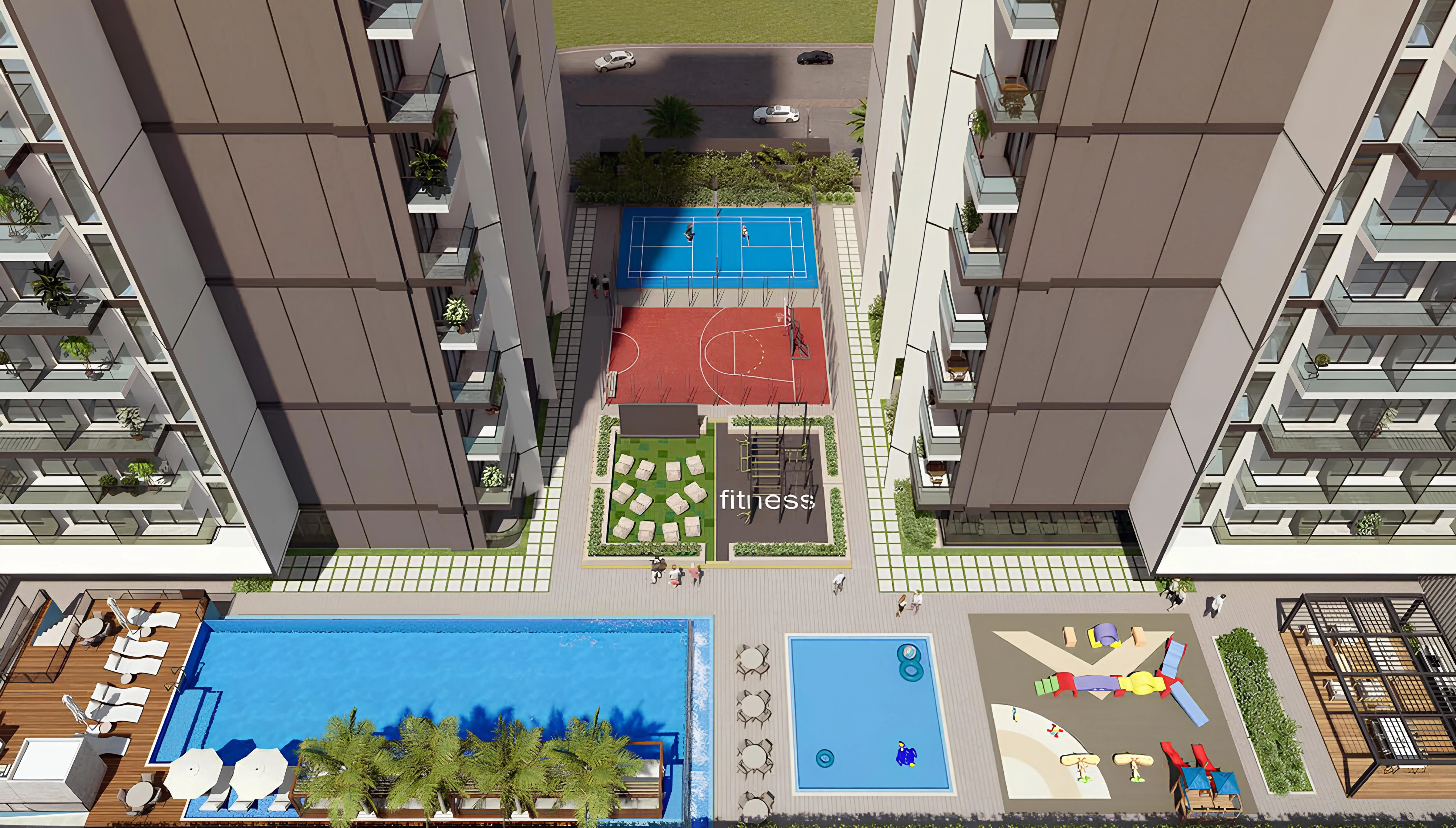 Residents of the complex enjoy a wide range of amenities, including a large swimming pool, gym, kids' play area, parking spaces, and a landscaped garden with relaxation and barbecue areas. The property is secured by round-the-clock security, ensuring comfort and peace of mind for all residents.