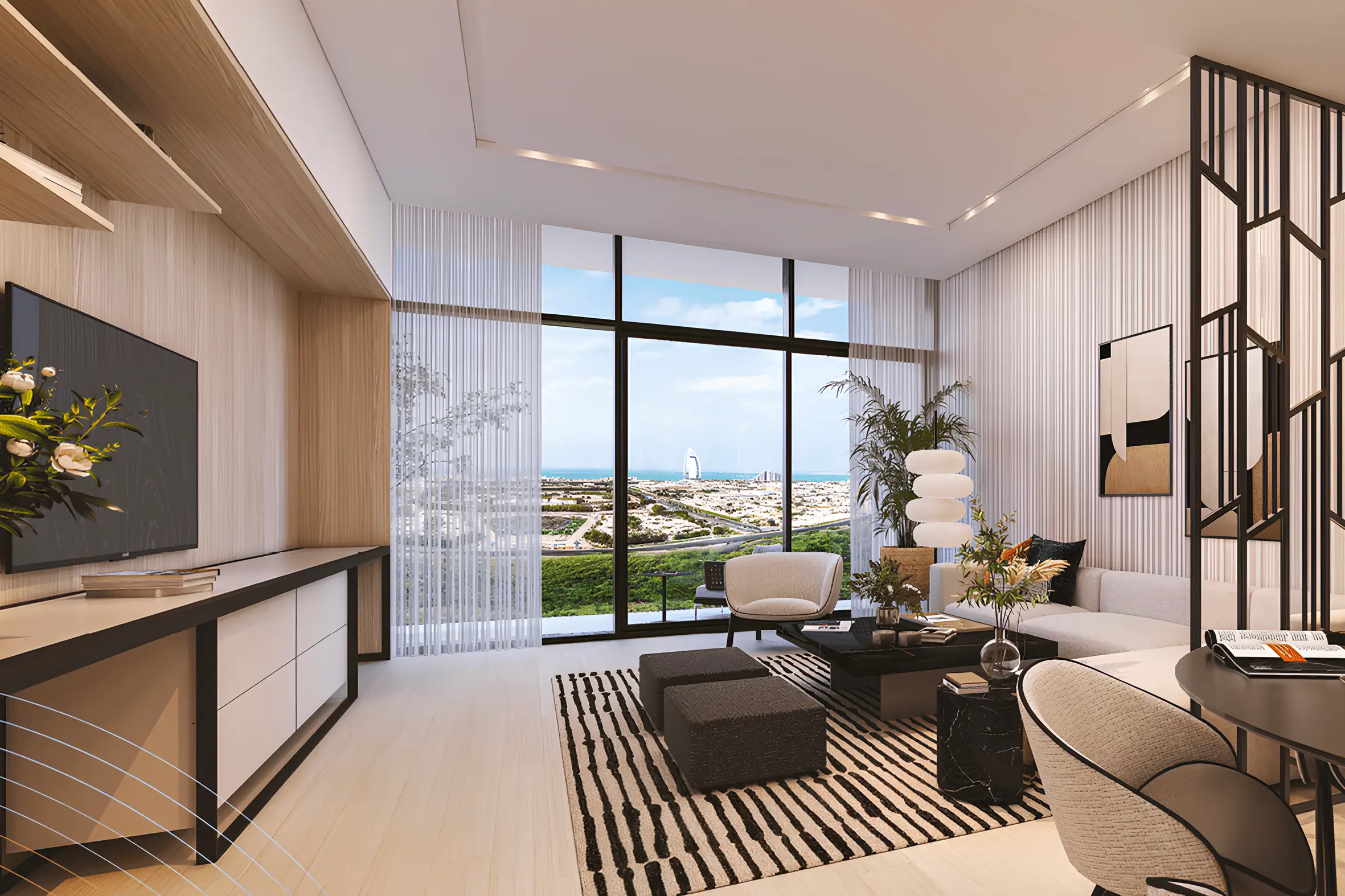 The building stands out for its clean geometry, thoughtfully designed forms, and expansive glass panels, giving the façade a light and dynamic appearance. Panoramic windows offer stunning views of the city skyline, including the Burj Khalifa and Burj Al Arab. The architecture of Mallside Residence combines aesthetics, functionality, and the high standards of premium urban design.
