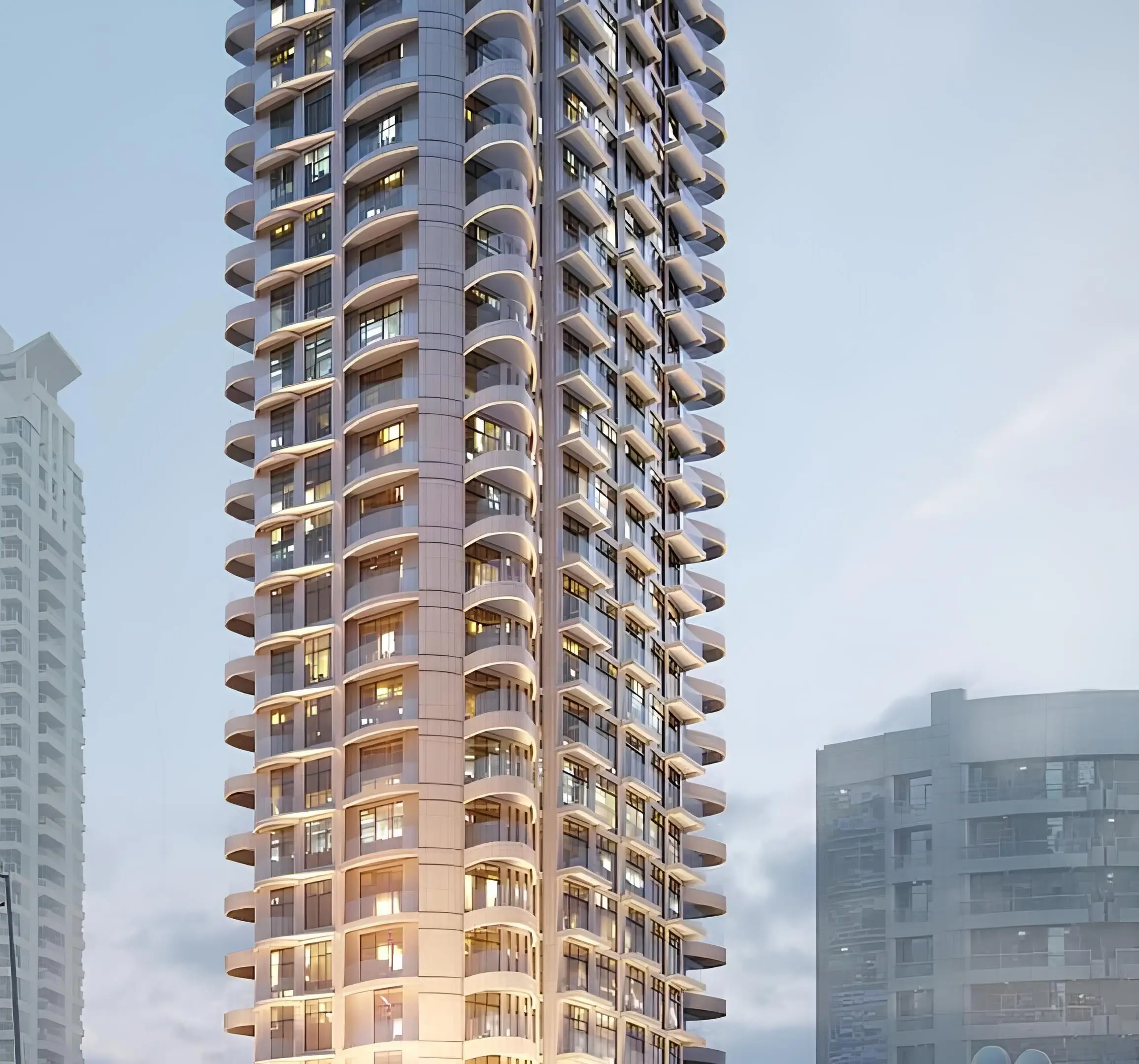 Yoga studio Marina Star is a premium-class residential complex, located in one of Dubai’s most prestigious areas. This elegant building, designed by Condor Developers, comprises twenty-six residential floors, three basement levels, a ground floor, and a rooftop. Its architecture features soft curves and rounded elements, lending it refined elegance, while gardens and greenery adorn the spacious balconies and terraces.