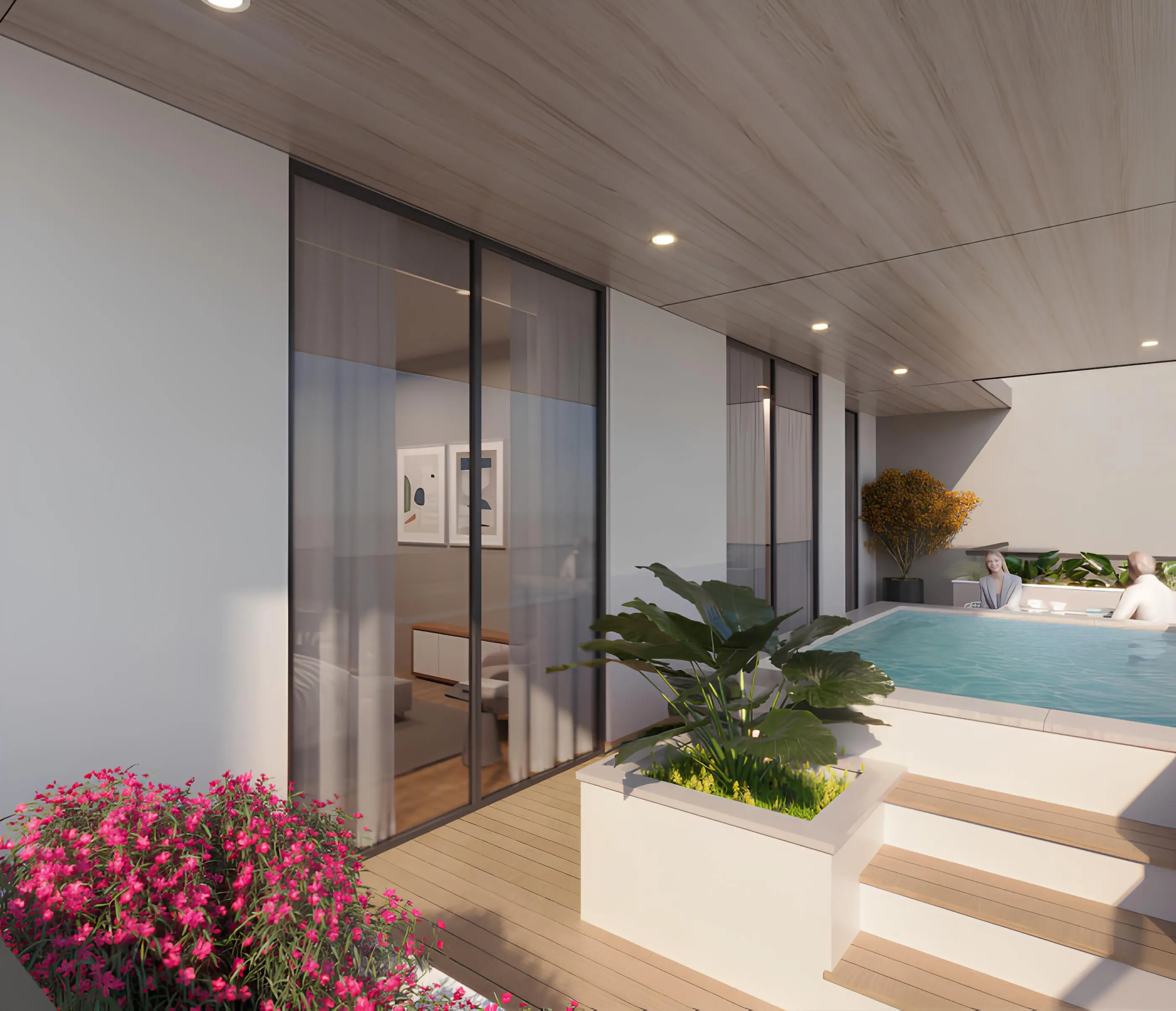 The kitchen and dining room are well-equipped and decorated in laconic colors. The comfortable luxury of the bedrooms is complemented by spacious balconies. The three-bedroom apartments have a private pool on the balcony.