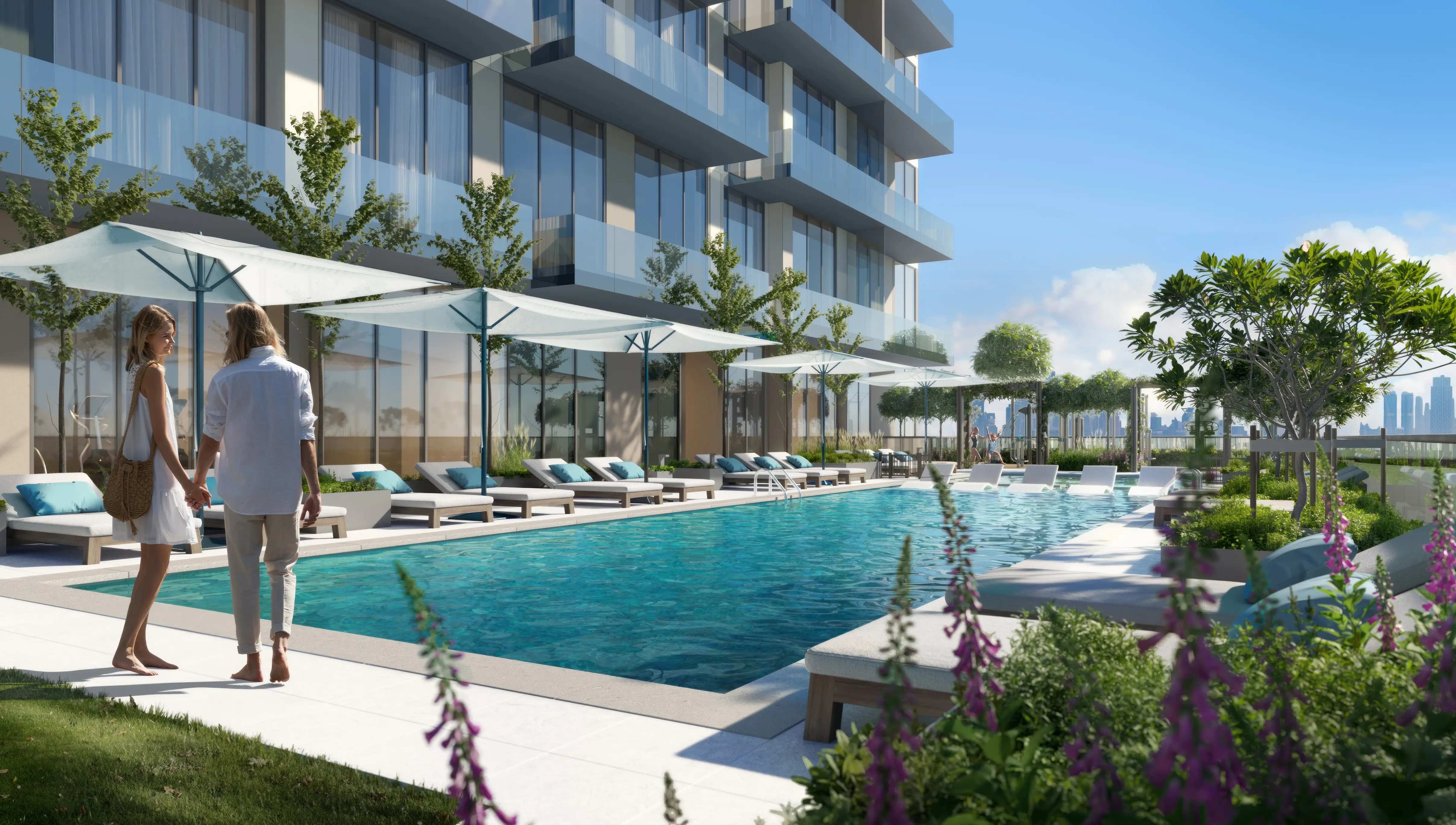 Shared Pool Ozone1 is a luxurious residential development by Object One Real Estate Development, located in the peaceful Jumeirah Village Circle area. The complex features a basement and ground level, four parking floors, twenty one residential floors, and a rooftop with amenities. The building’s architectural highlight is its panoramic windows and large balconies, which create a stunning bronze shine on the facades. The project offers studios and 1- and 2-bedroom apartments, all designed with high-quality materials in neutral tones. The elegant interiors create a luxurious yet cozy atmosphere, making each residence a peaceful retreat in a dynamic city.