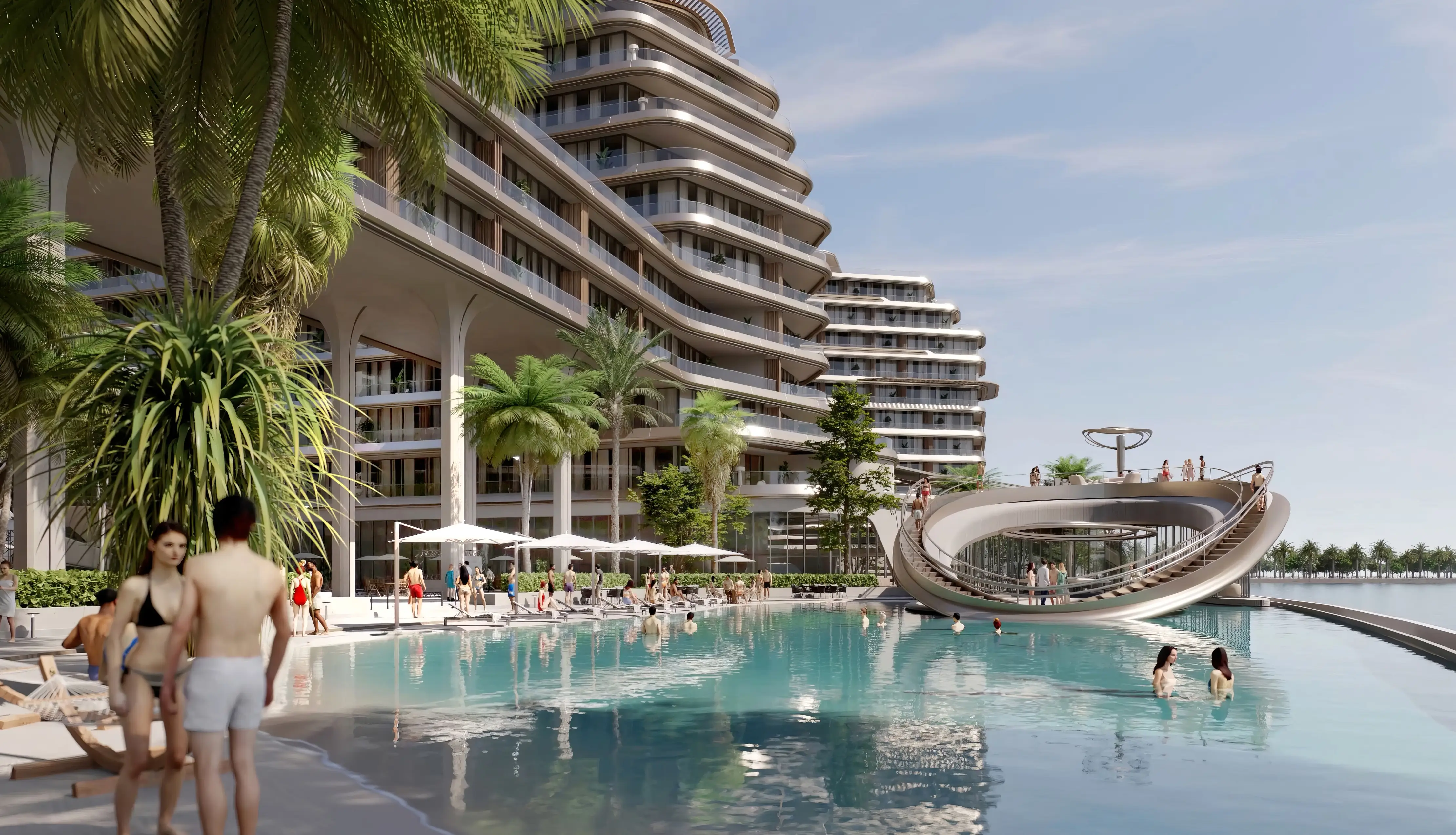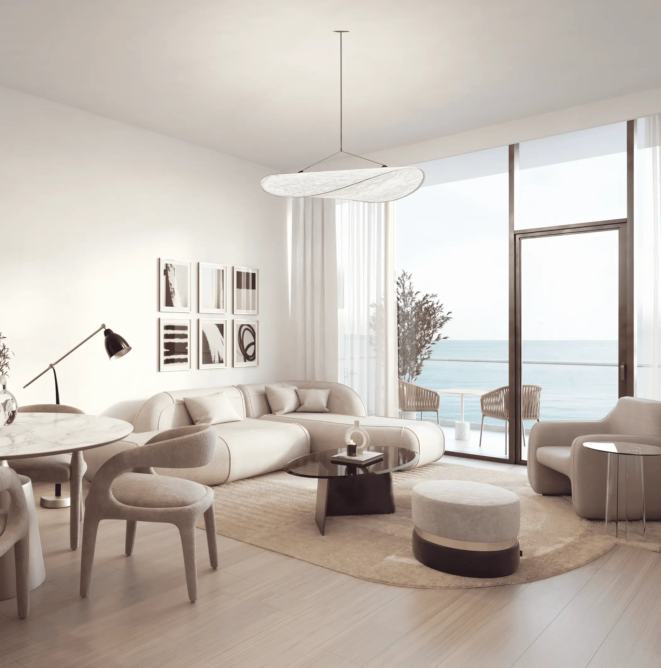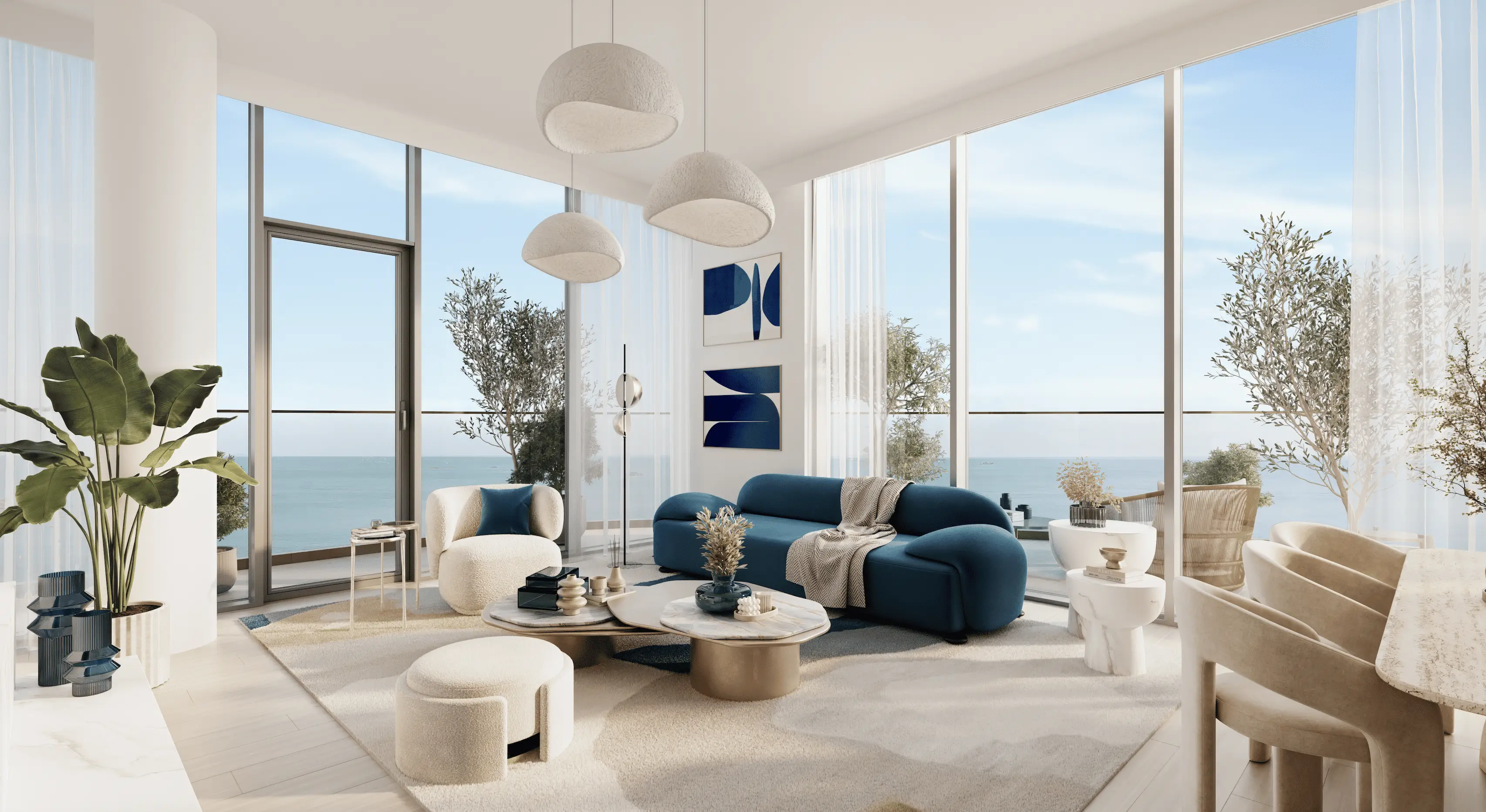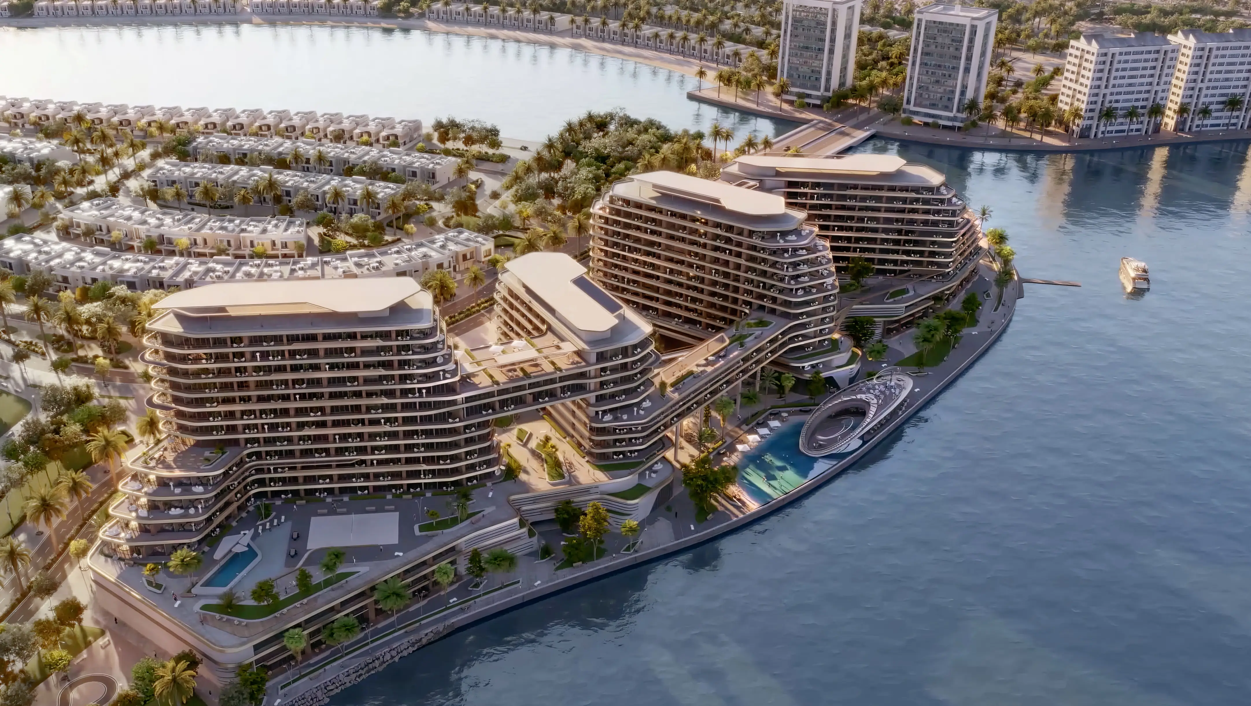 The development offers studios, 1–3 bedroom apartments, penthouses, townhouses with private gardens and sky duplexes. Spacious layouts, large windows and terraces emphasize lagoon views, while interiors in light neutral tones create a calm and contemporary atmosphere.