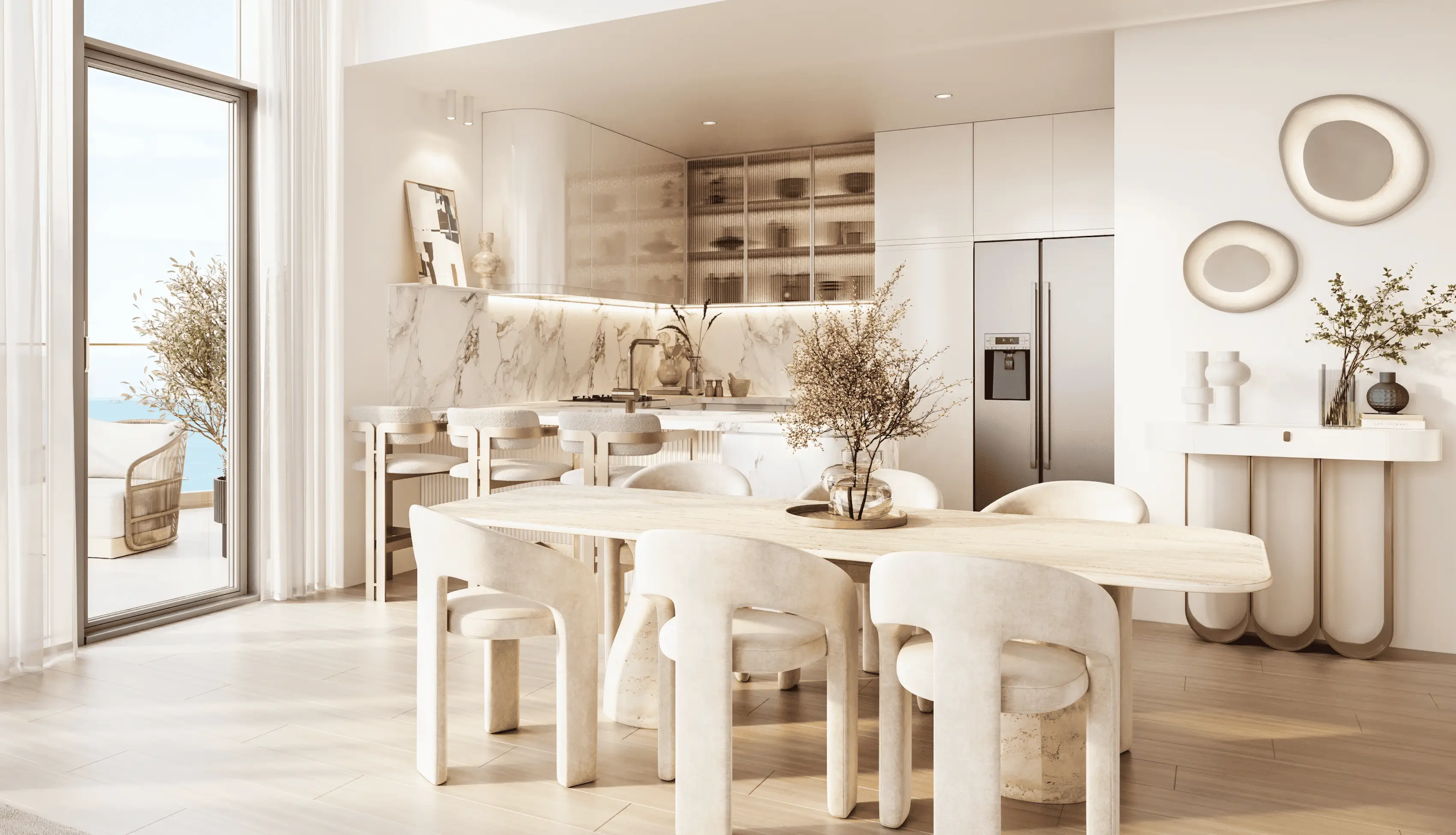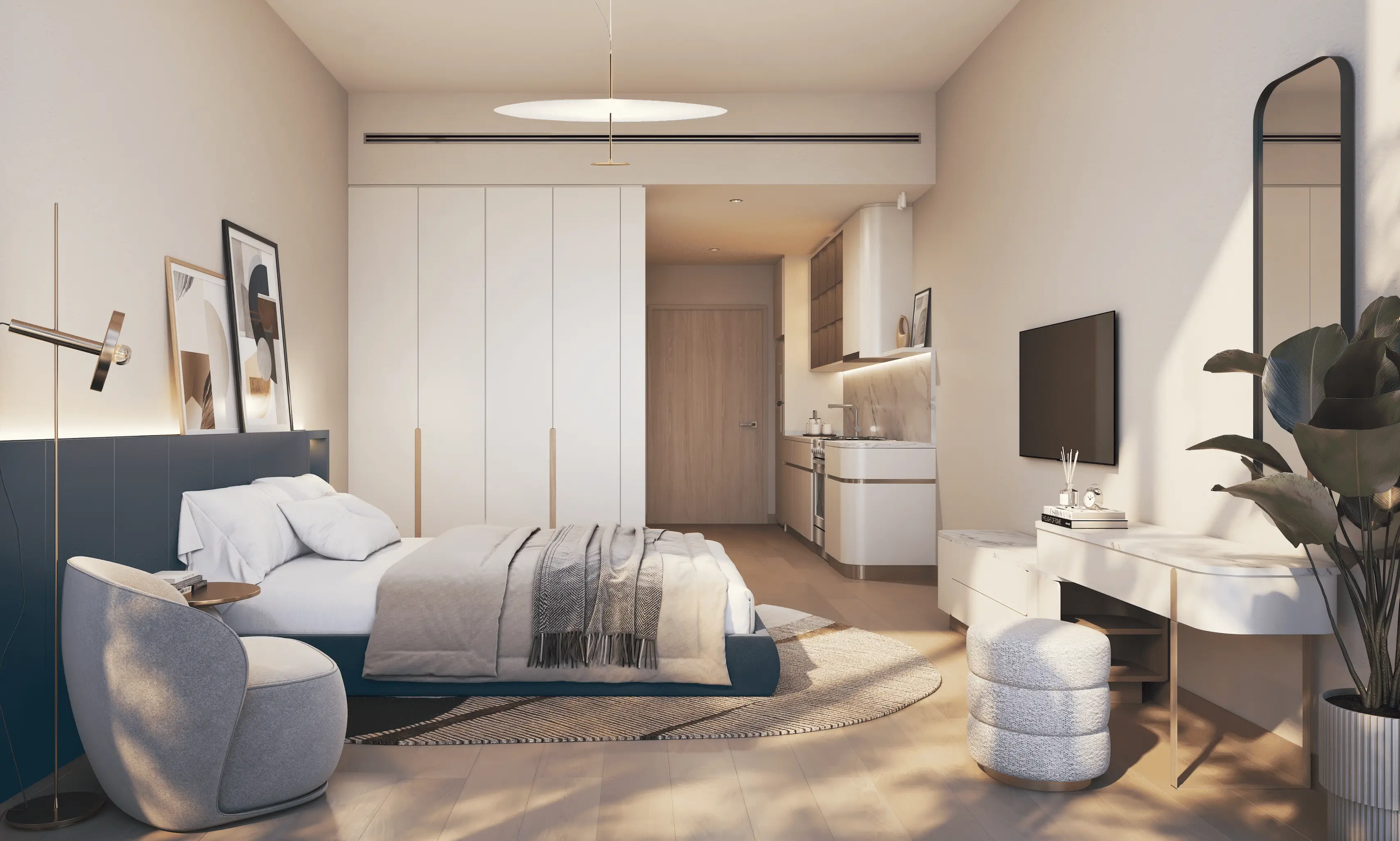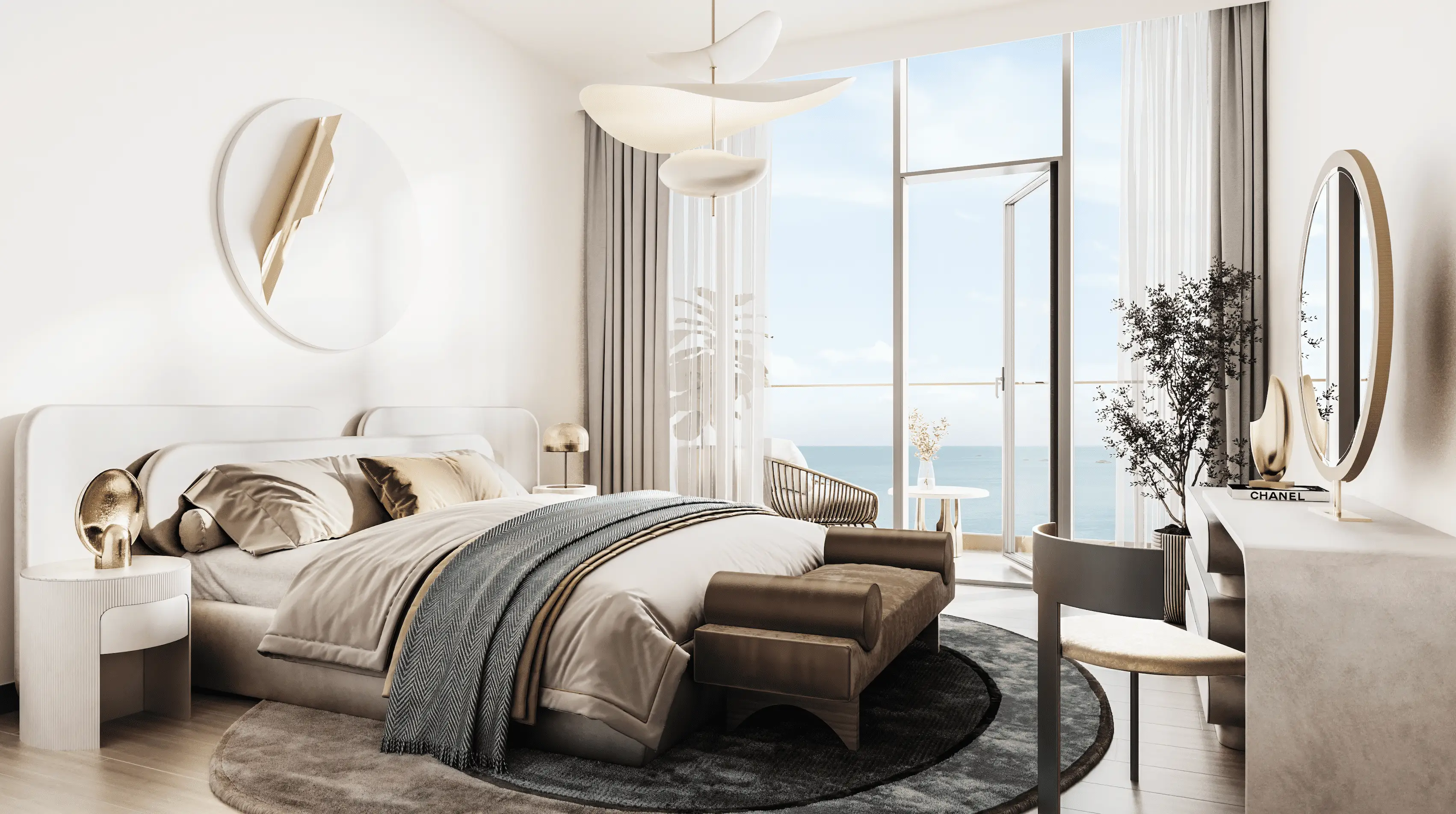 The development offers studios, 1–3 bedroom apartments, penthouses, townhouses with private gardens and sky duplexes. Spacious layouts, large windows and terraces emphasize lagoon views, while interiors in light neutral tones create a calm and contemporary atmosphere.
