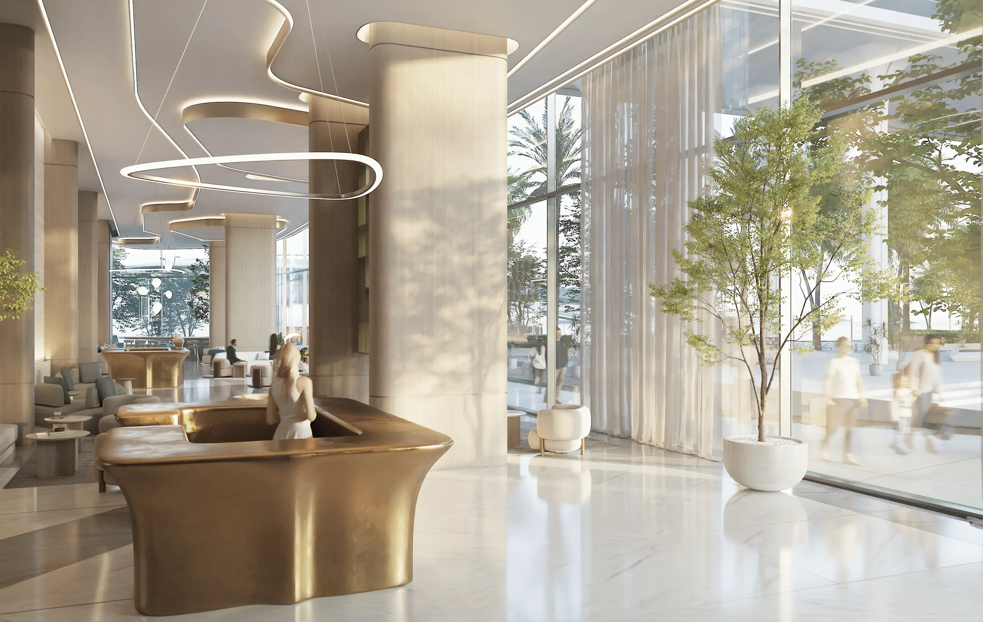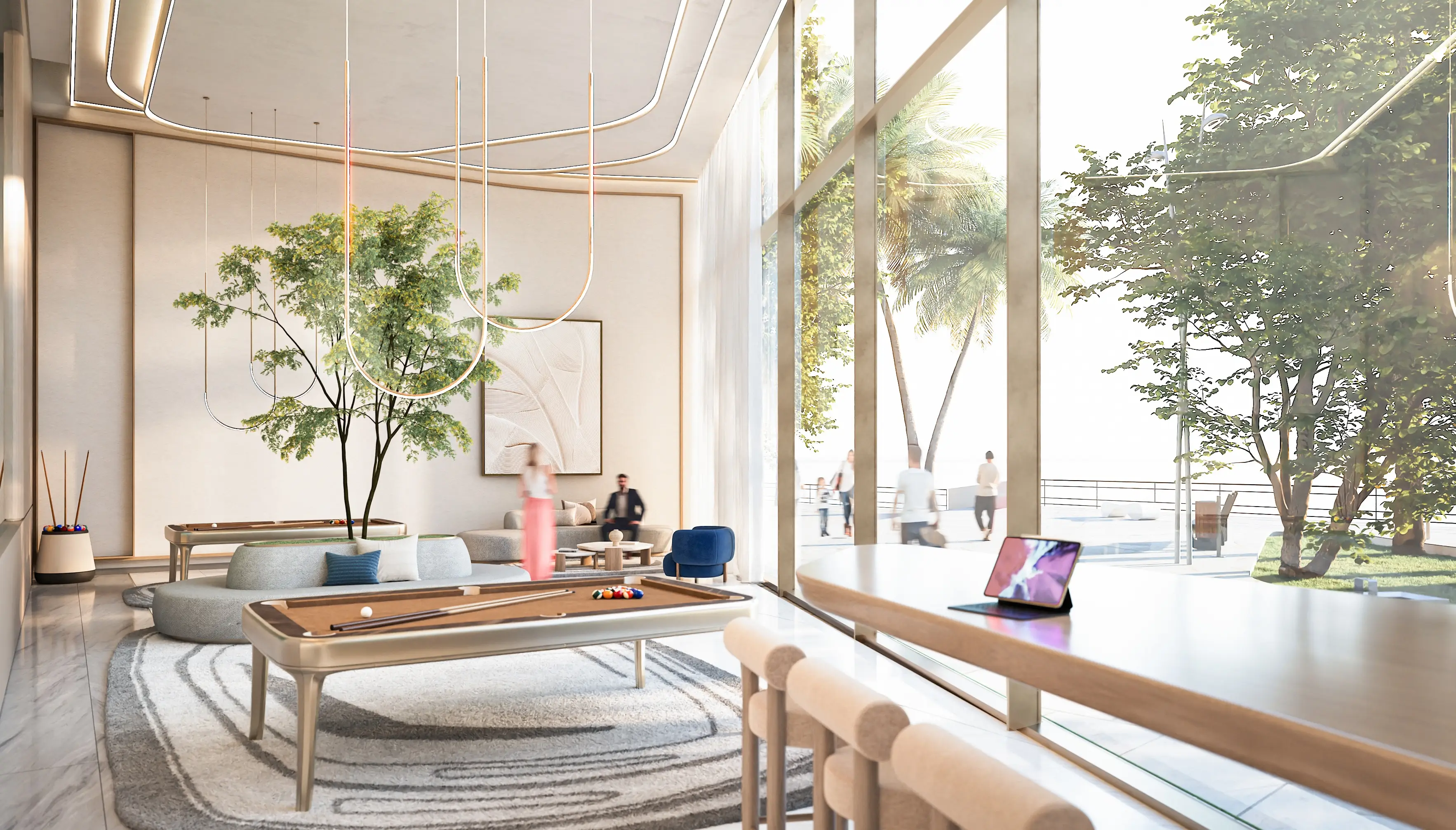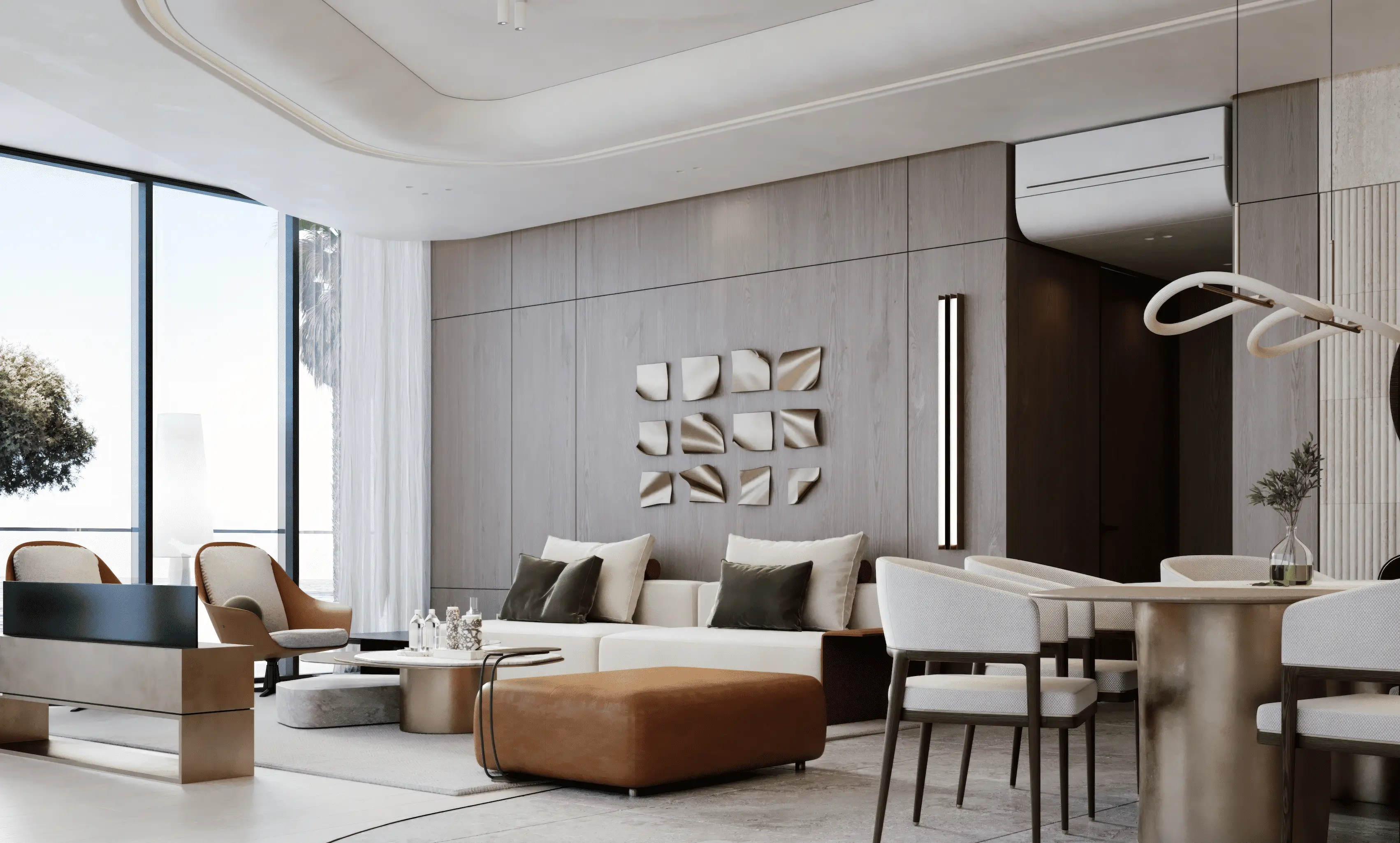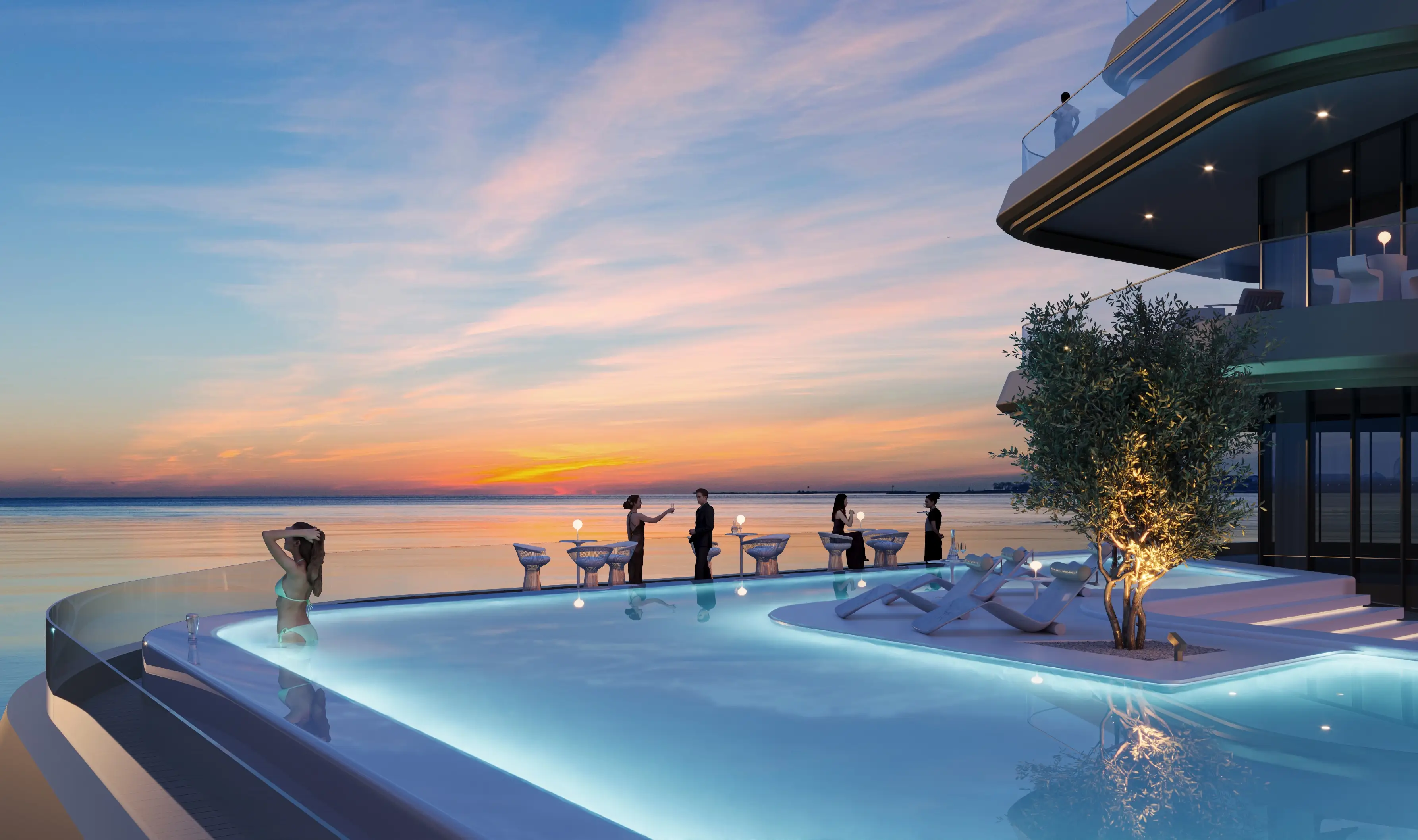 The development offers studios, 1–3 bedroom apartments, penthouses, townhouses with private gardens and sky duplexes. Spacious layouts, large windows and terraces emphasize lagoon views, while interiors in light neutral tones create a calm and contemporary atmosphere.
