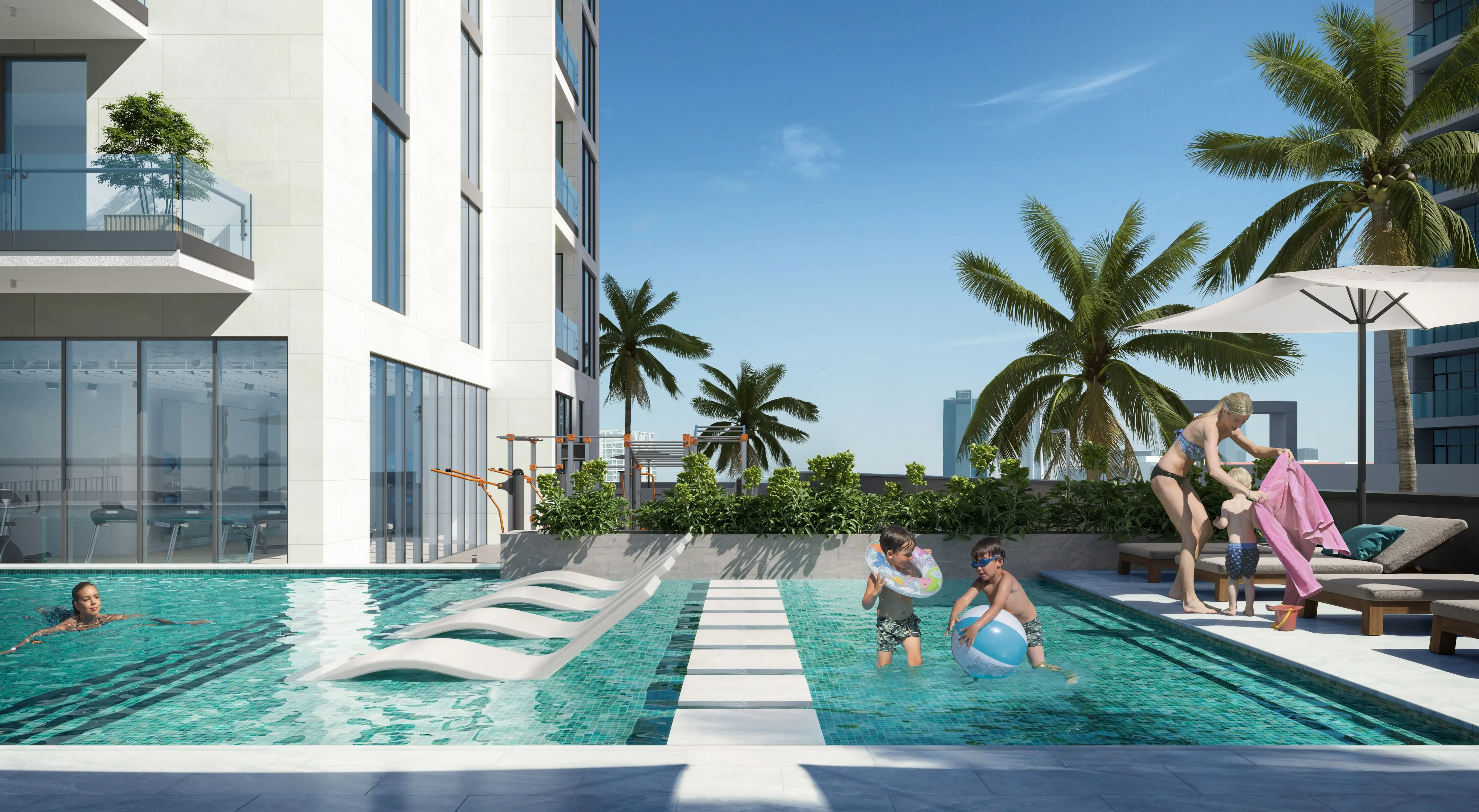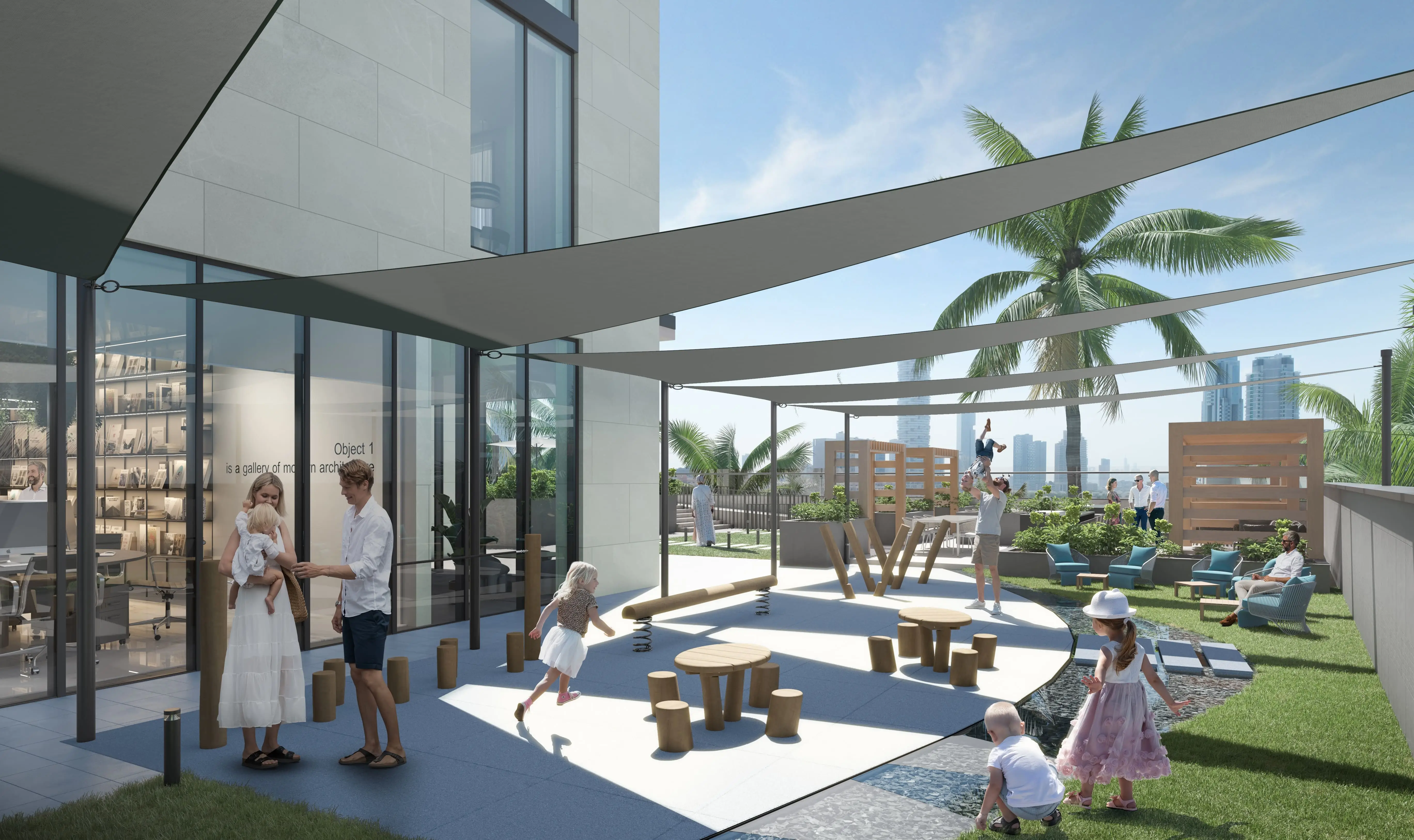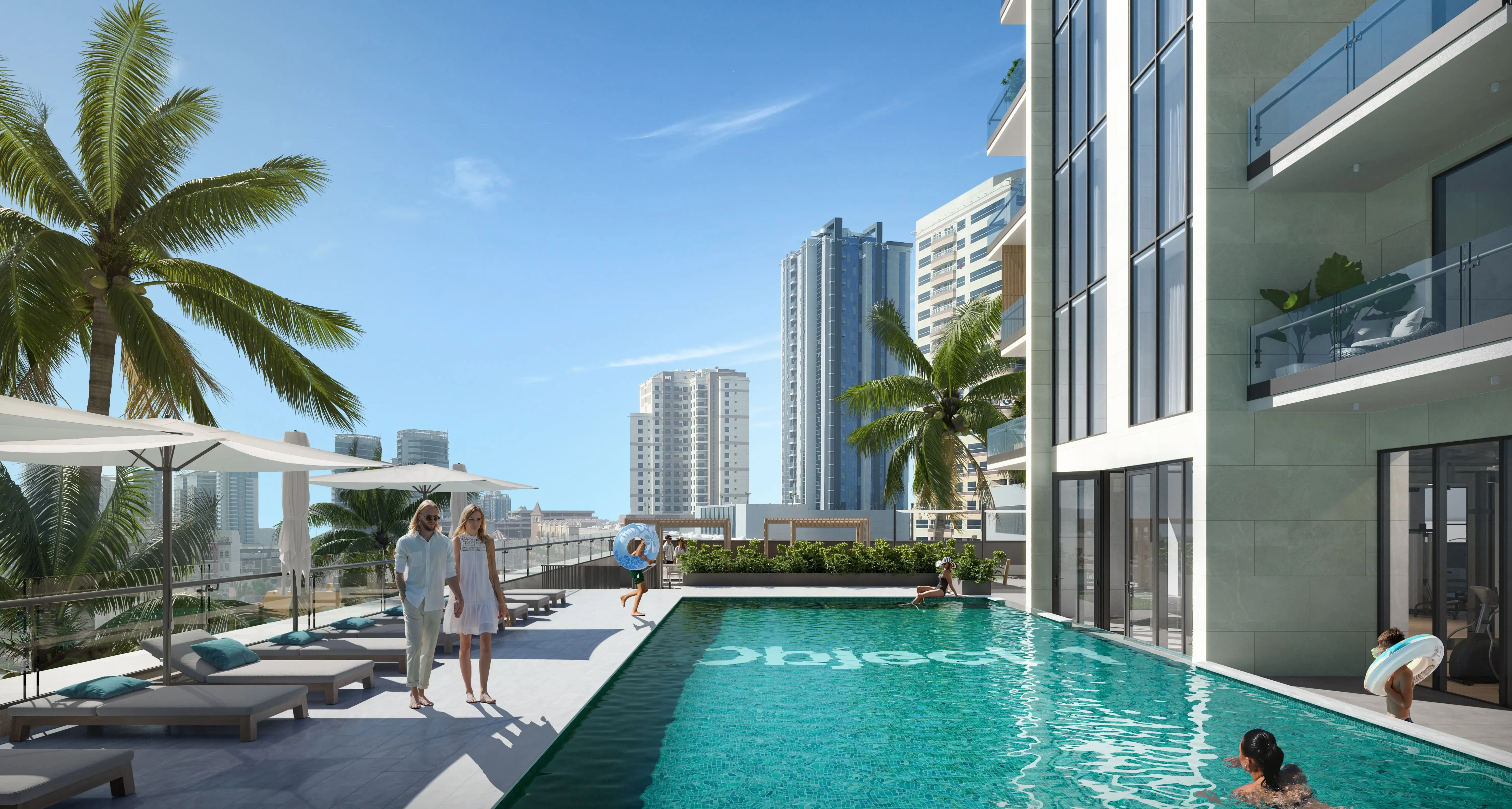 RA1N features an extensive range of amenities, including a swimming pool with a terrace and sun loungers, a children’s pool, a gym, a clubhouse, a library, a coworking area, a cinema, a game room, yoga and fitness zones, as well as a barbecue area and open-air kitchen. The podium level features landscaped gardens, walking paths, and lounge spaces. Families can enjoy children’s play areas, while the rooftop includes private terraces and pools in select exclusive residences.