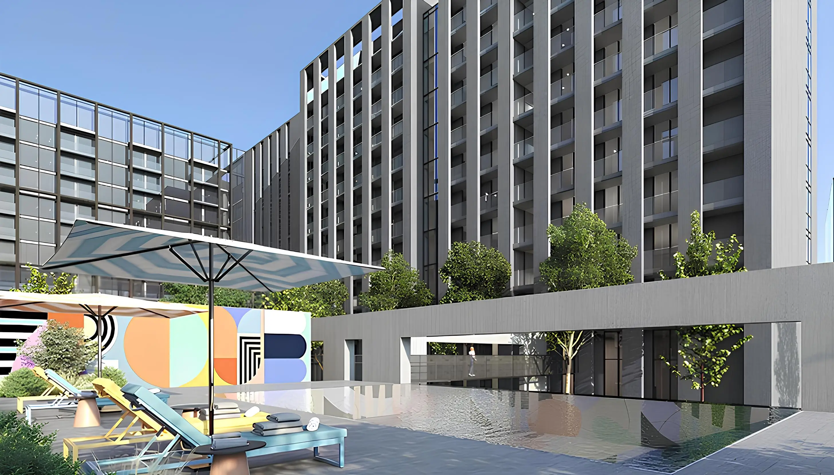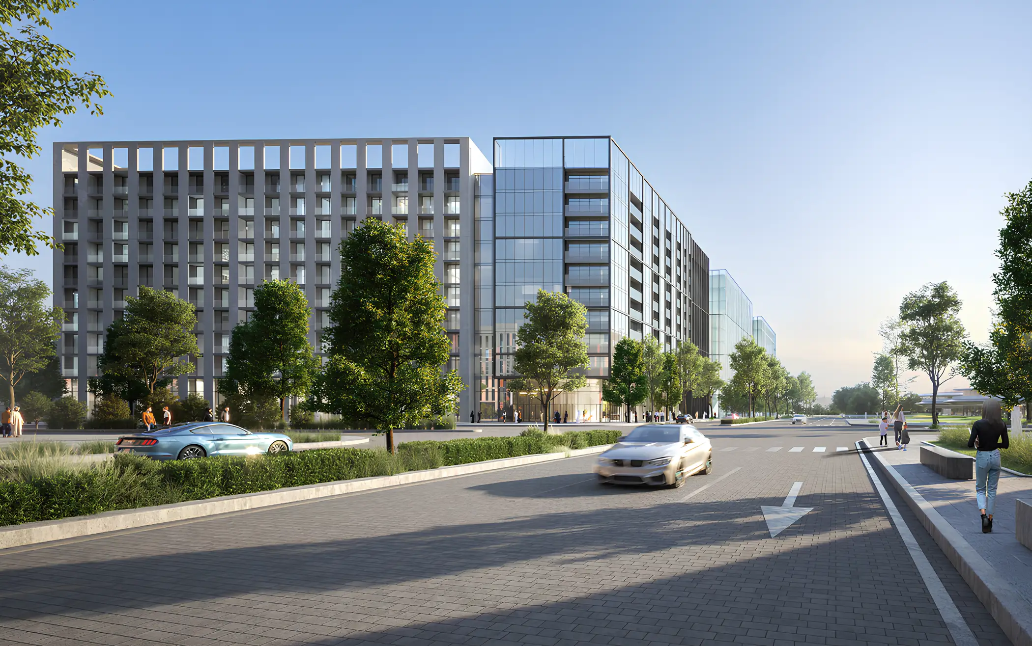 Walking paths Rove Home 2 Aljada - residential complex by the Arada Properties, the second part of Rove Home project. It is the first ever residences from the Rove brand, which blends a unique and contemporary aesthetic with impressive facilities and a location in the heart of one of the Middle East’s most welcoming cities, in a vibrant Aljada community, in Sharjah. The project features a contemporary architectural and design style, characterized by clear lines, open areas, and an abundance of natural light. The building consist of basement level, ground floor and nine residential floors.
