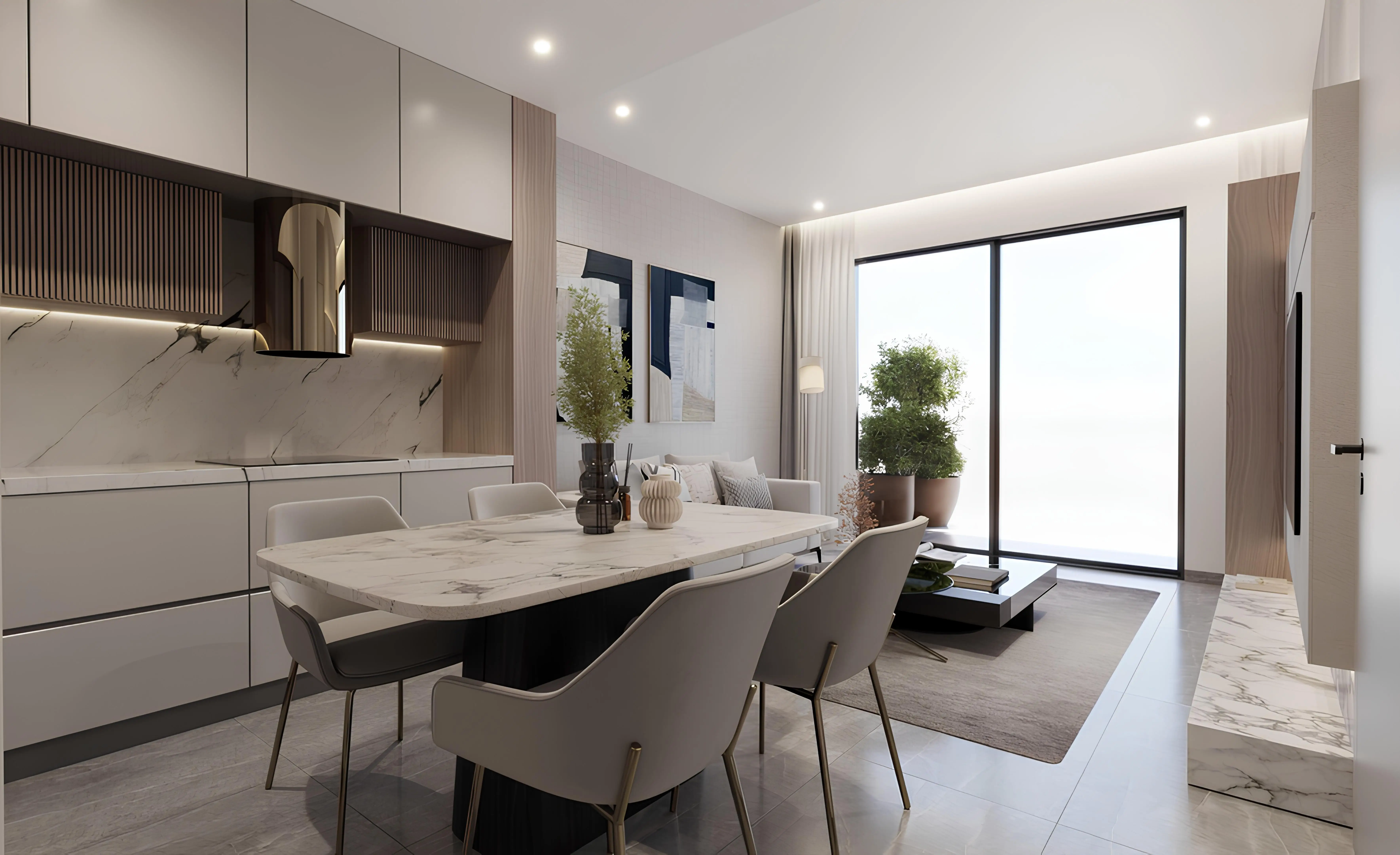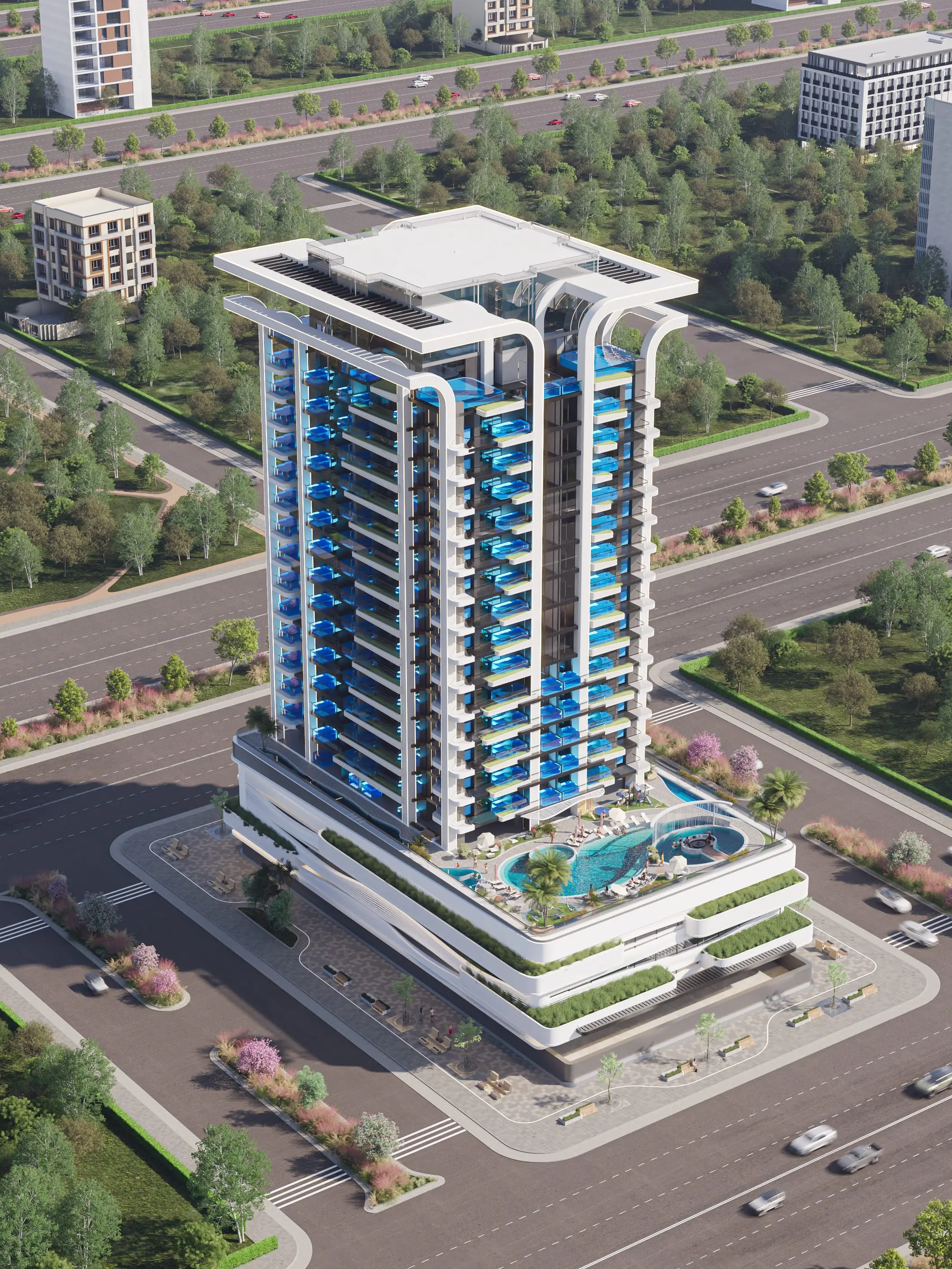 The favorable location in the JVC area guarantees a comfortable atmosphere on the territory of the complex, as well as quick communication with key points of Dubai. Just a 5-minute drive away are such iconic locations as Circle Mall, Global Village entertainment complex, the famous Dubai Miracle Garden and Dubai Butterfly Garden parks and the popular coastal area of Dubai Marina. The Business Bay and Downtown business districts, Burj Khalifa and the largest shopping and entertainment center in the world - Dubai Mall are all within 15 minutes.
