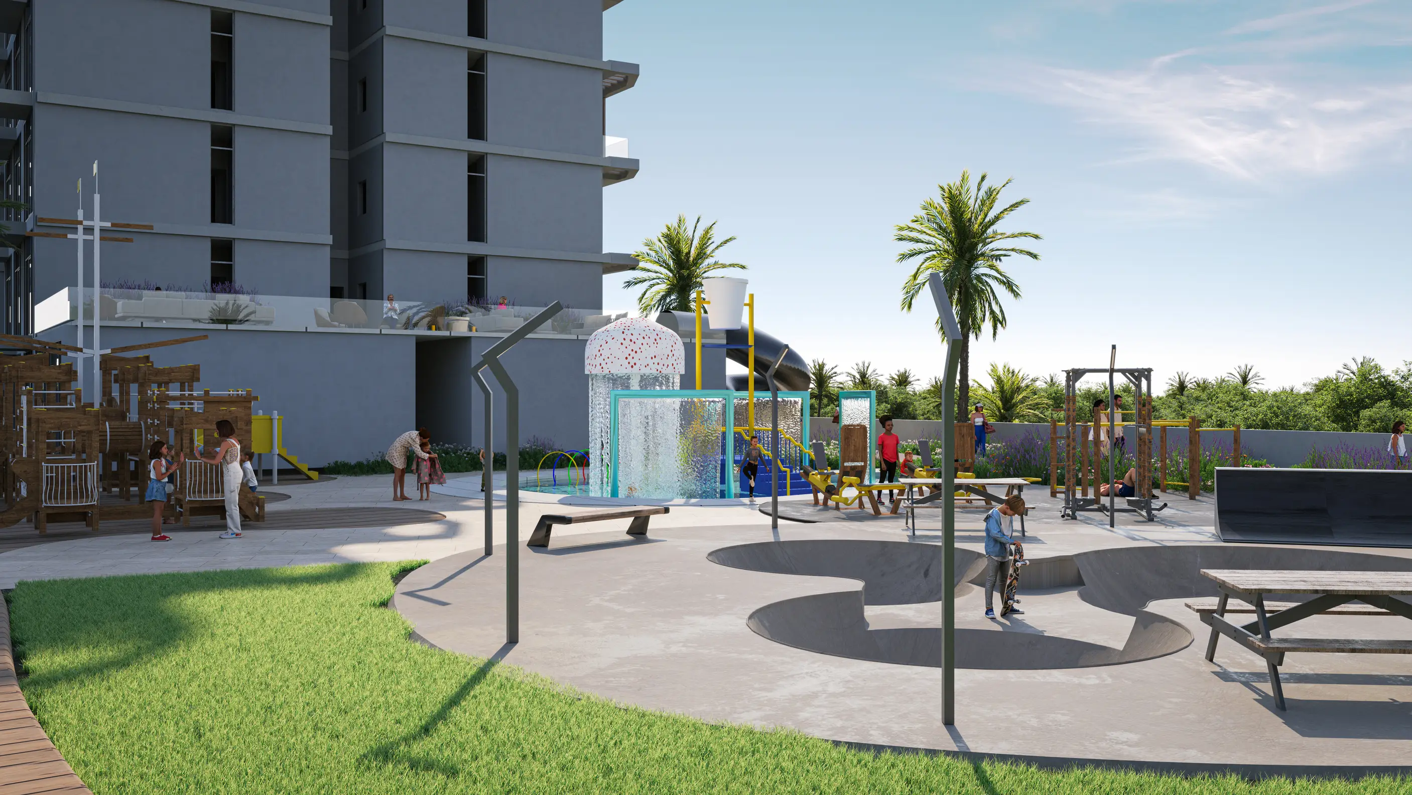 The complex features a gym, a swimming pool with city views, children's playgrounds, a landscaped garden with seating and barbecue areas, and walking paths.