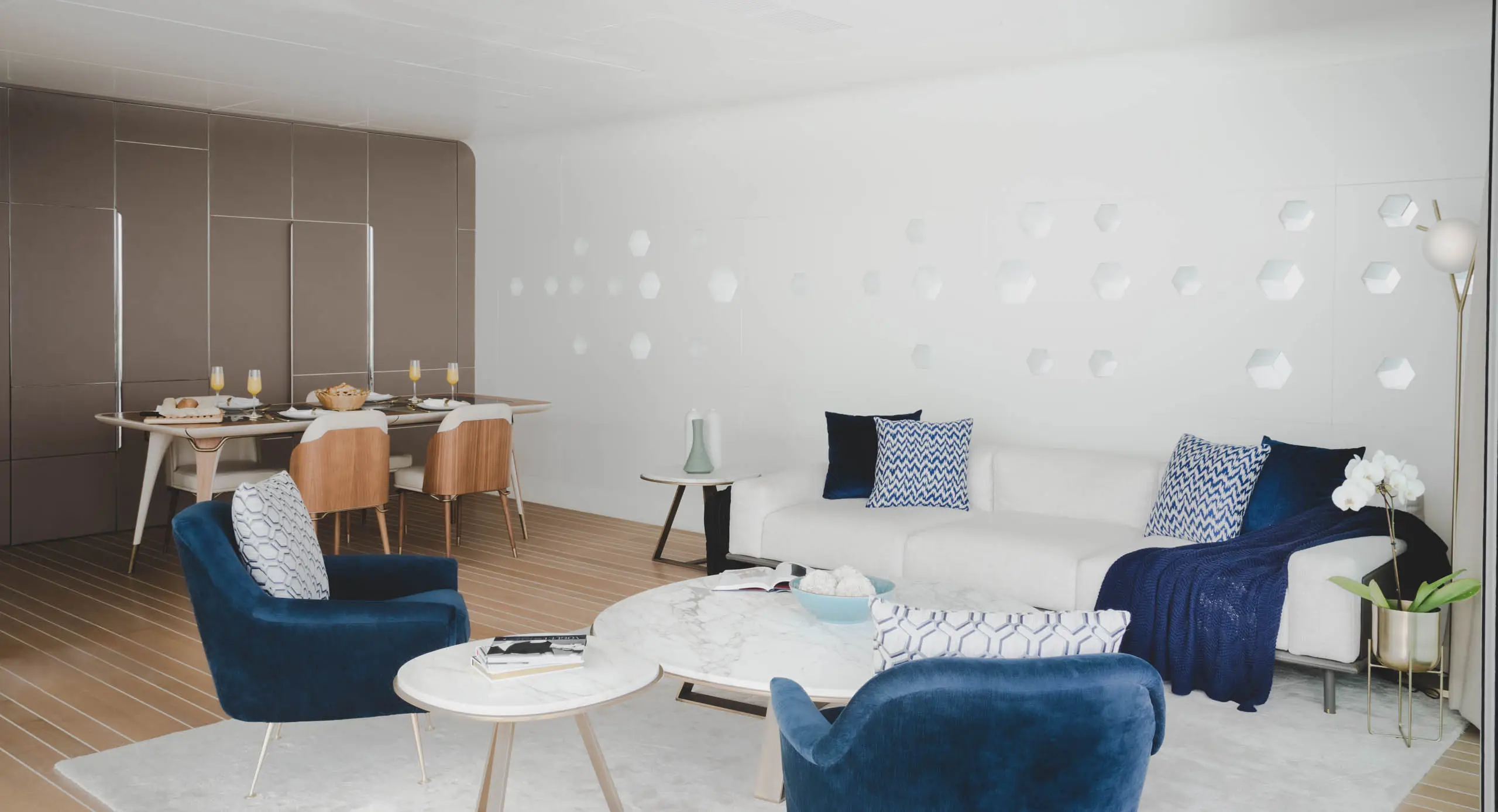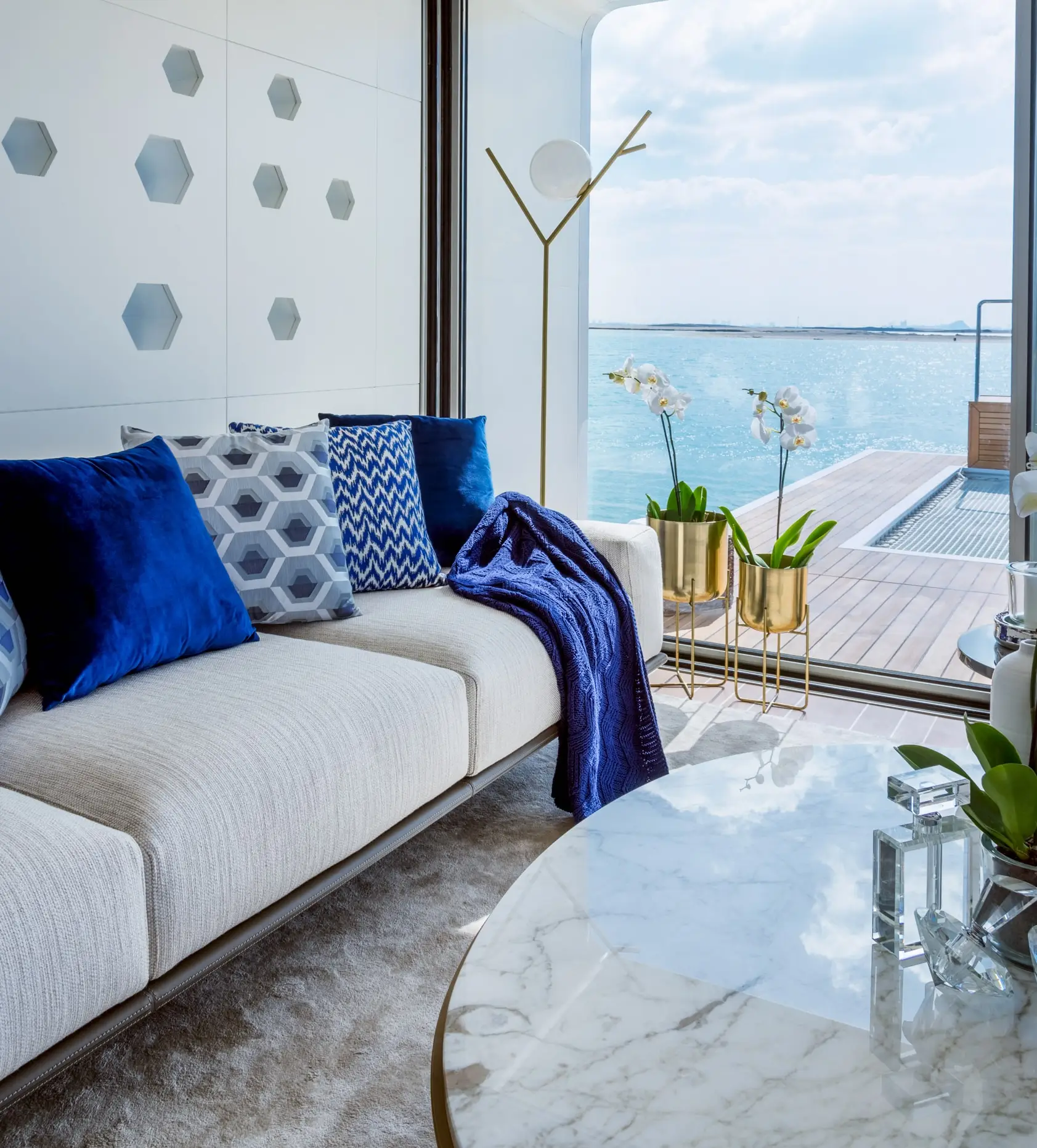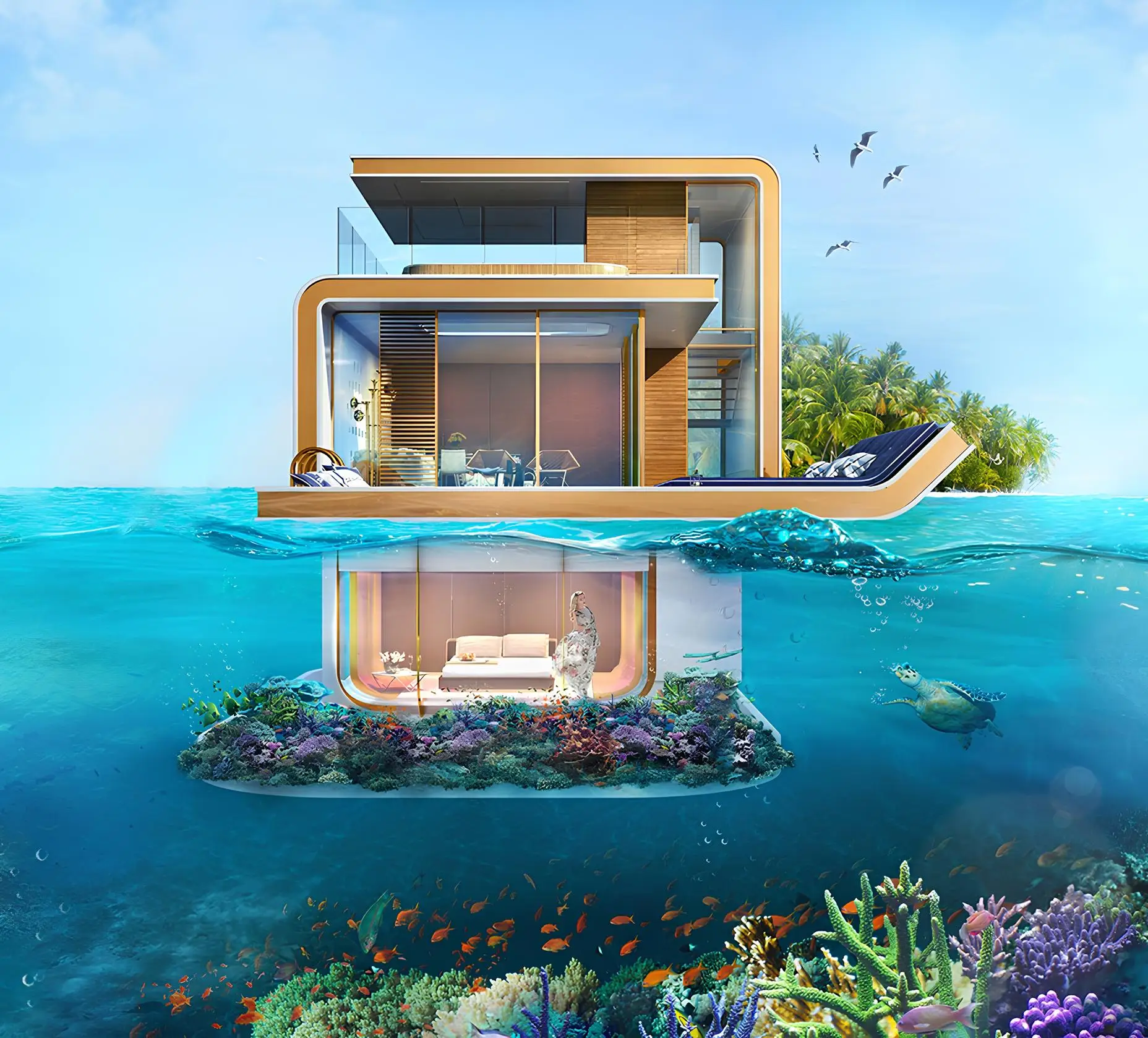 Private pool The Floating Seahorse is a community of ultra-luxury floating villas on The World Islands archipelago by The Heart of Europe. The villas are located on St. Petersburg Island. They are the epitome of timeless design and craftsmanship. Each villa in the community is a tiny island surrounded by water and connected to neighboring private islands. This residence maintains a balance between secluded island living and a sense of community. The villas consist of three levels, including a spectacular underwater floor. Also equipped with unique special features, state-of-the-art technology and open climate zones, including a smart home system. The modern interiors are designed using gentle hues to create a cozy atmosphere. Each villa has a large glass wall that offers breathtaking views of the underwater world.