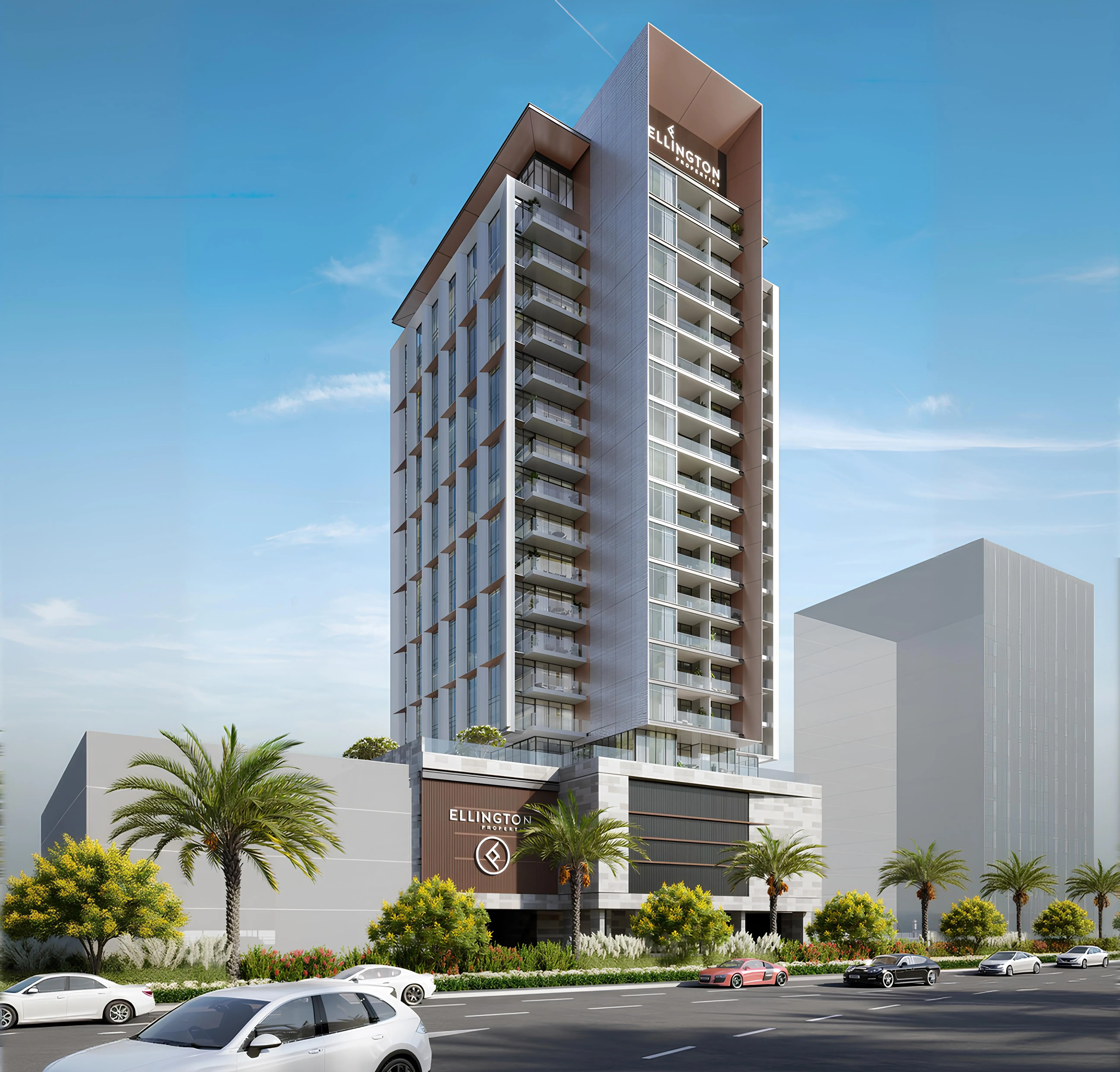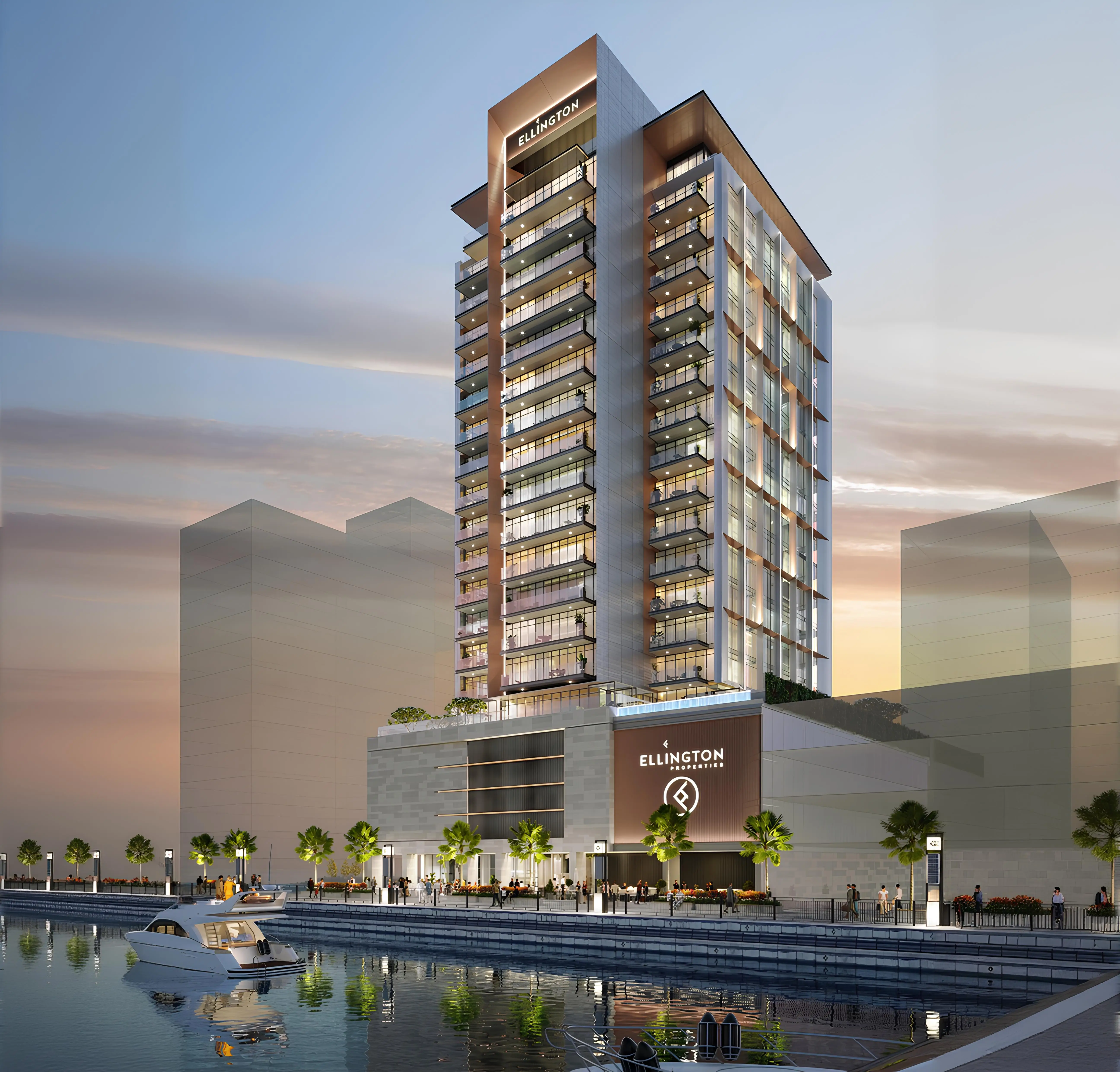 Shared gym & fitness The Quayside is a luxury project of Ellington Properties in the heart of Business Bay, featuring strict bronze-colored facade lines and geometric shapes. The architecture of the building stands out with a ground floor, 3 chic podium floors and 16 residential floors.