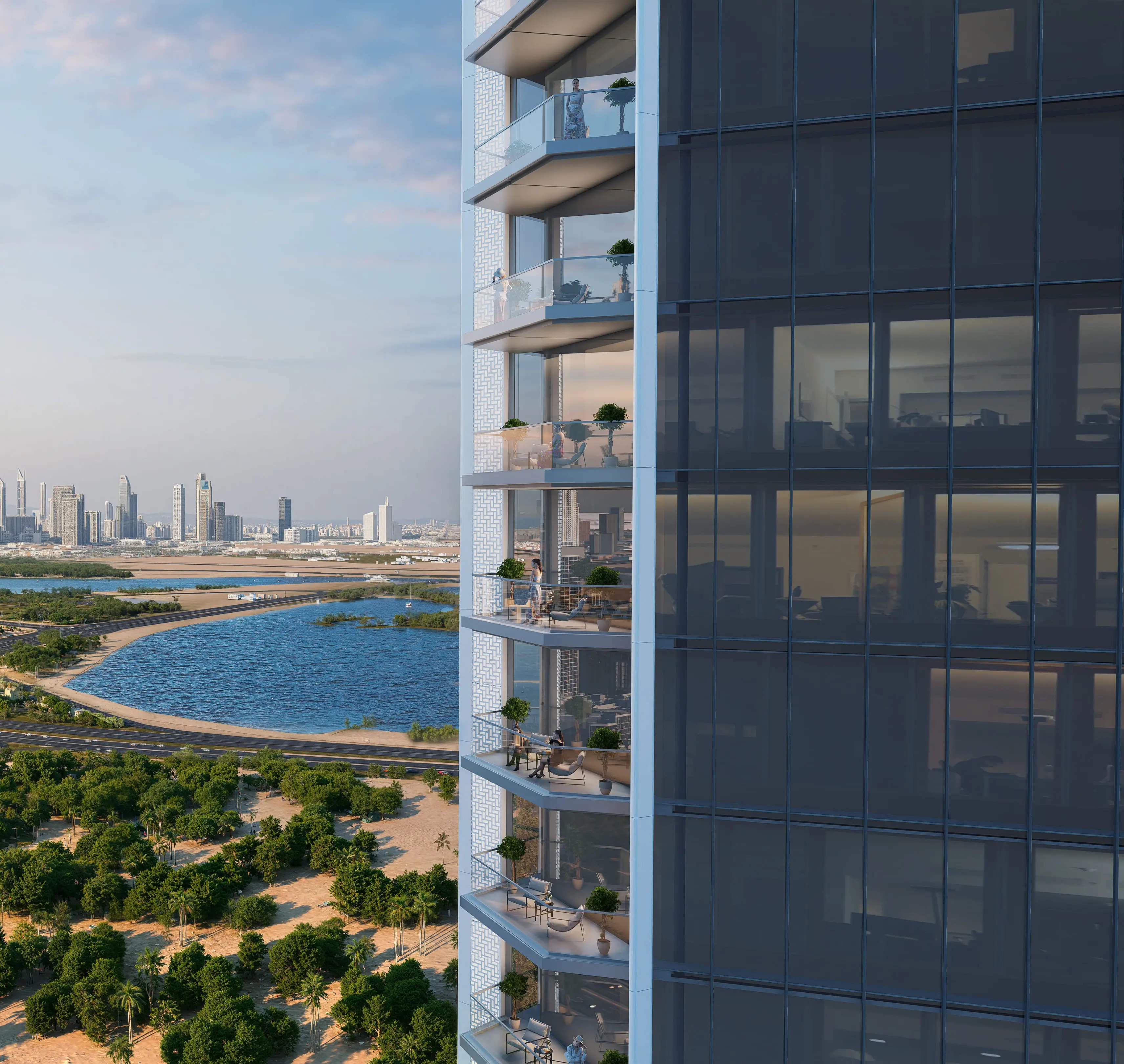 Situated on Sheikh Zayed Road, the tower provides quick access to Dubai’s key destinations. Dubai Marina, Palm Jumeirah, Emirates Golf Course, Mall of the Emirates, and Ibn Battuta Shopping Mall are just 10 minutes away by car. Downtown Dubai, Riverland Dubai, Legoland Dubai, and the international airports DXB and DWC can be reached in around 20 minutes.