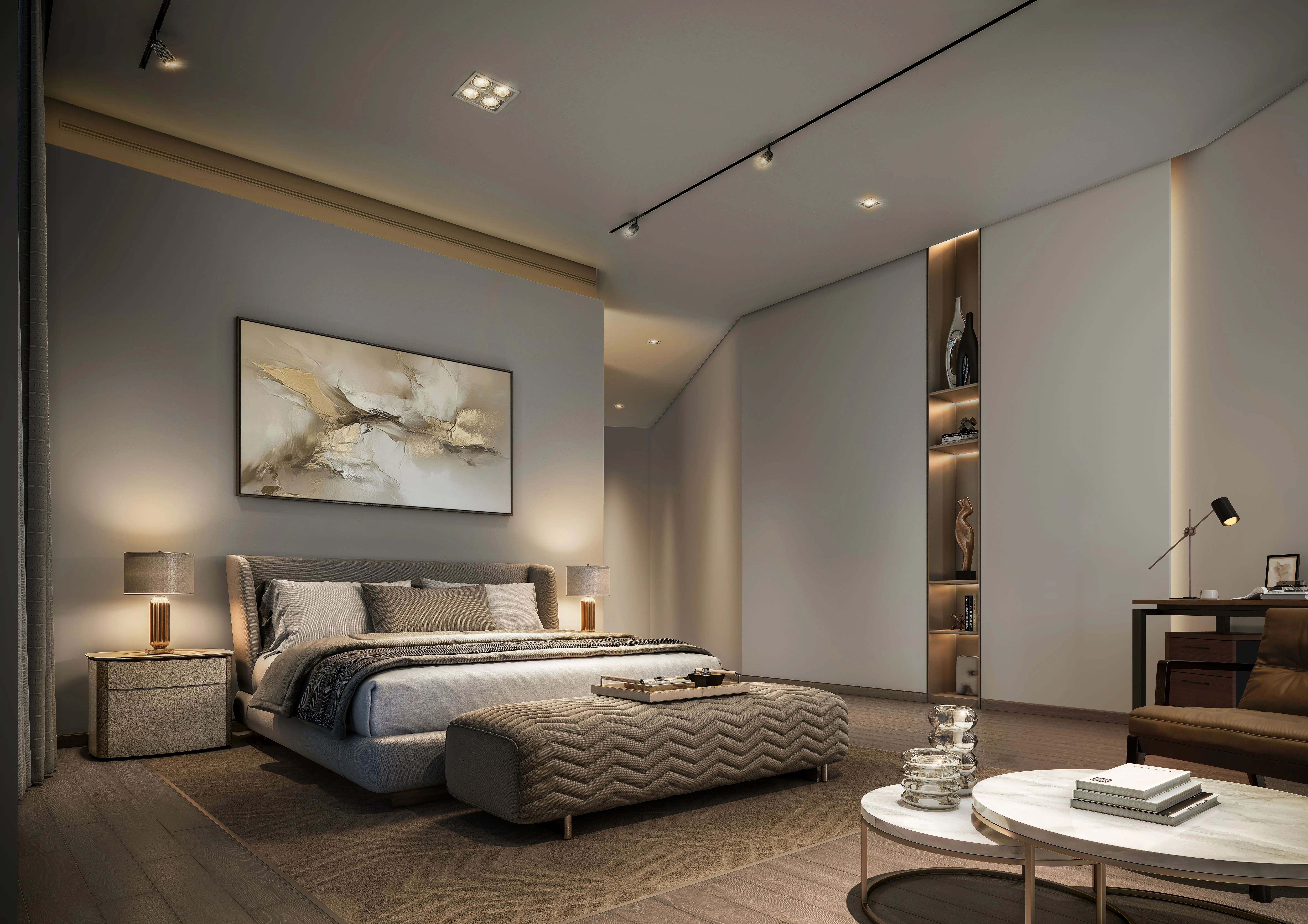 The project offers luxurious four- and five-bedroom apartments. The design follows a contemporary style, with interiors crafted from natural materials in soft white and beige tones. Floor-to-ceiling windows provide breathtaking views of the sea, Palm Jumeirah, and the city skyline.