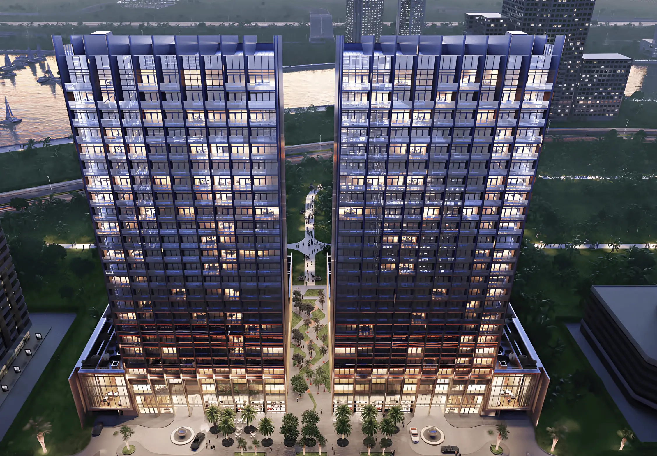 Walking paths The Sterling is an elegant, modern, and prestigious collection of residences, offering luxury, comfort, and convenience to its inhabitants. The complex comprises two 25-story elegant residential buildings, East House and West House, featuring studios, 1-4 bedroom apartments, 4-bedroom townhouses, and exclusive penthouses. The striking architecture gives the buildings a unique character, while the thoughtfully designed layouts provide spacious and functional interiors.