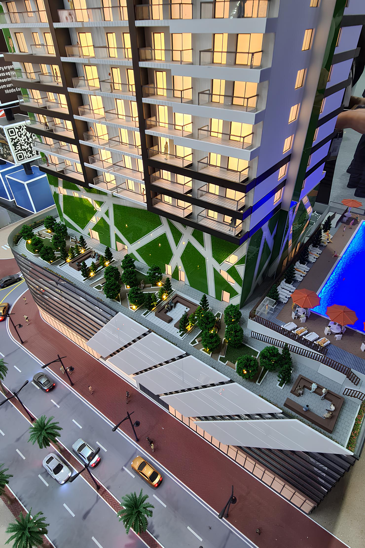 The complex has an excellent location. Dubai Marina can be reached in 10 minutes, Downtown Dubai in 15 minutes, and Palm Jumeirah in 18 minutes. Dubai International Airport is 24 minutes away.