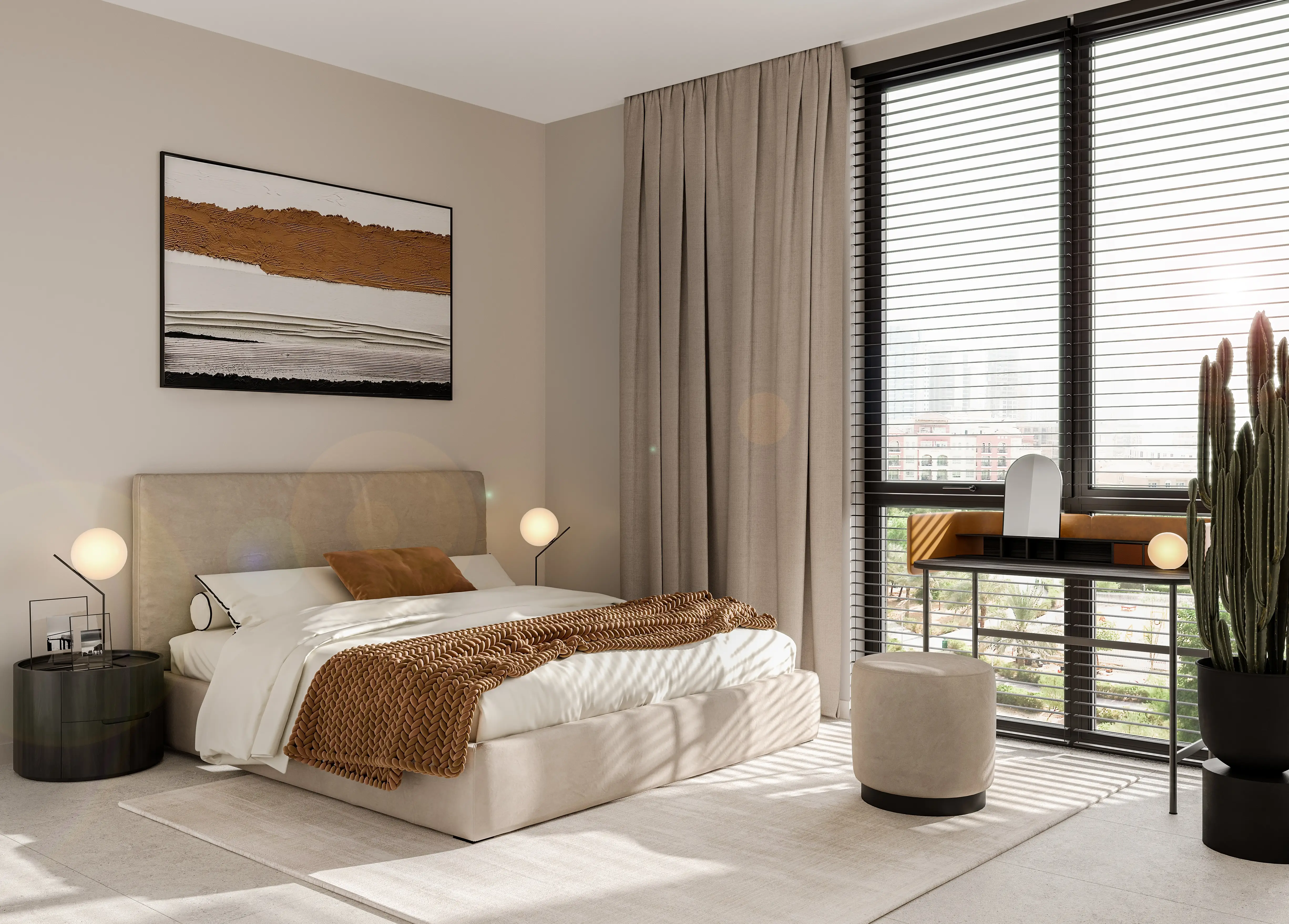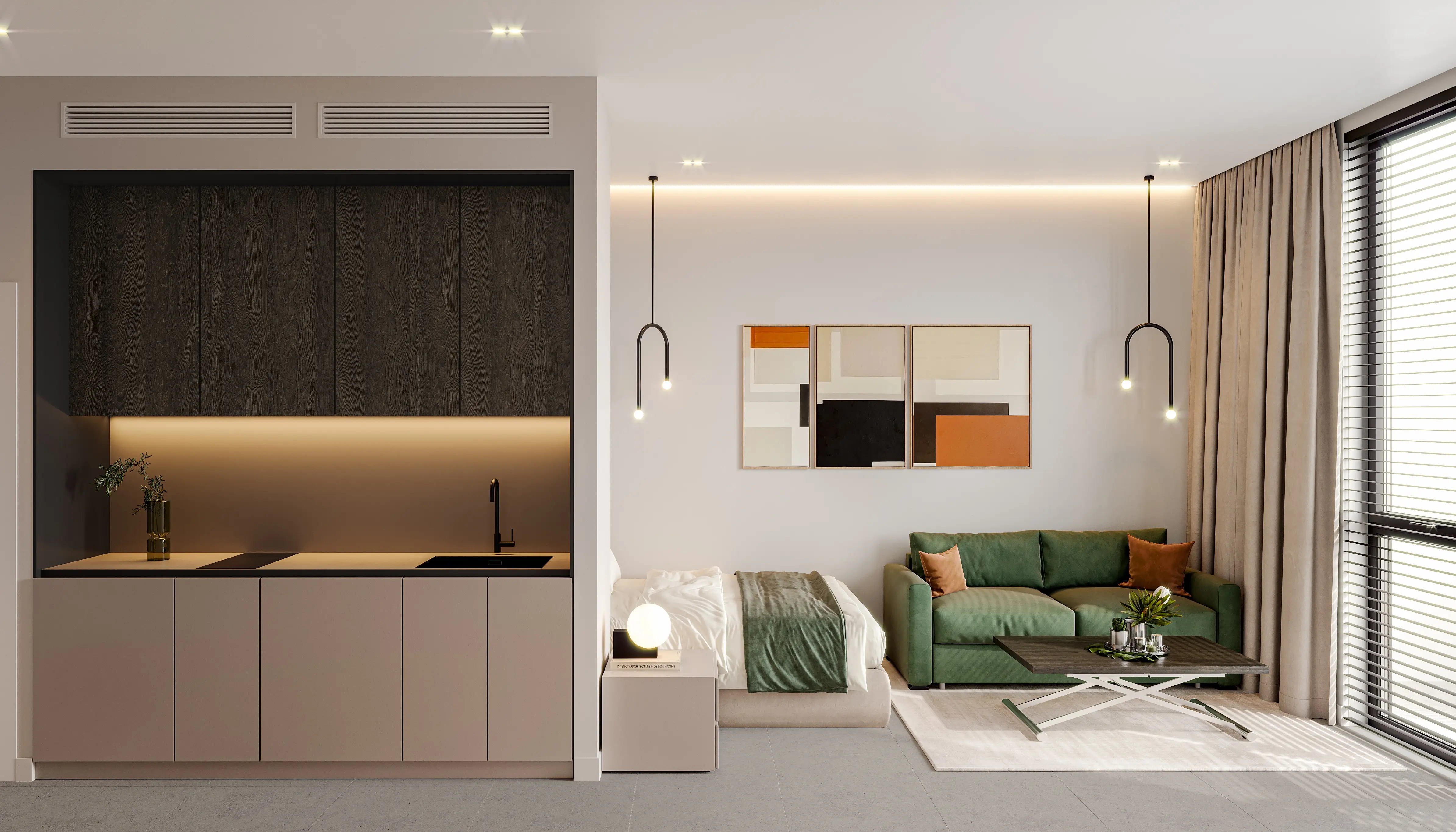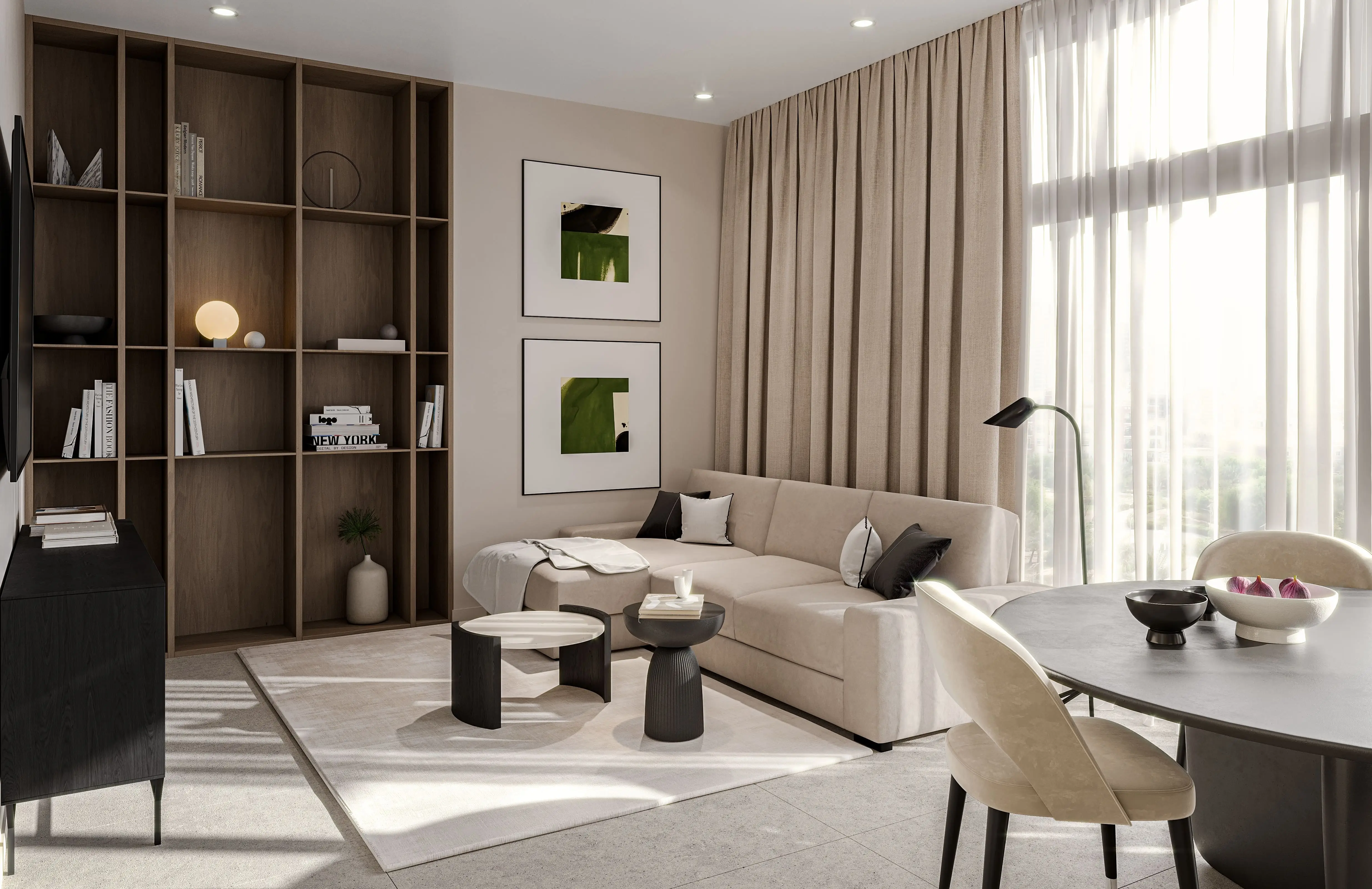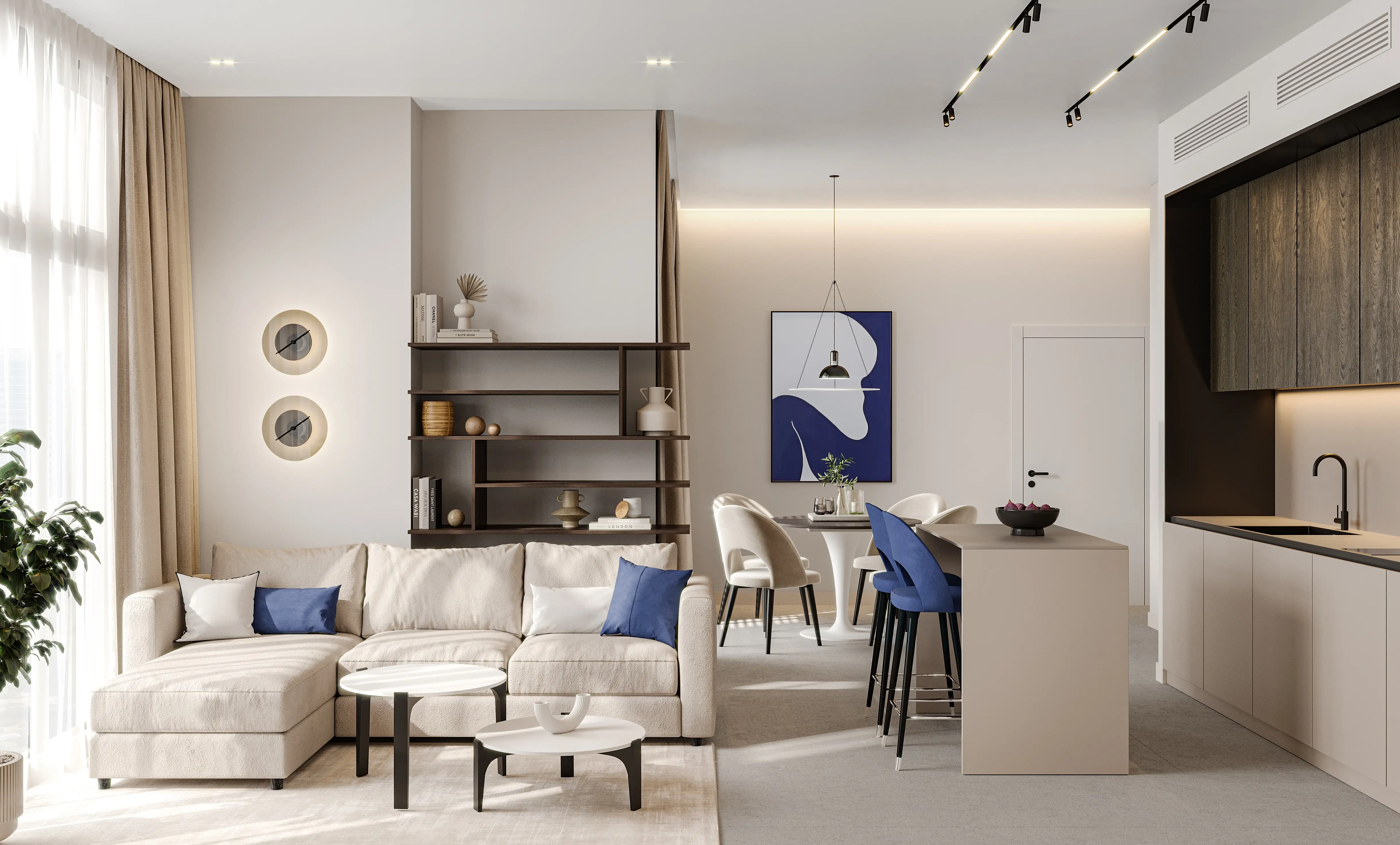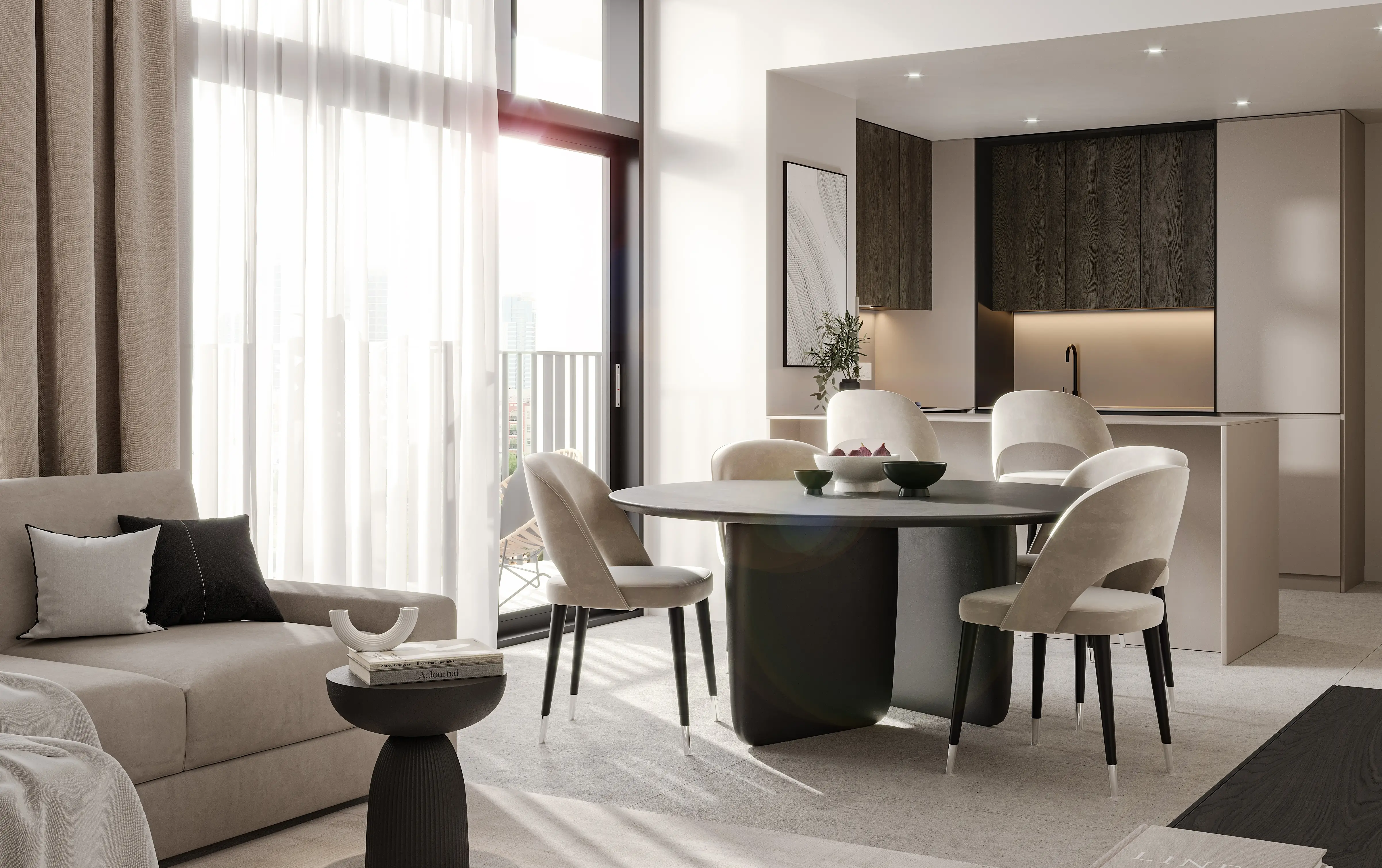 The development offers 1-, 2-, and 3-bedroom apartments. Spacious layouts, high ceilings, and panoramic windows fill the interiors with natural light. The apartments feature calm color palettes, Italian furniture, and finishes from leading European brands, emphasizing sophistication and contemporary style.