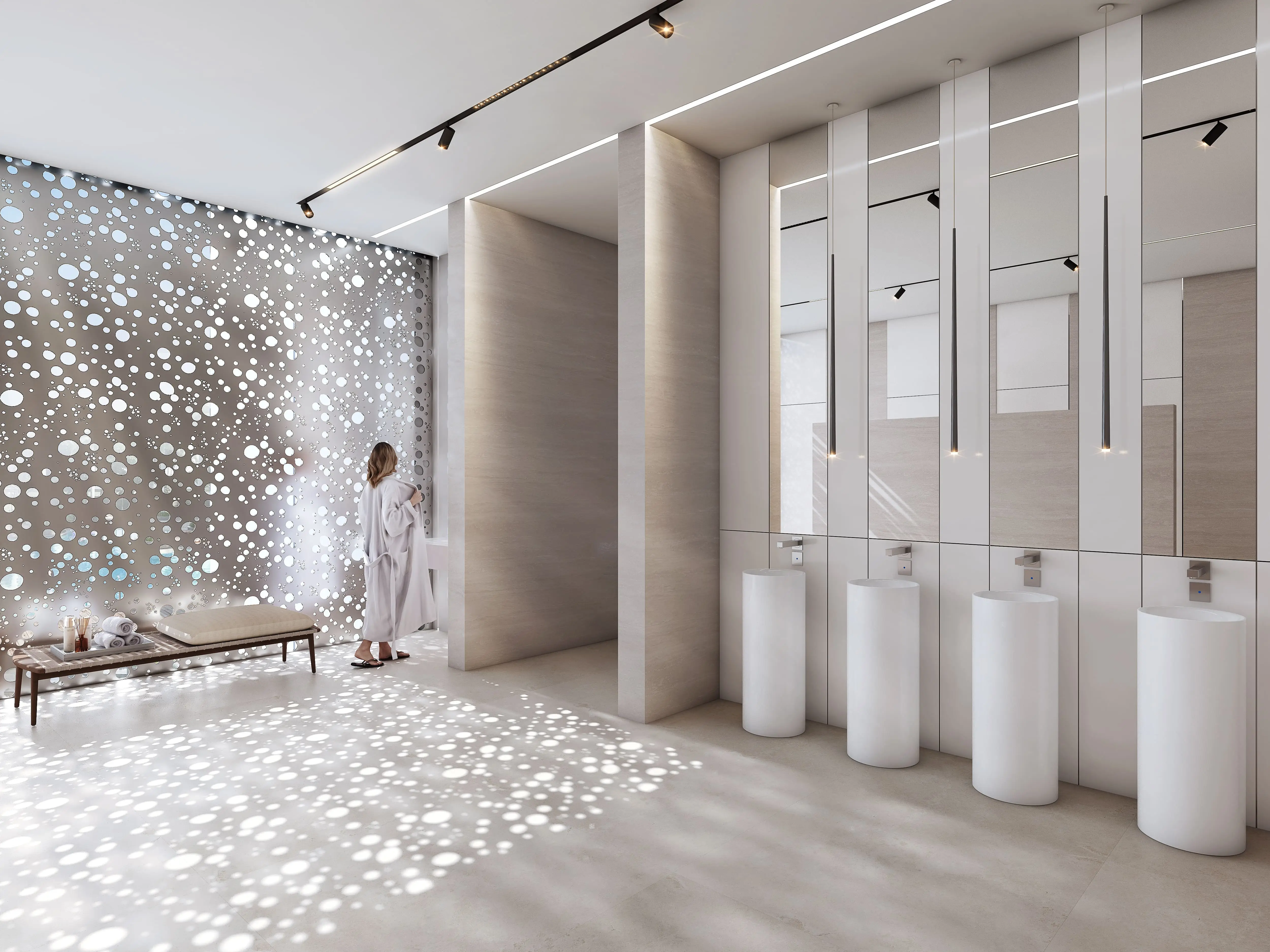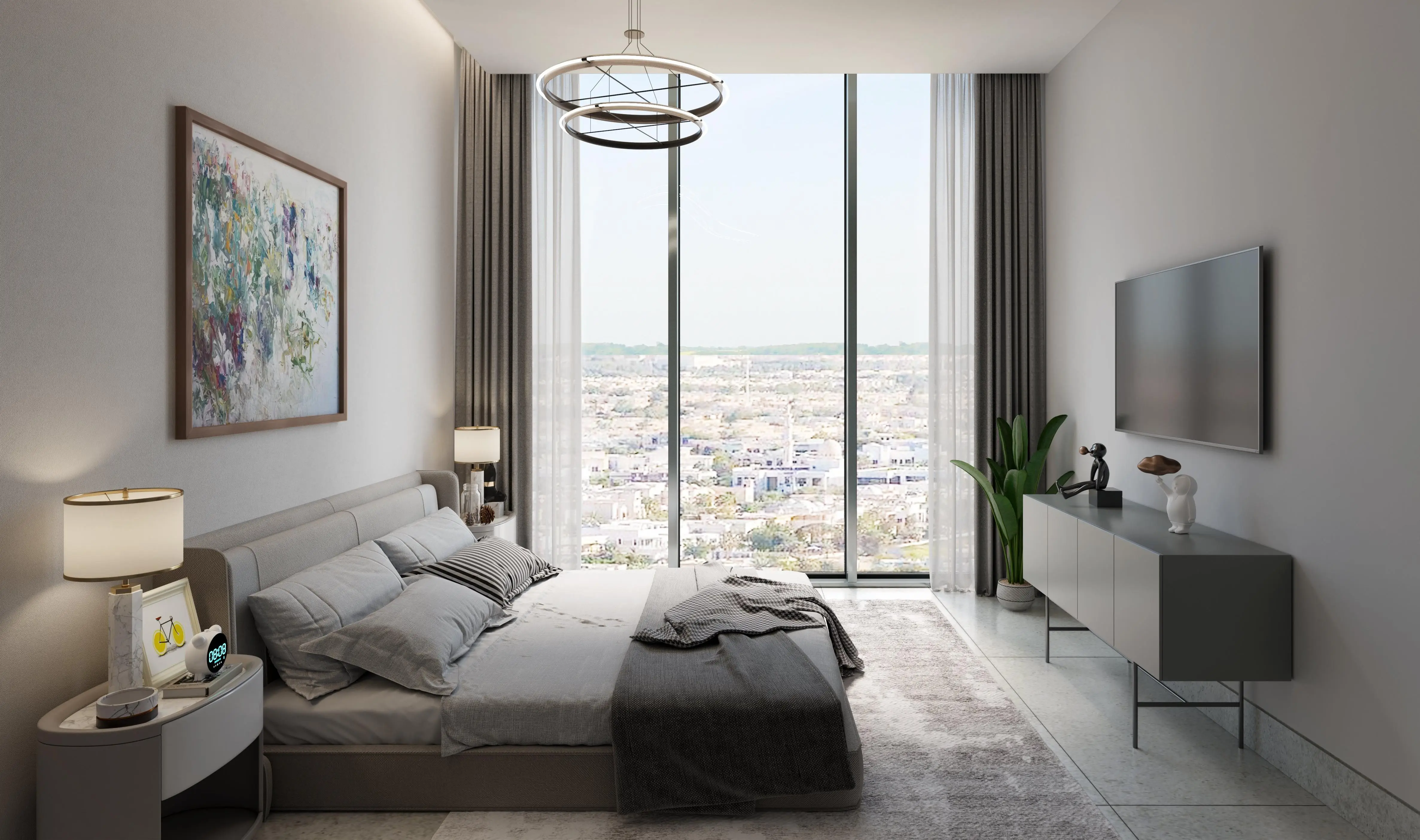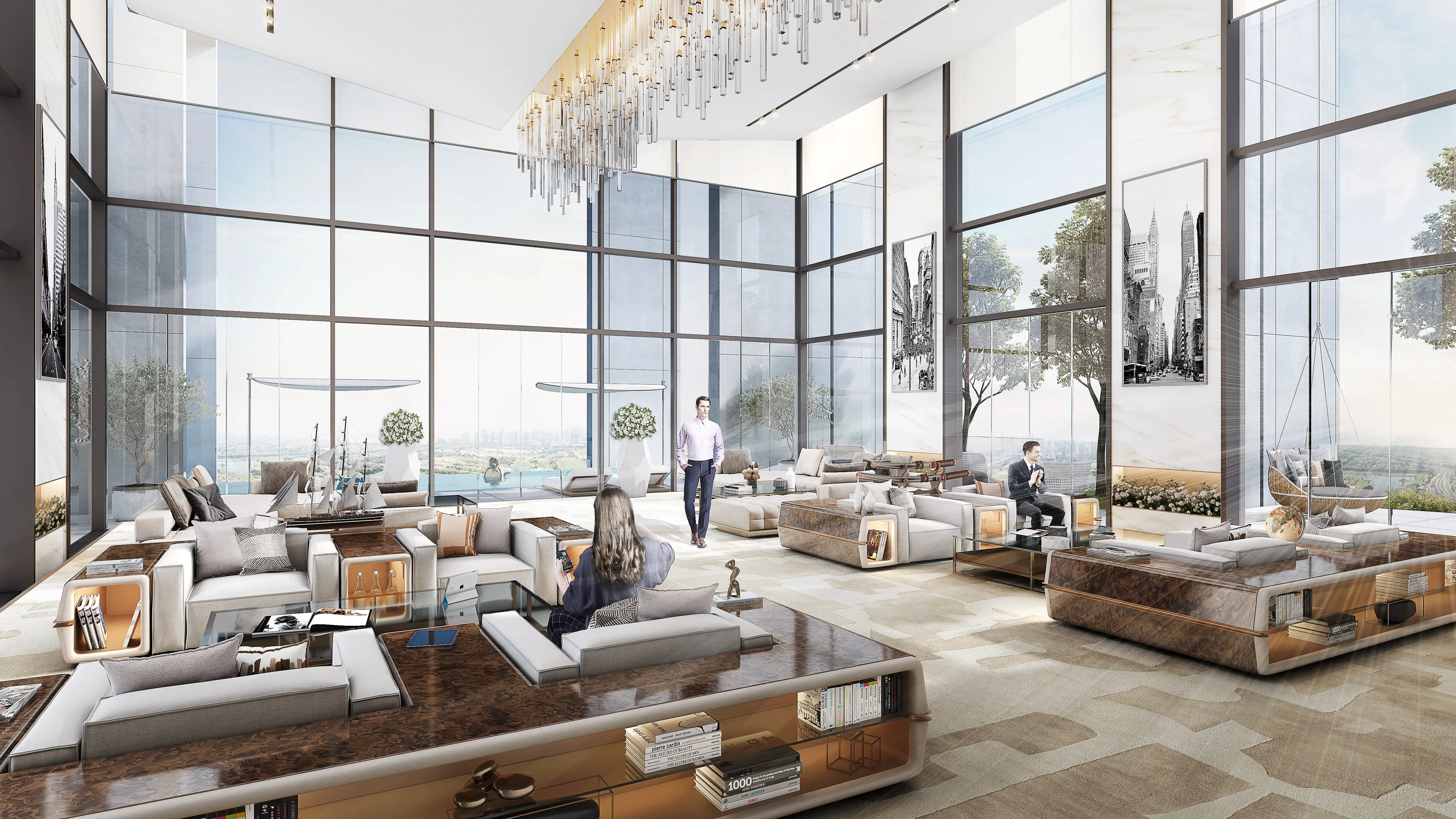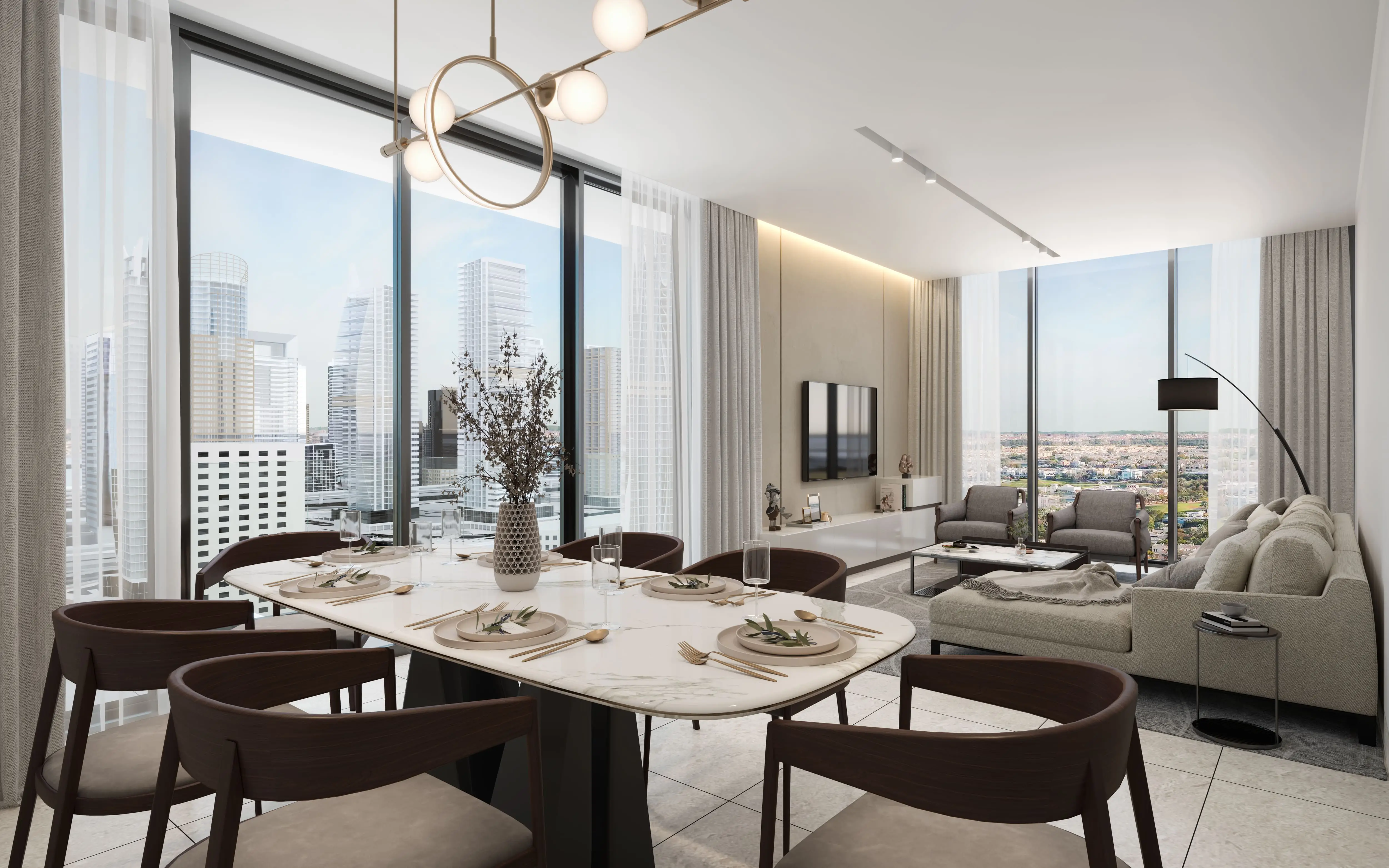 The complex offers sophisticated one-, two-, and three-bedroom apartments. Floor-to-ceiling windows provide breathtaking views of Dubai: the northern and western sides overlook Dubai Marina, JBR Beach, and Palm Jumeirah; the eastern side faces the golf courses of Emirates Hills; while the southern side offers views of lakes, parks, and villas.