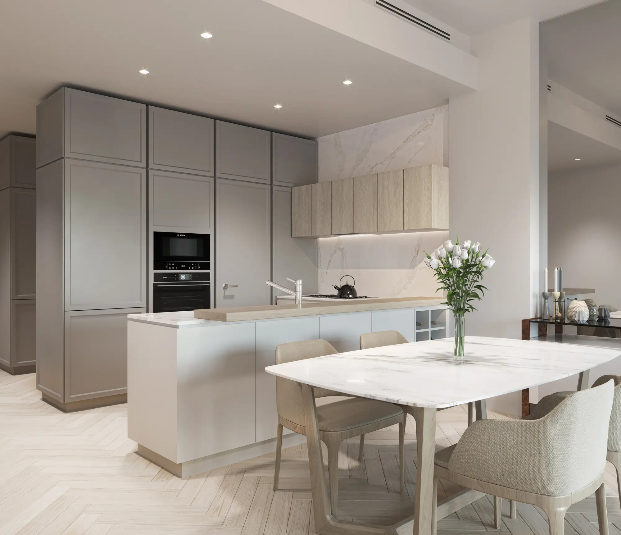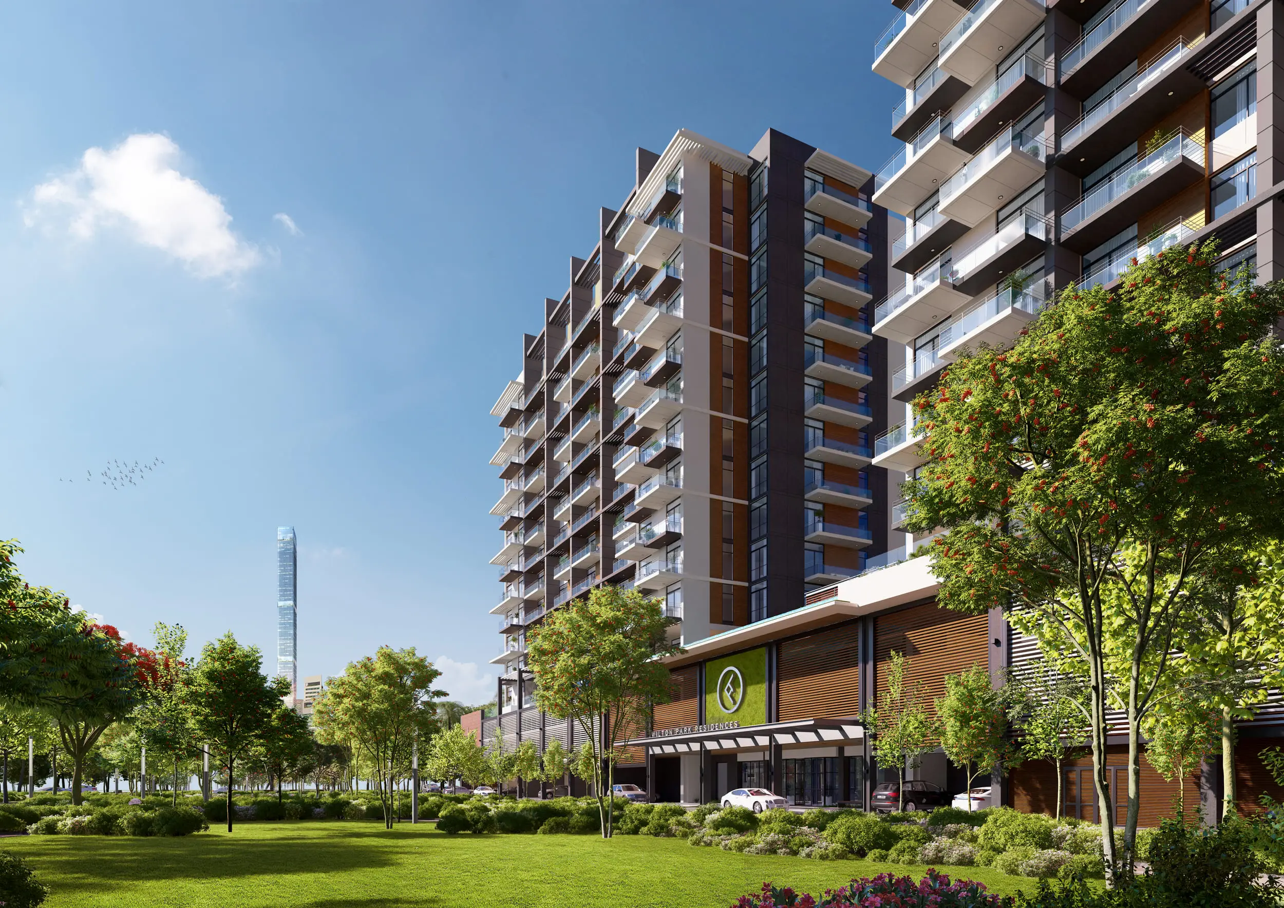 Wilton Park Residences ' architectural design is inspired by contemporary London aesthetics. The facades, tinted in soft gray tones, contrast harmoniously with the surrounding greenery of the parks, creating a sense of refined elegance.